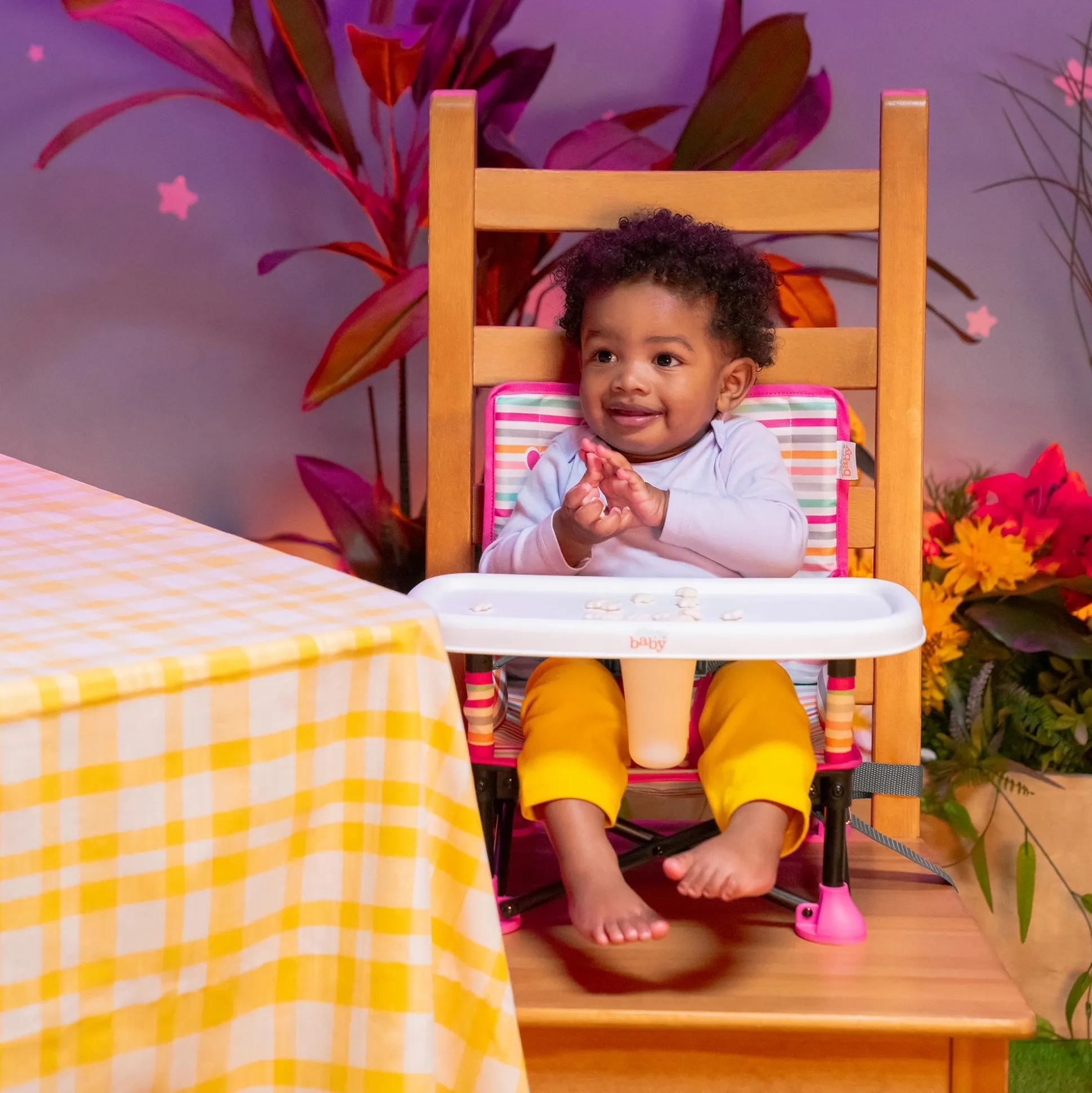 Dank der mitgelieferten Gurte lässt sich die Sitzerhöhung sicher an einem Erwachsenenstuhl befestigen und verwandelt sich im Handumdrehen in einen tragbaren Hochstuhl. Das BPA-freie, abnehmbare Tablett ermöglicht eine einfache Reinigung und sorgt dafür, dass dein Kind jederzeit hygienisch essen kann.