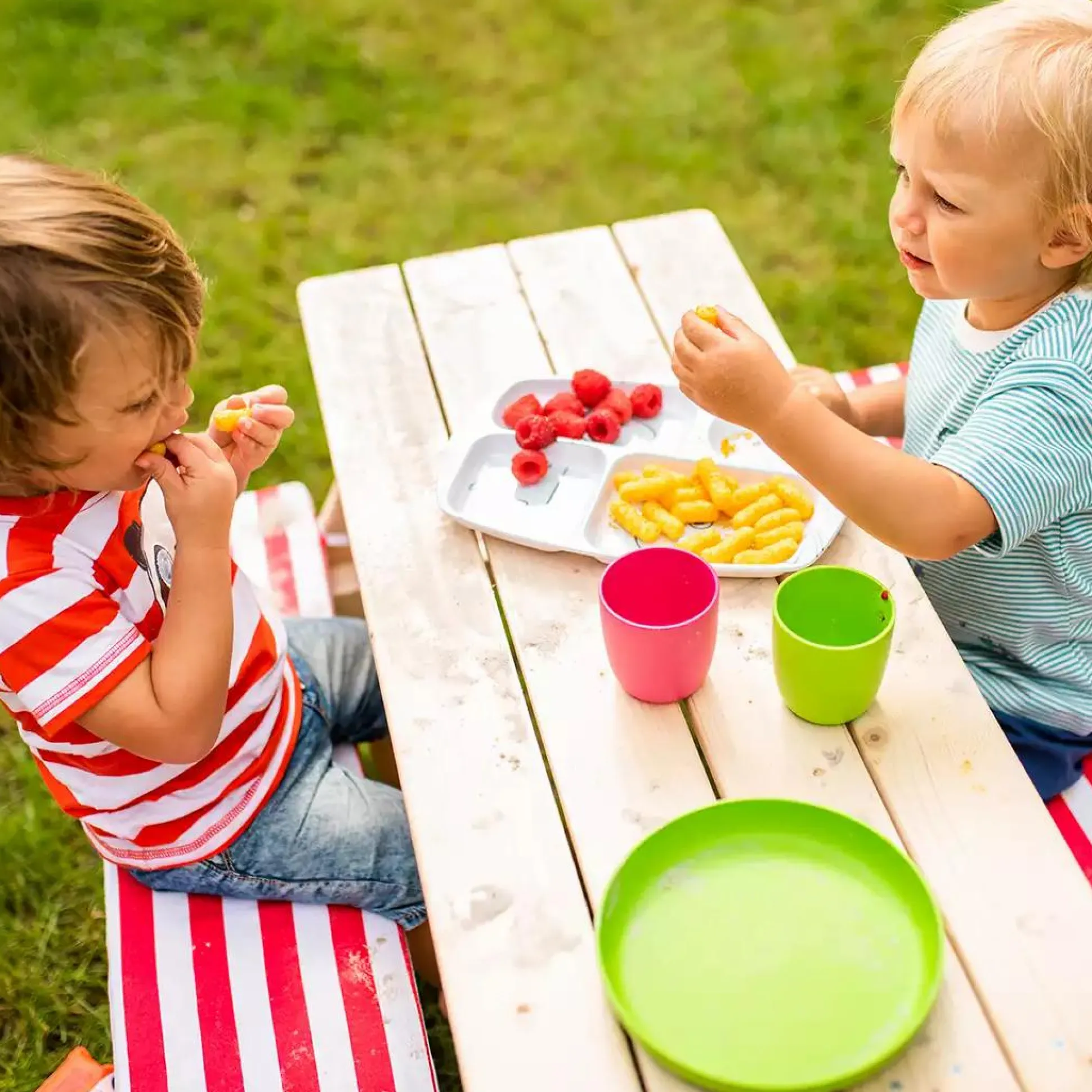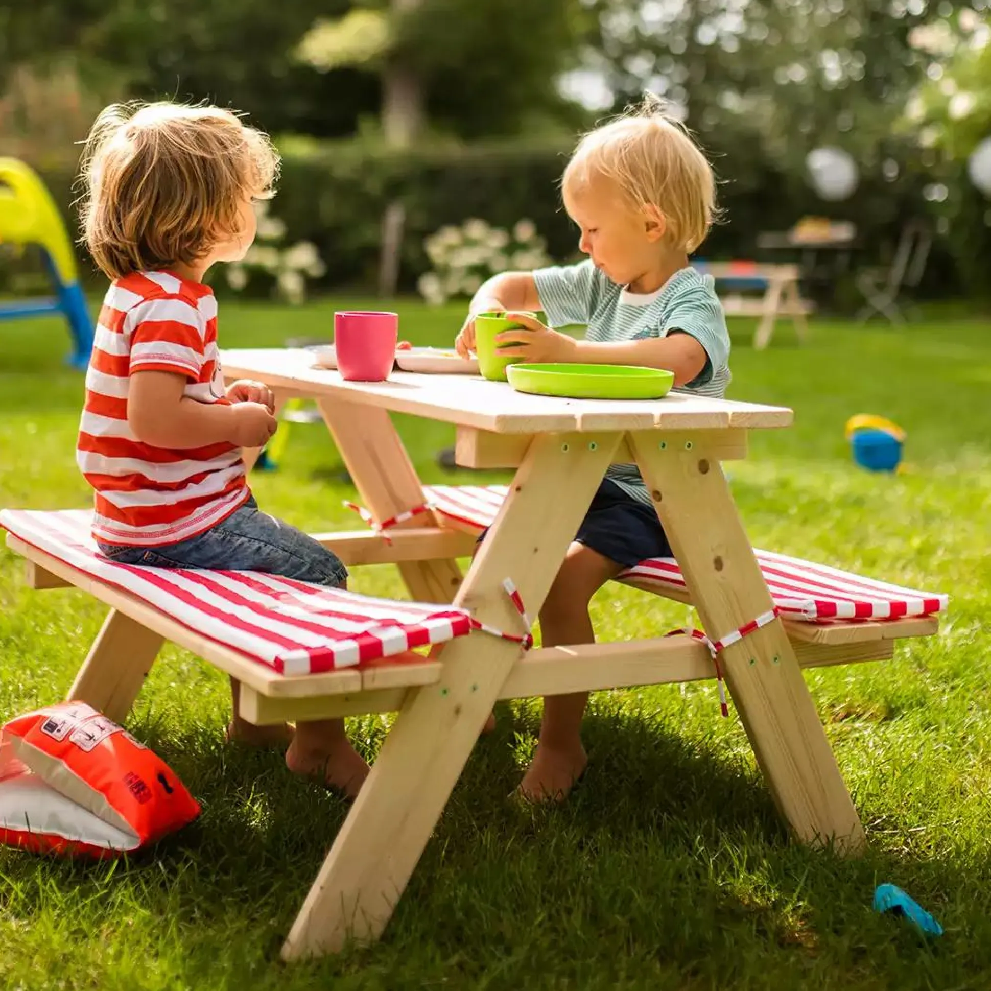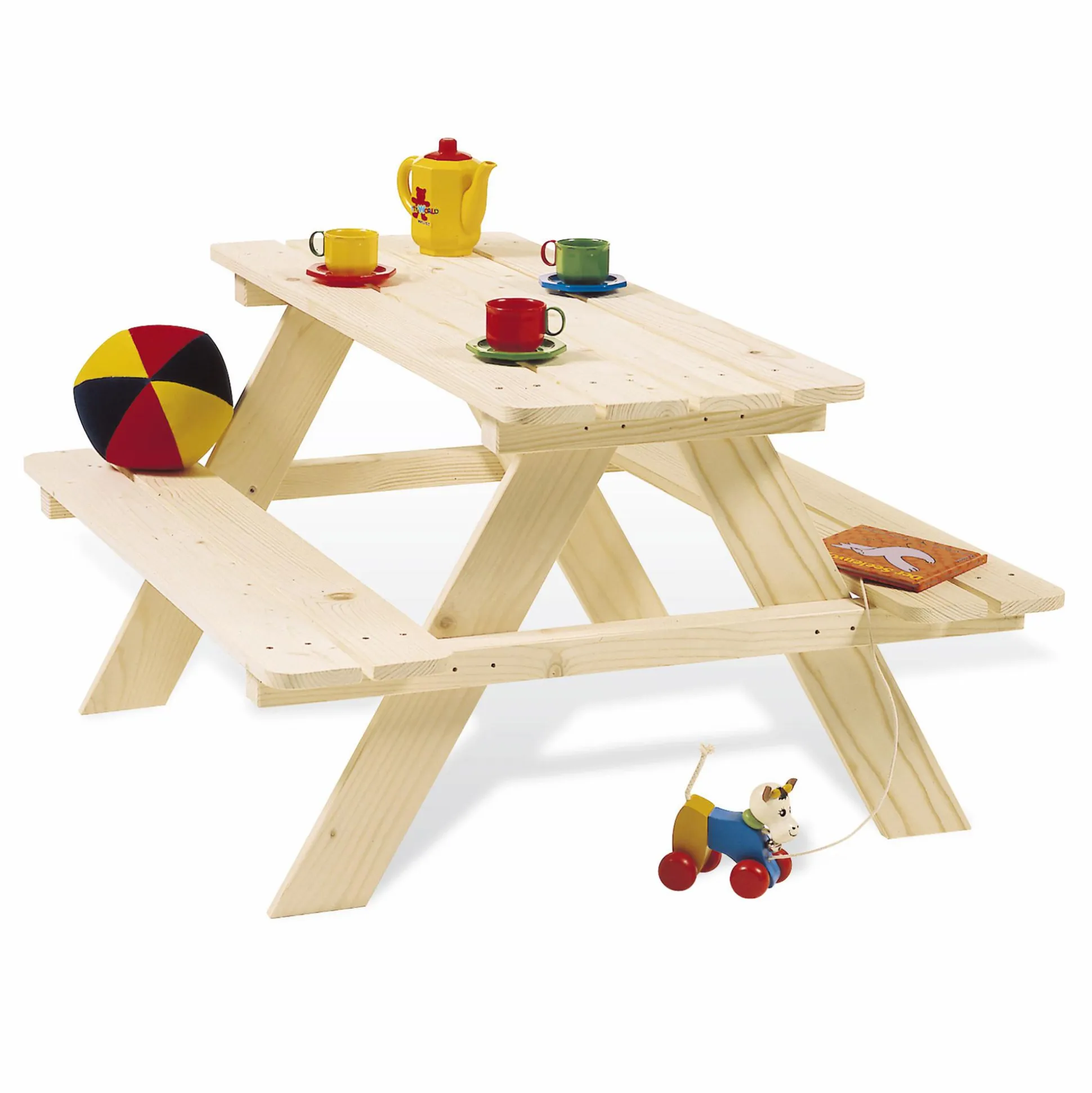 Die Sitzgruppe Nicki natur besteht aus zwei Bänken und einem Tisch. Sie ist für Kinder ab ca. 2 Jahren geeignet und bietet einen gemütlichen Platz für die Kleinen. Auf ihr haben vier Kinder Platz zum gemeinsamen Essen, Basteln oder Spielen im Garten auf der Terrasse oder drinnen im Haus. So wird beispielsweise der gemeinsame Grillabend im Sommer ein tolles Erlebnis für deine Kinder.