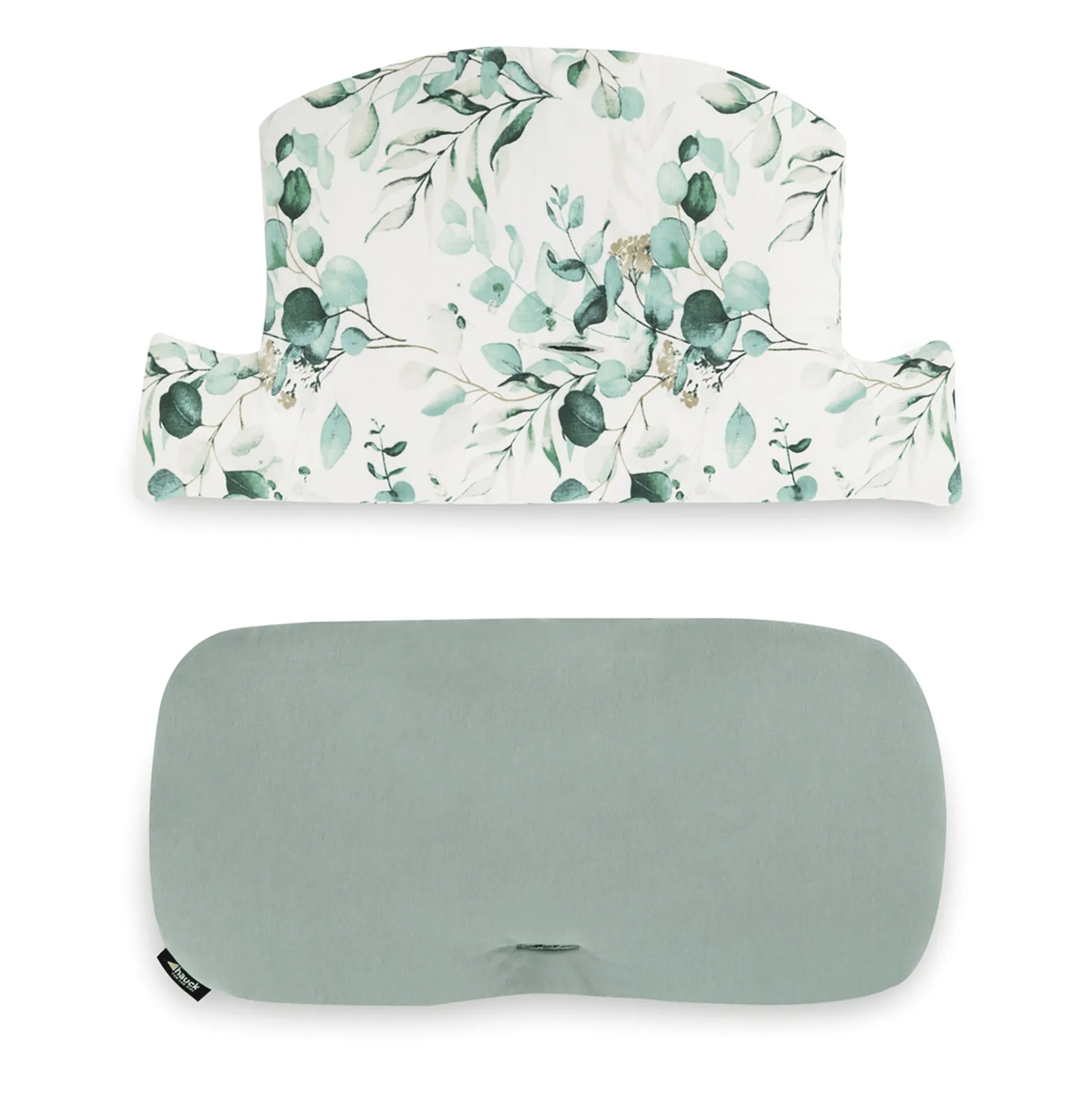 Das breite Rückenkissen bedeckt den Stuhlrücken und wird doppelt um die Rückenlehne gelegt, sodass sie gut gepolstert ist. So wird das Sitzen im Hochstuhl angenehm und sicher.