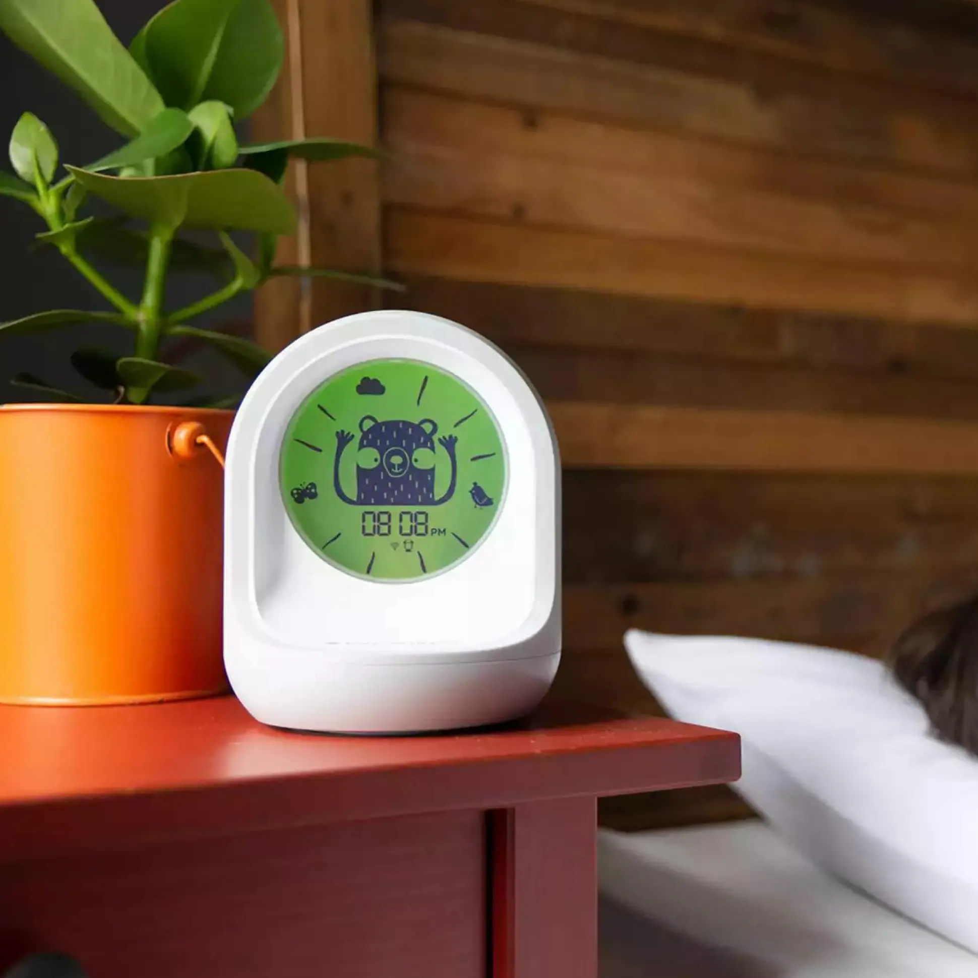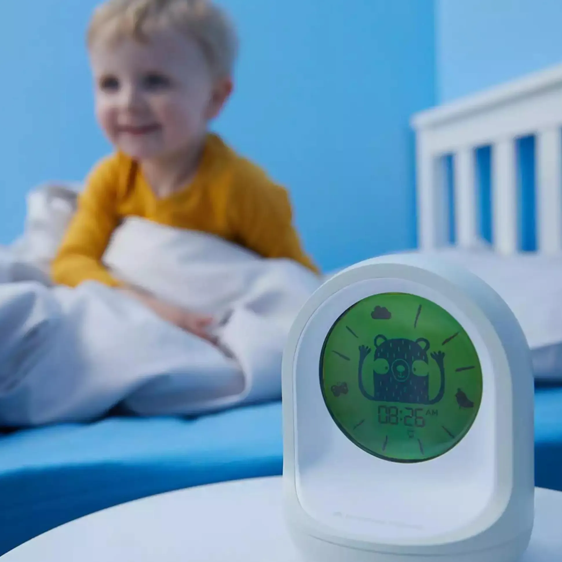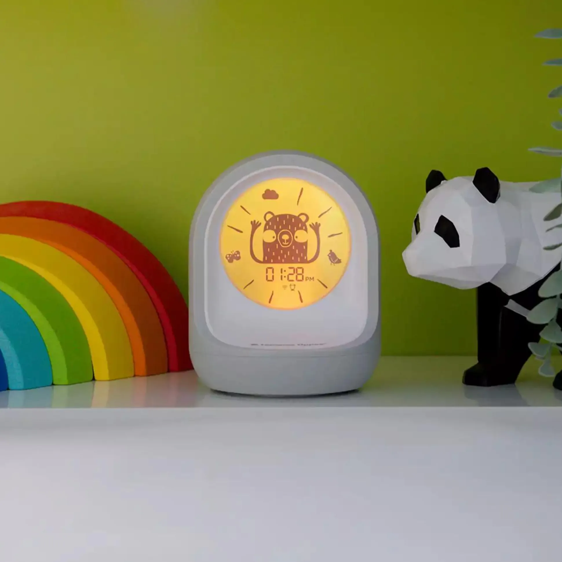 Die Uhr zeigt die Zeit in digitalem Format an und veranschaulicht mithilfe von Farben und Symbolen, wie die Zeit vergeht. Auch wenn die Kleinen noch nicht wissen, wie spät es ist, lernen sie sehr schnell, wann es Zeit zum Schlafen ist und wann sie wieder aufstehen und Spielen dürfen.