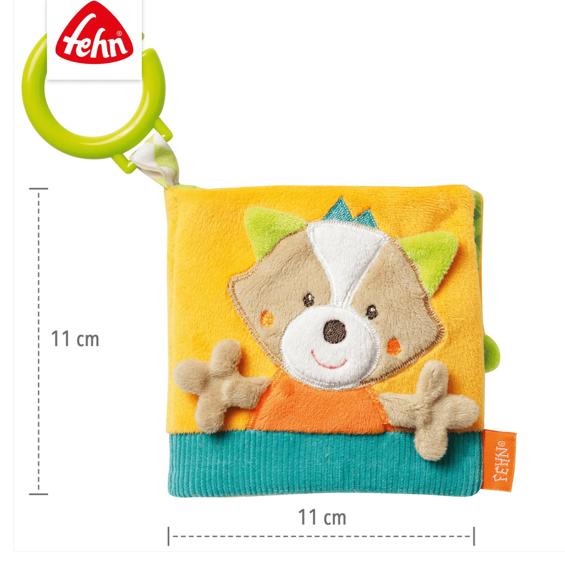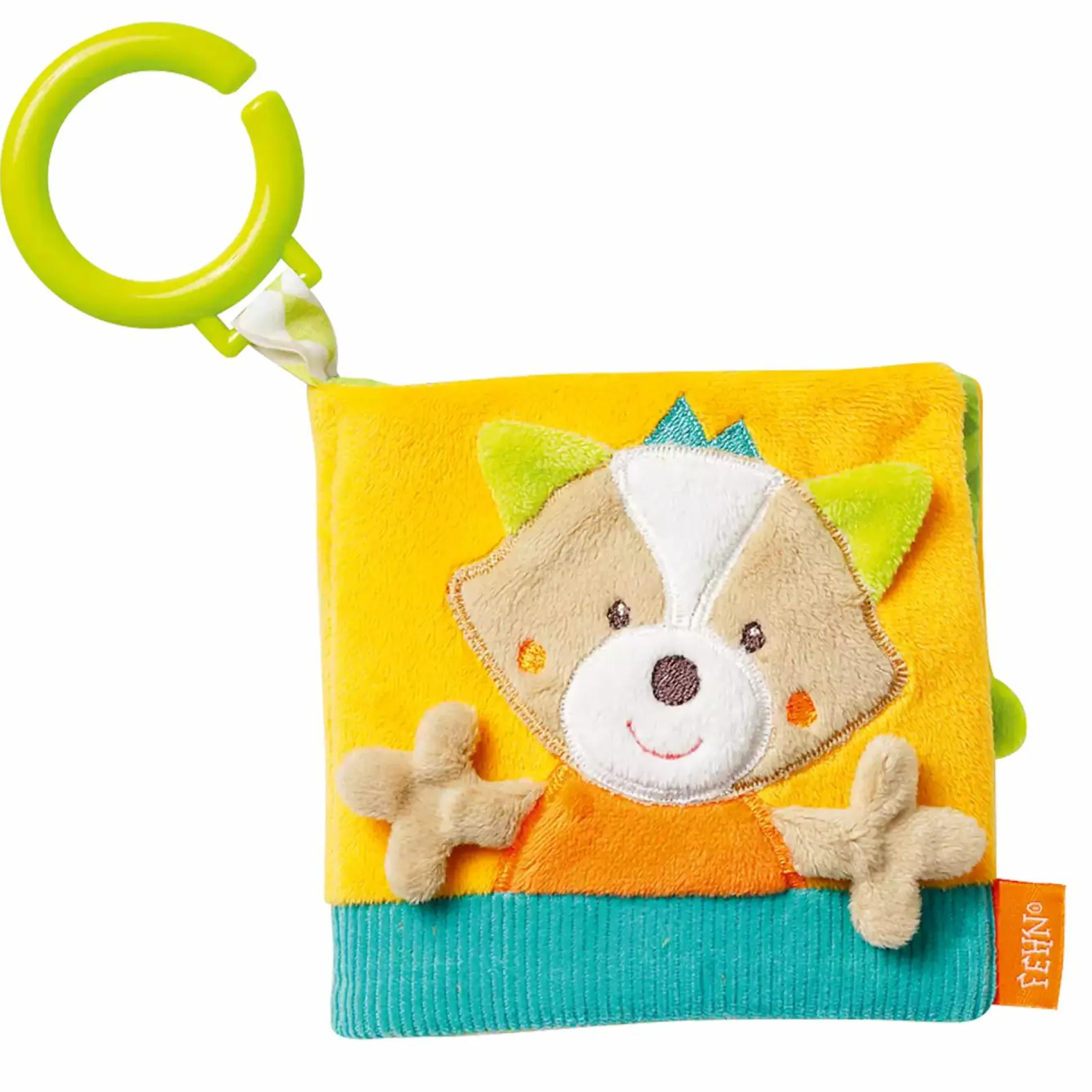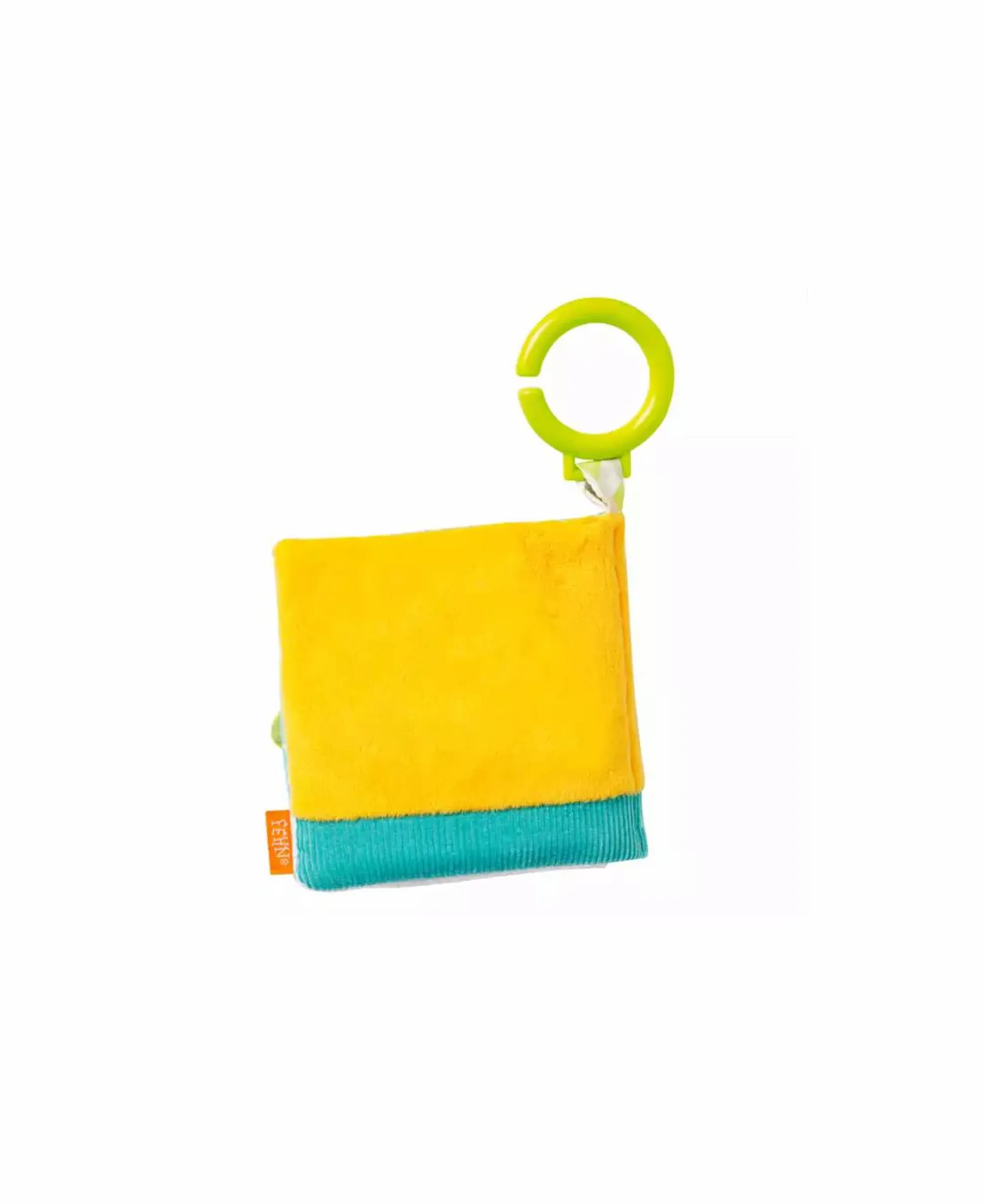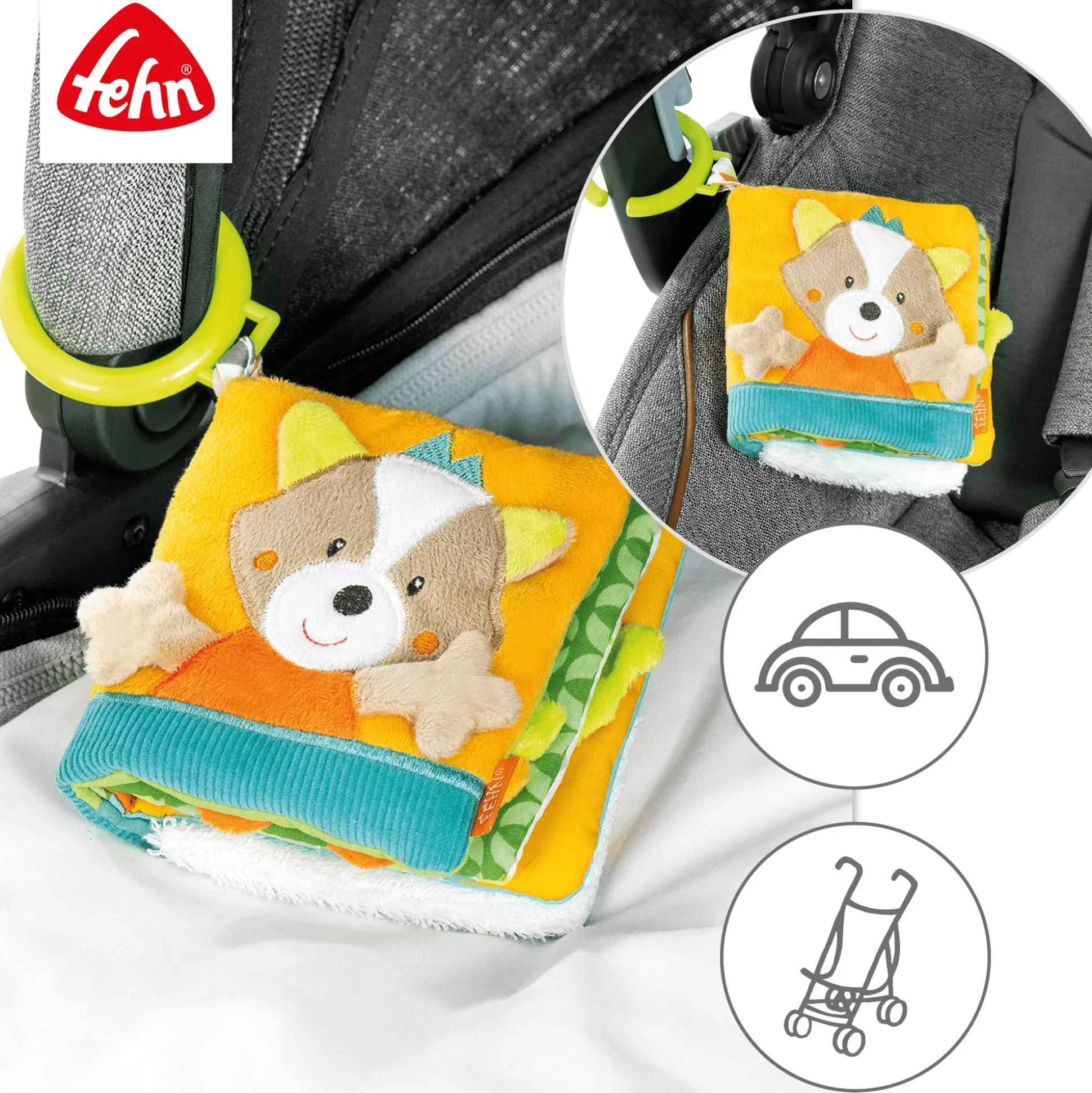 - mit dem grünen C-Ring kann das Bilderbuch ganz leicht und sicher an Babyschale und Kinderwagen befestigt werden