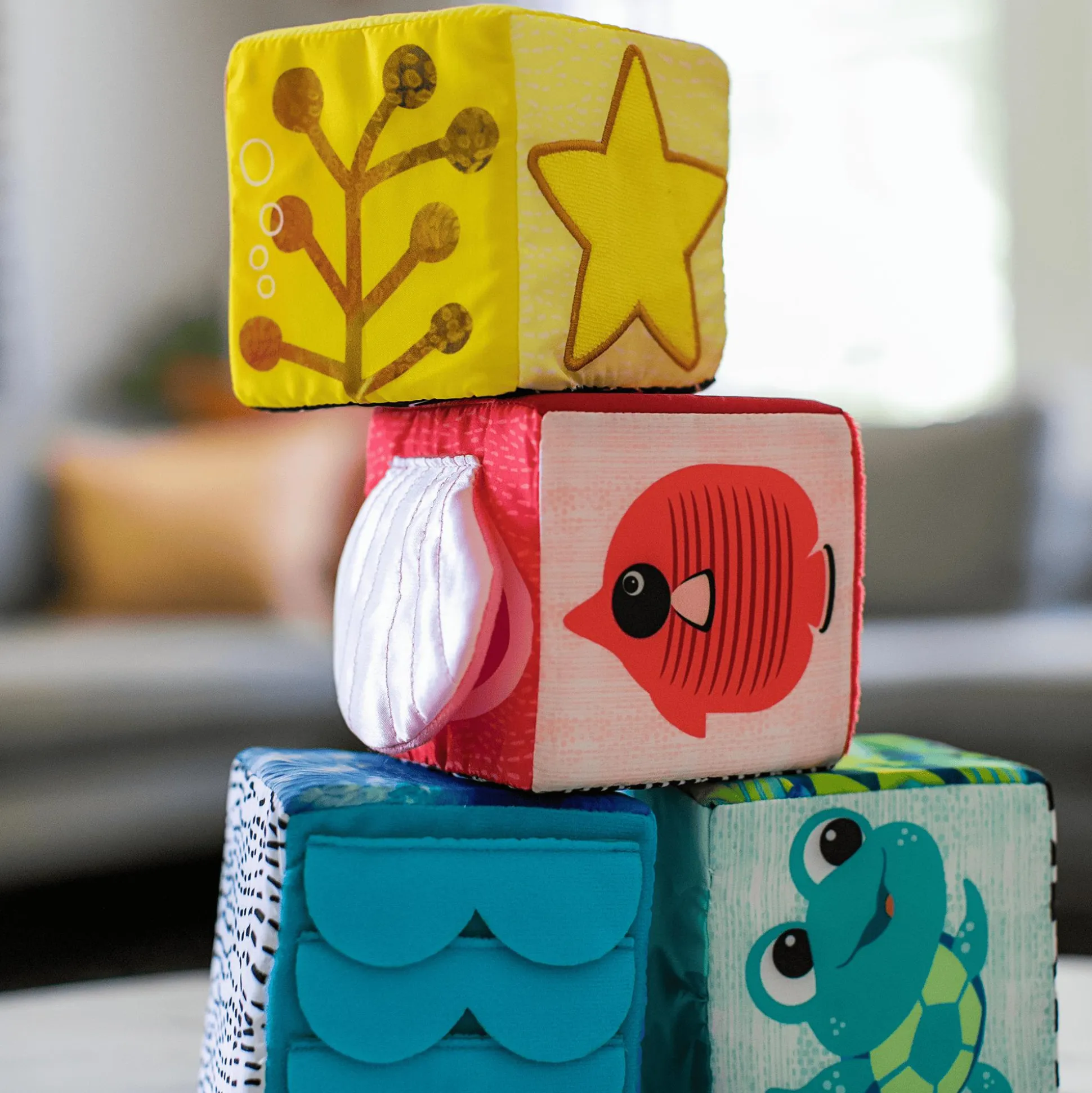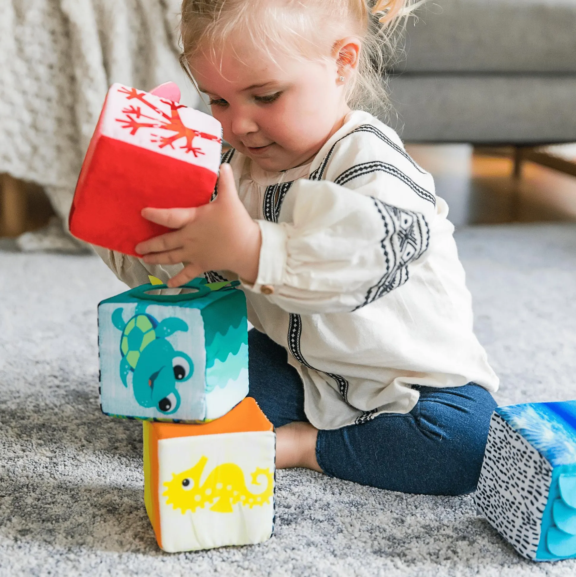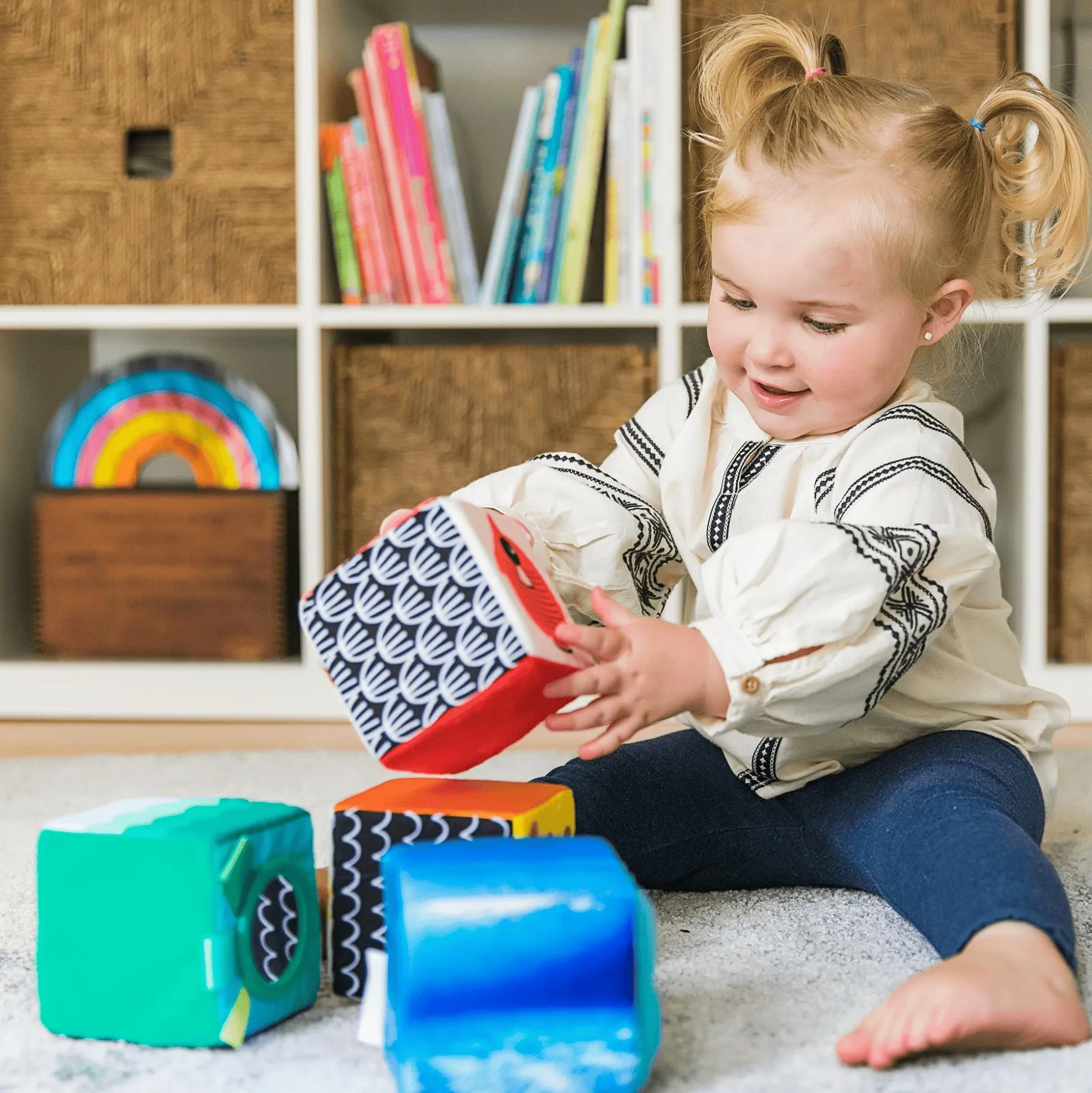 Diese Soft Würfel von KIDS II sind für kleine Hände zum Drücken, Stapeln, Werfen und Rollen gemacht. Jeder bunte Block ist ein leistungsstarkes Entdeckungswerkzeug mit multisensorischer Aktivität, das dein Baby lieben wird.