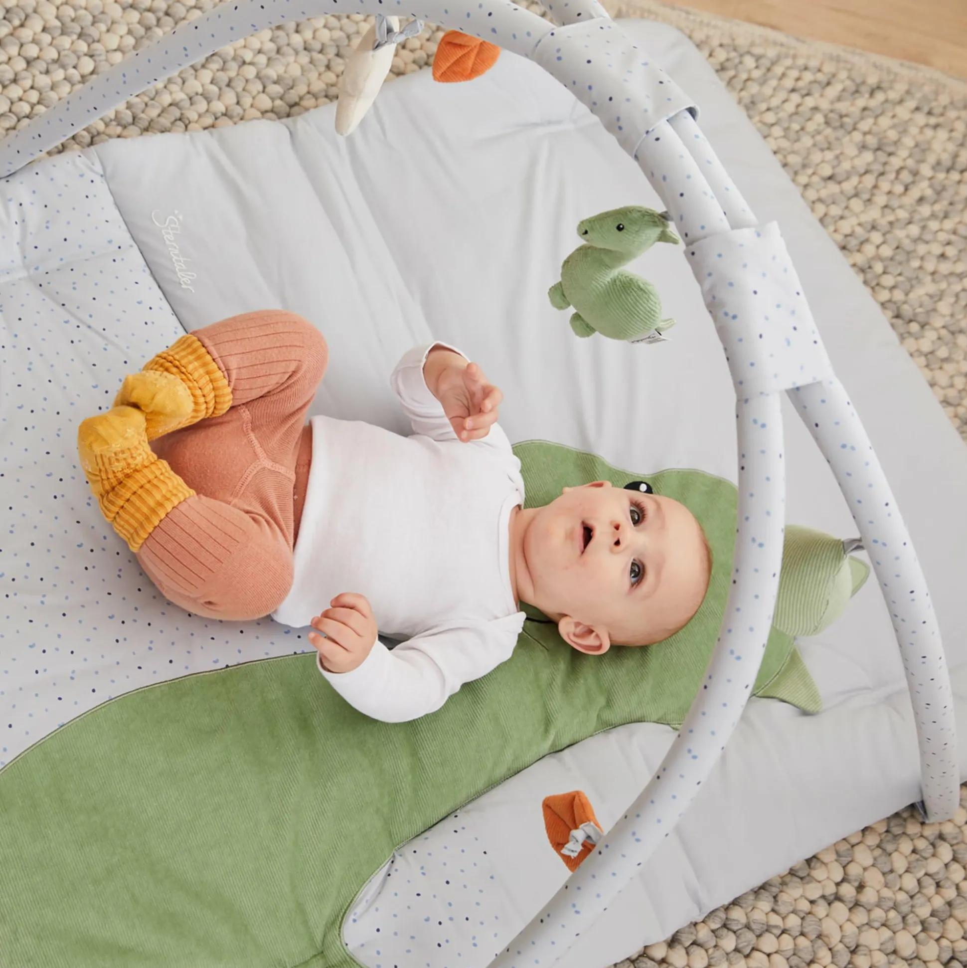 Der Spielbogen Dino Rexi von Sterntaler bringt spielerische Freude in den Alltag deines Babys und lädt zum Entdecken und Staunen ein. Die liebevoll gestaltete Spieldecke mit großer Dino-Stickerei aus samtigem Velour und bedrucktem Baumwoll-Mischgewebe zieht die Aufmerksamkeit deines kleinen Lieblings sofort auf sich.