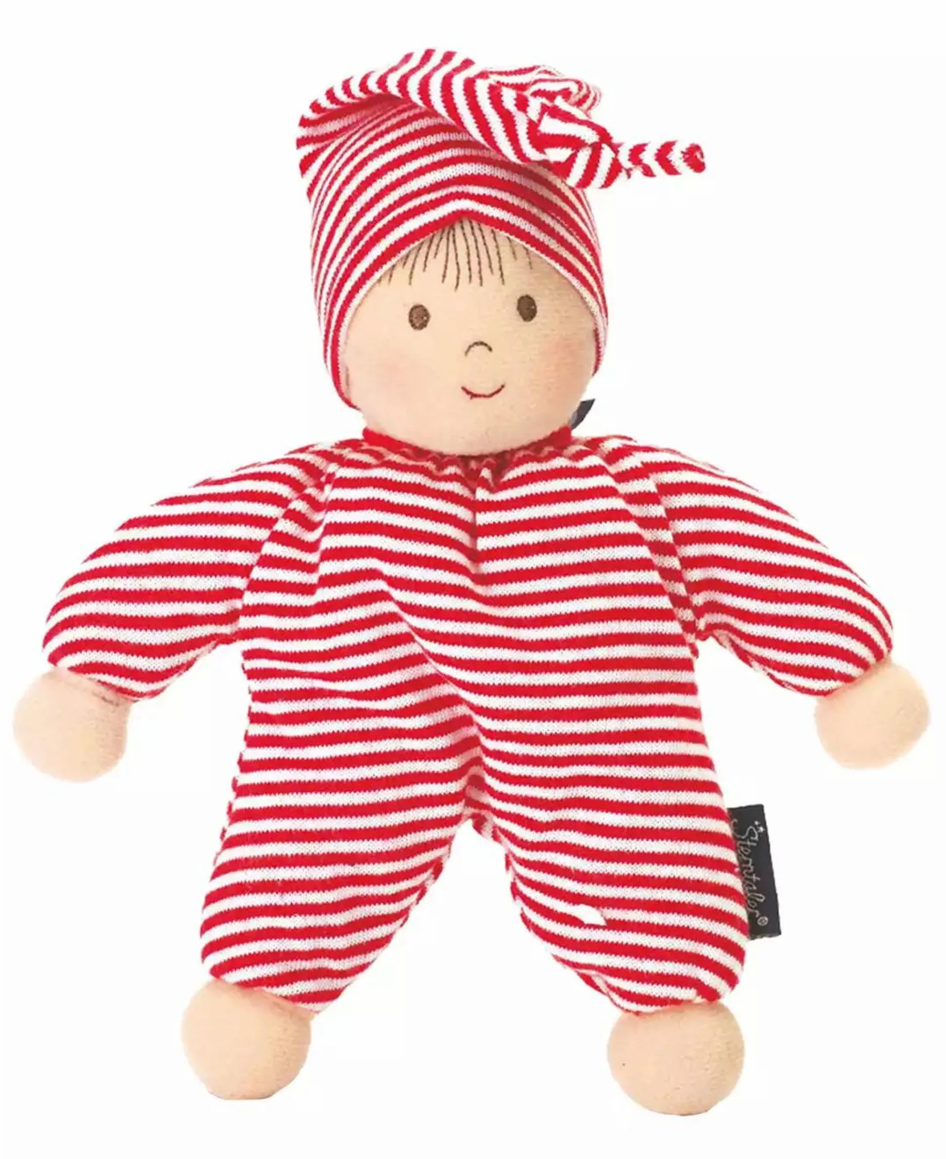Die Spielpuppe Heiko aus Jersey eignet sich optimal als treuer Begleiter für dein Kind. Sie ist mit einem süßen Gesicht bestickt und mit einer Rassel ausgestattet. Eine gestreifte Zipfelmütze und ein passender Anzug im gleichen Stoff ziert die kleine Puppe.