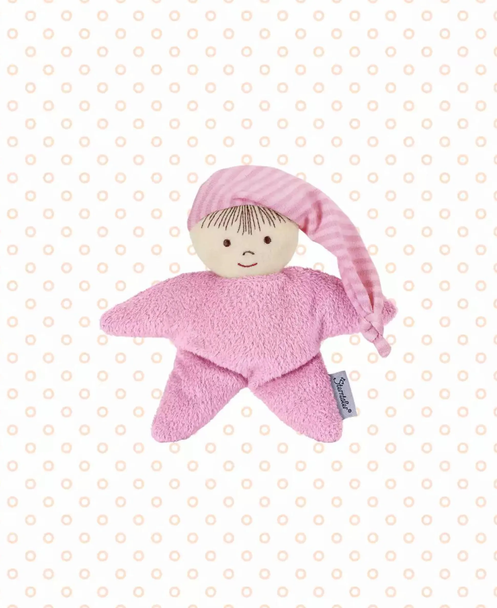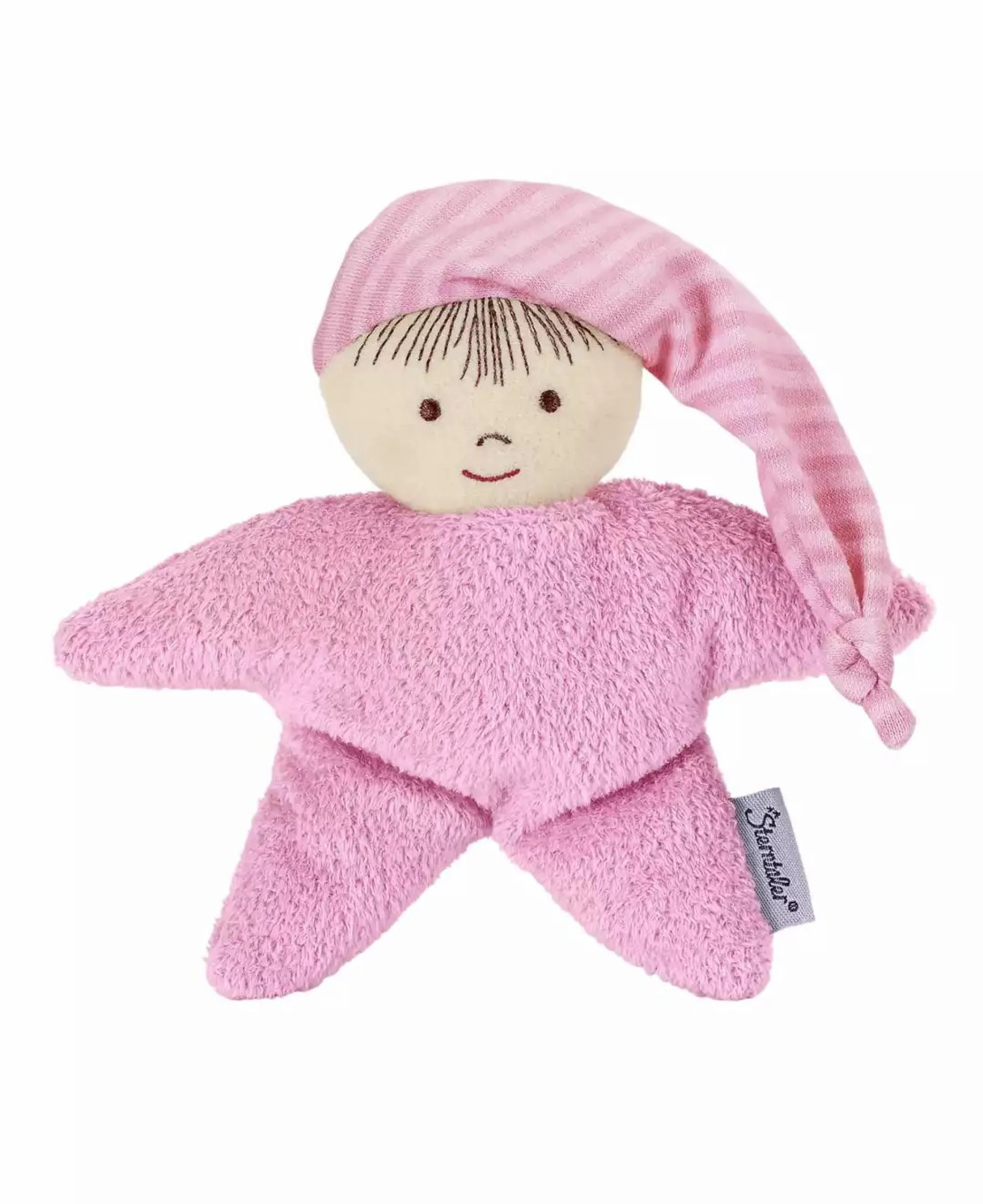 Die niedliche Spielpuppe aus rosa Flauschstoff mit gesticktem Gesicht und einer Mütze aus Ringeljersey lädt zum kuscheln und schmusen ein. Die integrierte Rassel fördert die Motorik und den Spaß am spielen .