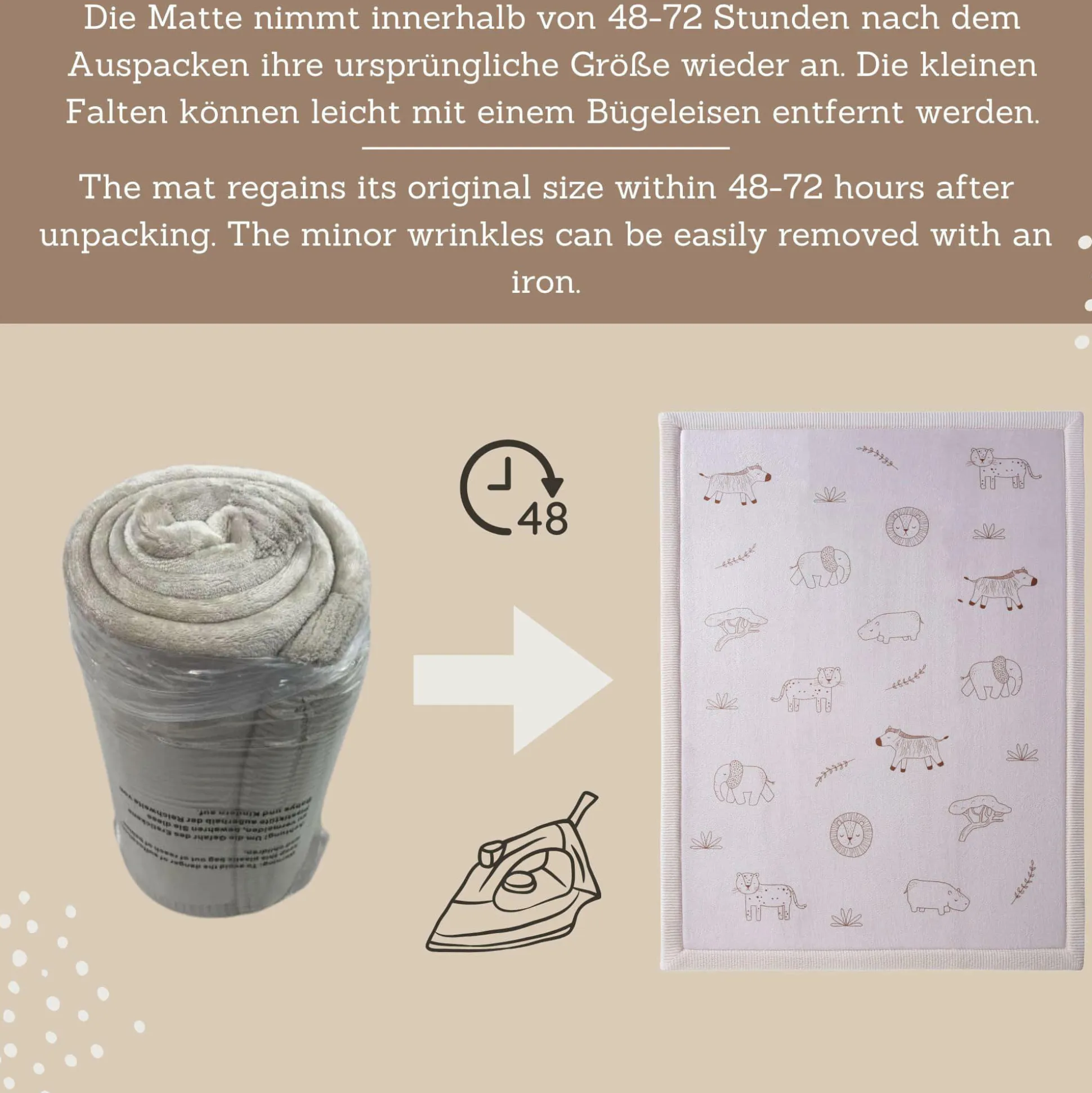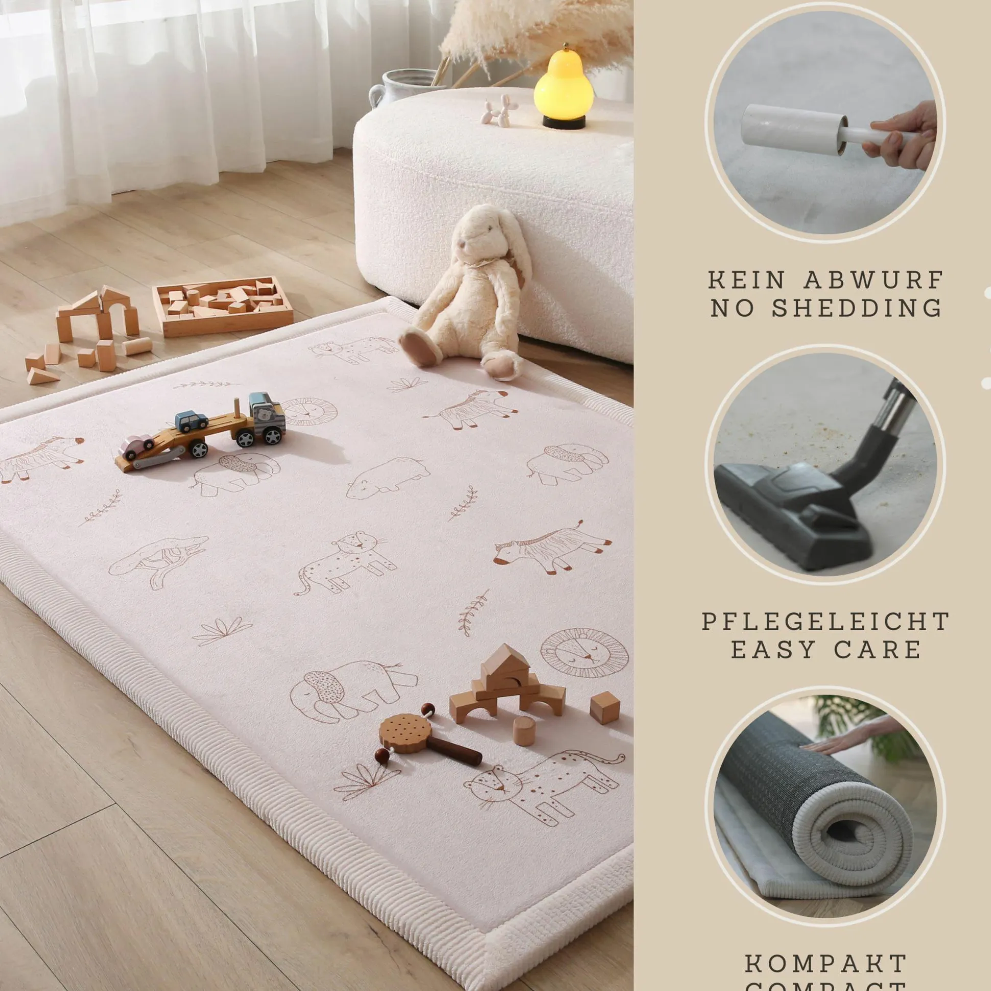 - besteht aus drei Schichten: Korallensamt für besonders sanften Hautkontakt, hochdichter Memory-Schaum für bequemes Spielen und Krabbeln, rutschfeste Unterseite zum Schutz bei Stürzen