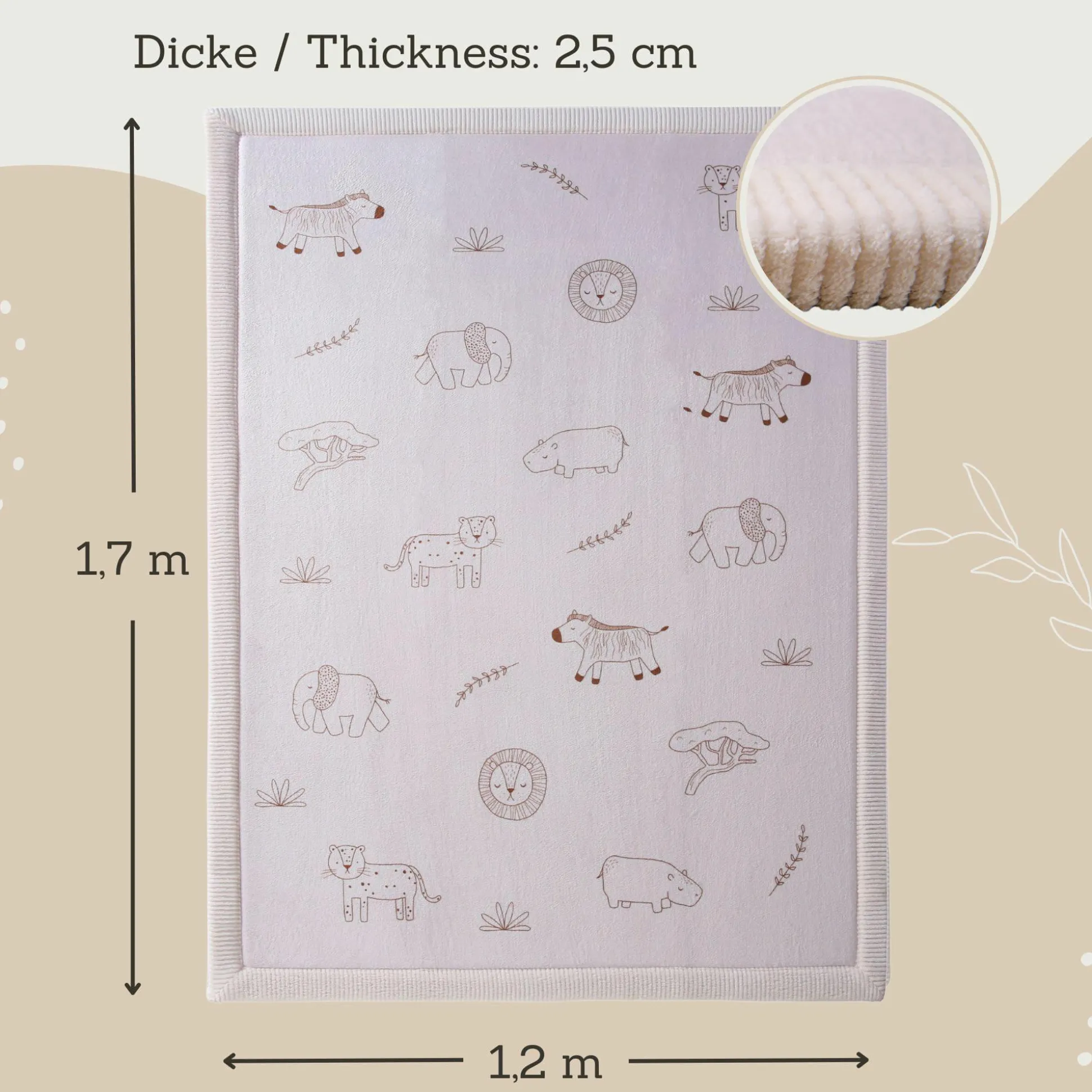 Er besteht aus drei durchdachten Schichten: Oben wartet flauschiger Korallensamt, der sich an zarte Babyhaut schmiegt. Darunter sorgt hochdichter Memory-Schaum für ein bequemes, federndes Spielgefühl. Und damit alles an Ort und Stelle bleibt, hat der Teppich eine rutschfeste Unterseite.