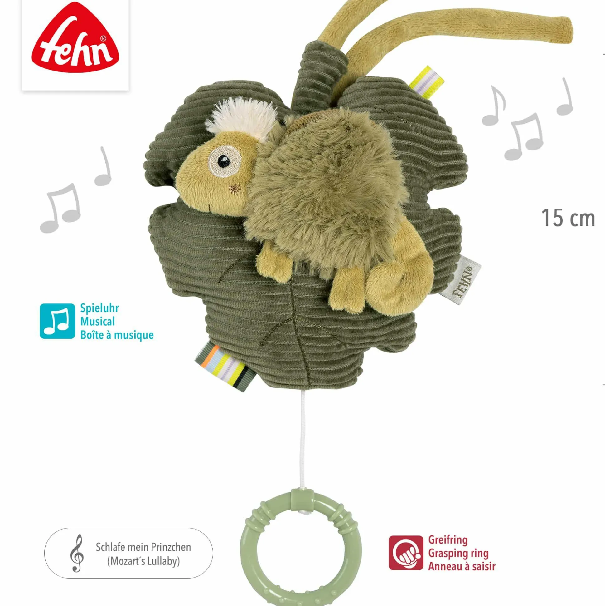 Das charmante Chamäleon in Oliv ist nicht nur ein hübscher Blickfang, sondern auch ein treuer Begleiter in den ersten Lebensmonaten. Durch das Lauschen der sanften Musik wird die auditive Wahrnehmung deines Babys spielerisch gefördert und die Sinne angeregt. So unterstützt die Spieluhr die Entwicklung wichtiger Fähigkeiten auf liebevolle Weise.