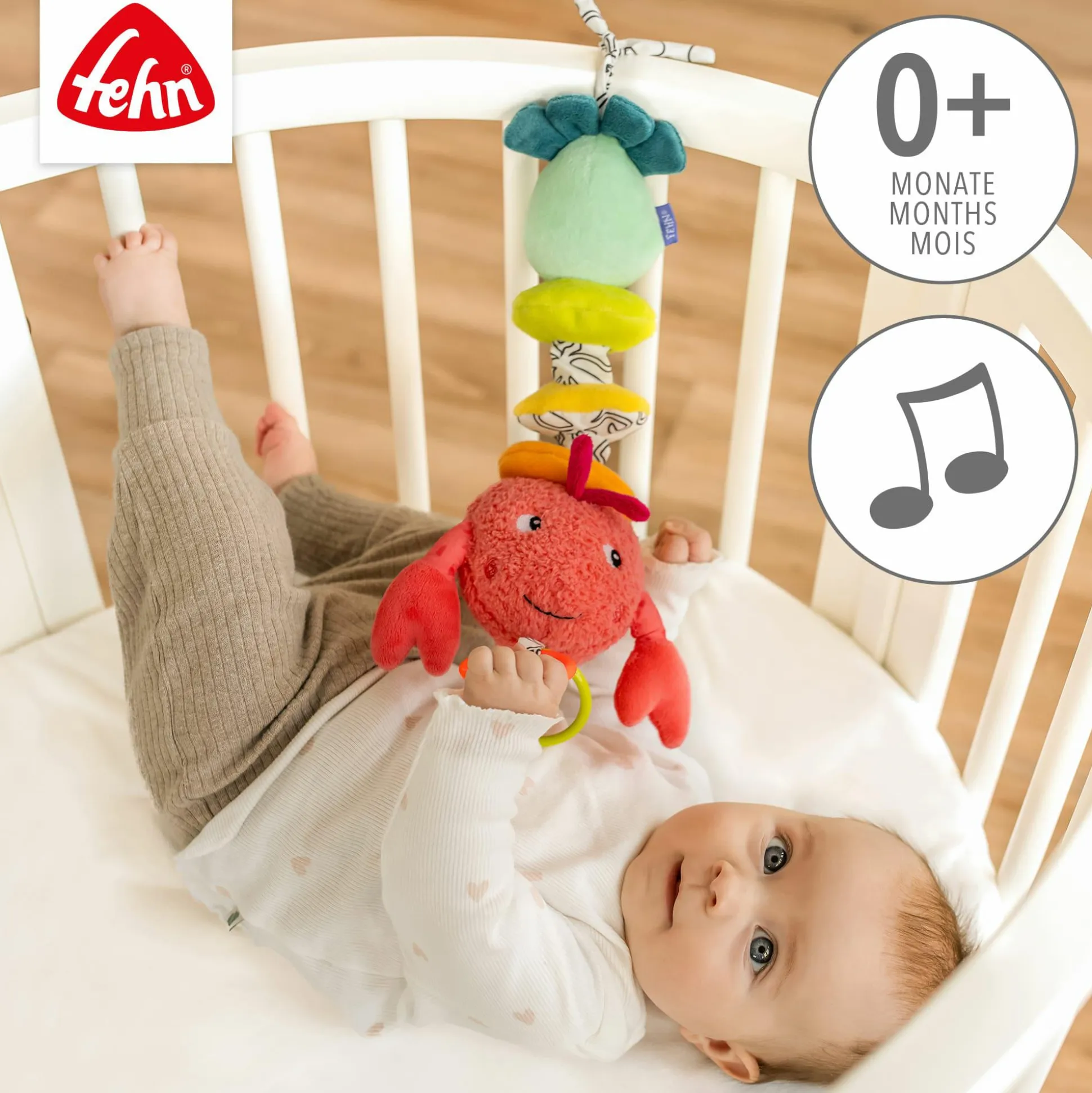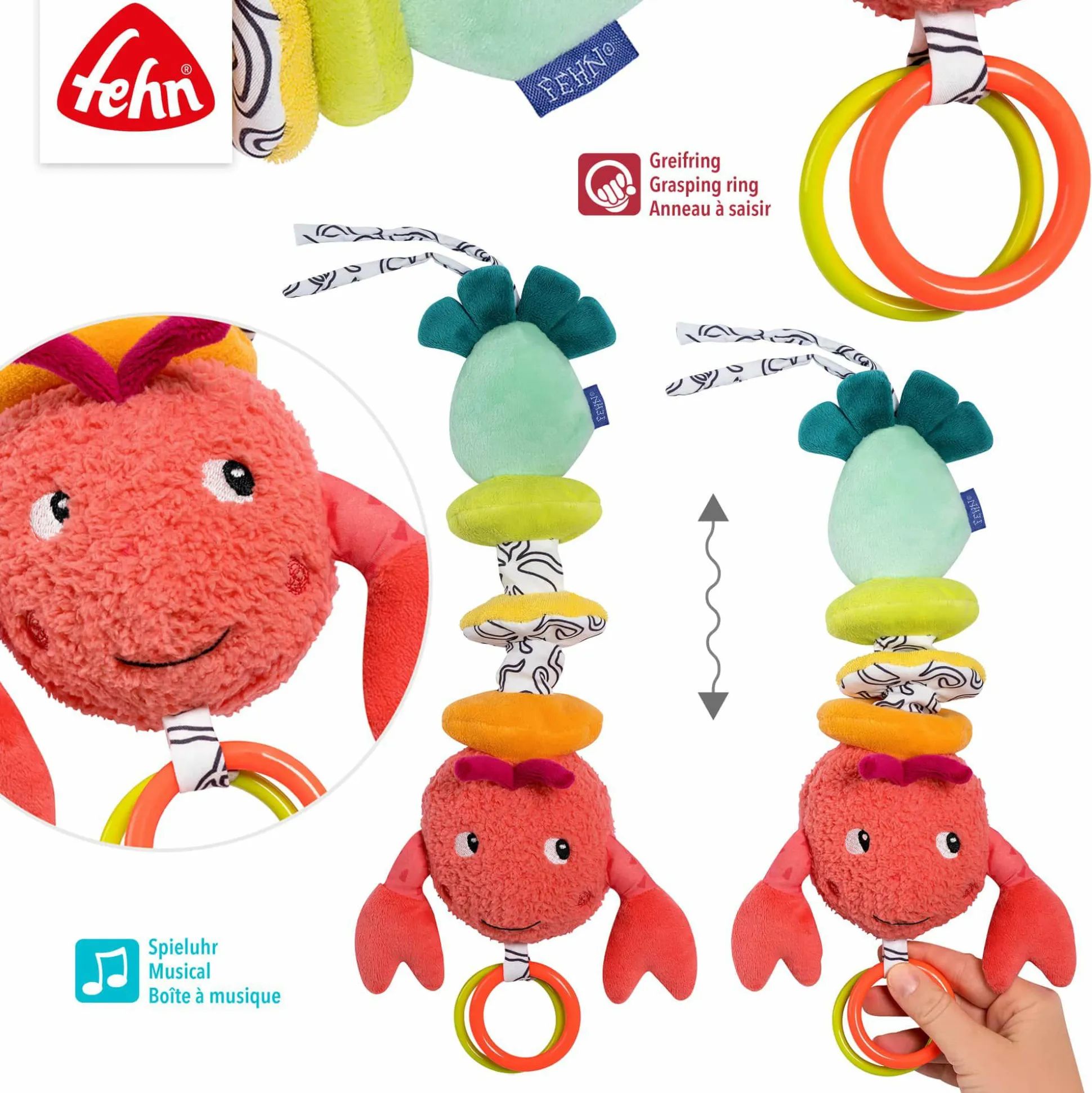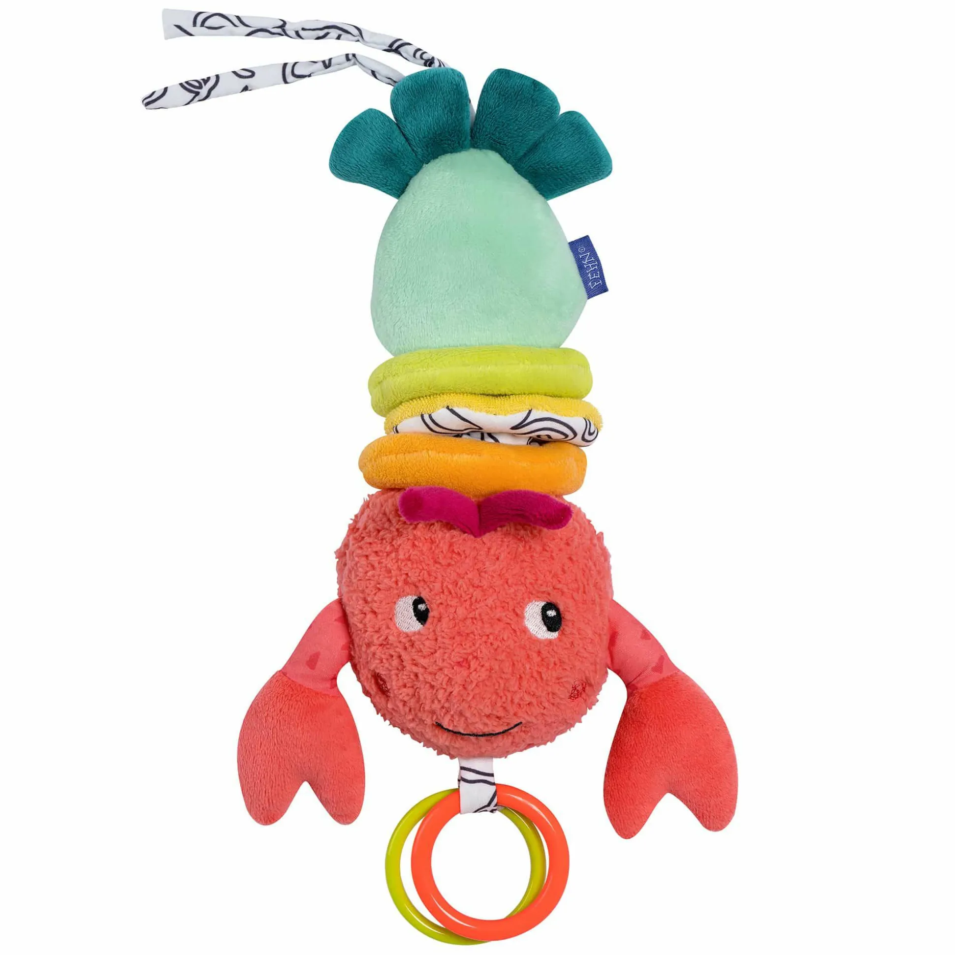 Dazu lässt sich der Hummer mit den praktischen Bändchen ganz einfach am Babybett, Kinderwagen oder an der Babyschale befestigen, während seine Scheren und Ringe zum Greifen, Knuddeln und Liebhaben einladen.
