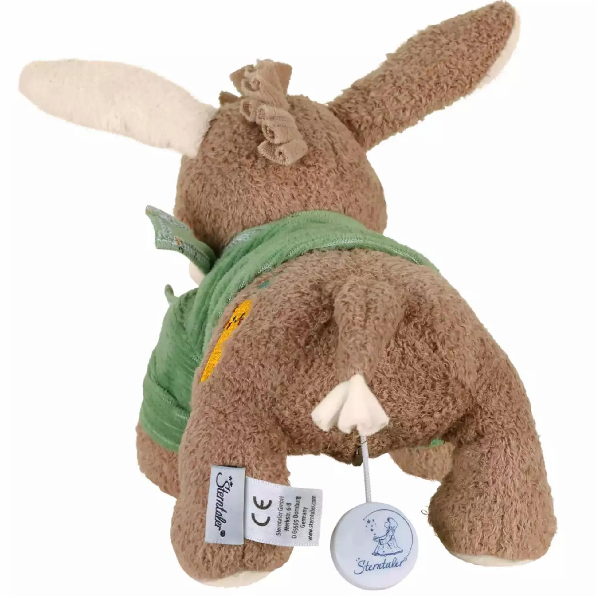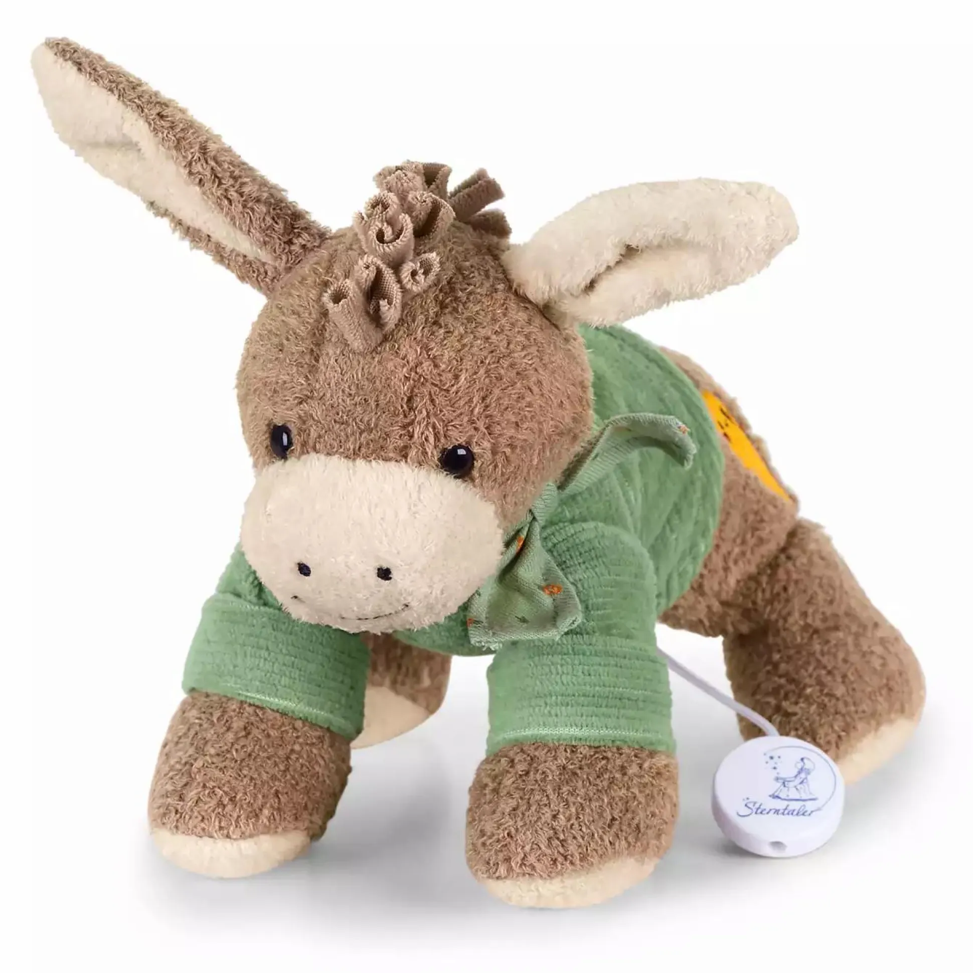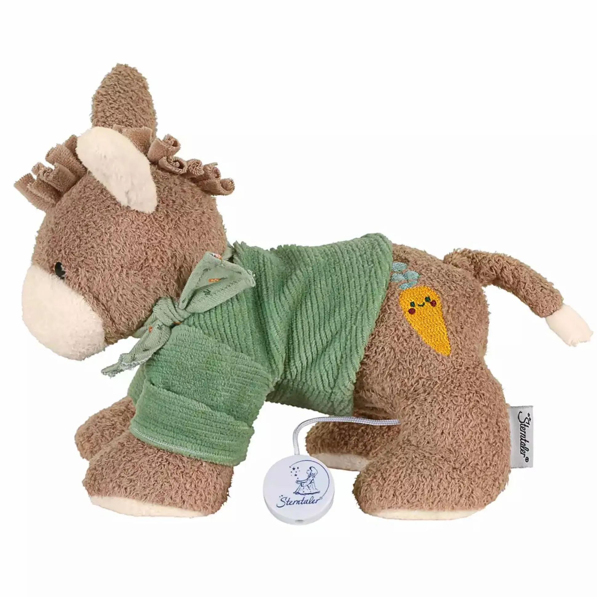 Der süße kleine Esel Emmilius von Sterntaler aus Flauschstoff und Jersey singt dein Baby in den Schlaf. Die Bindebänder sorgen zudem für eine einfache Befestigung an Bettchen, Kinderwagen oder im Auto.