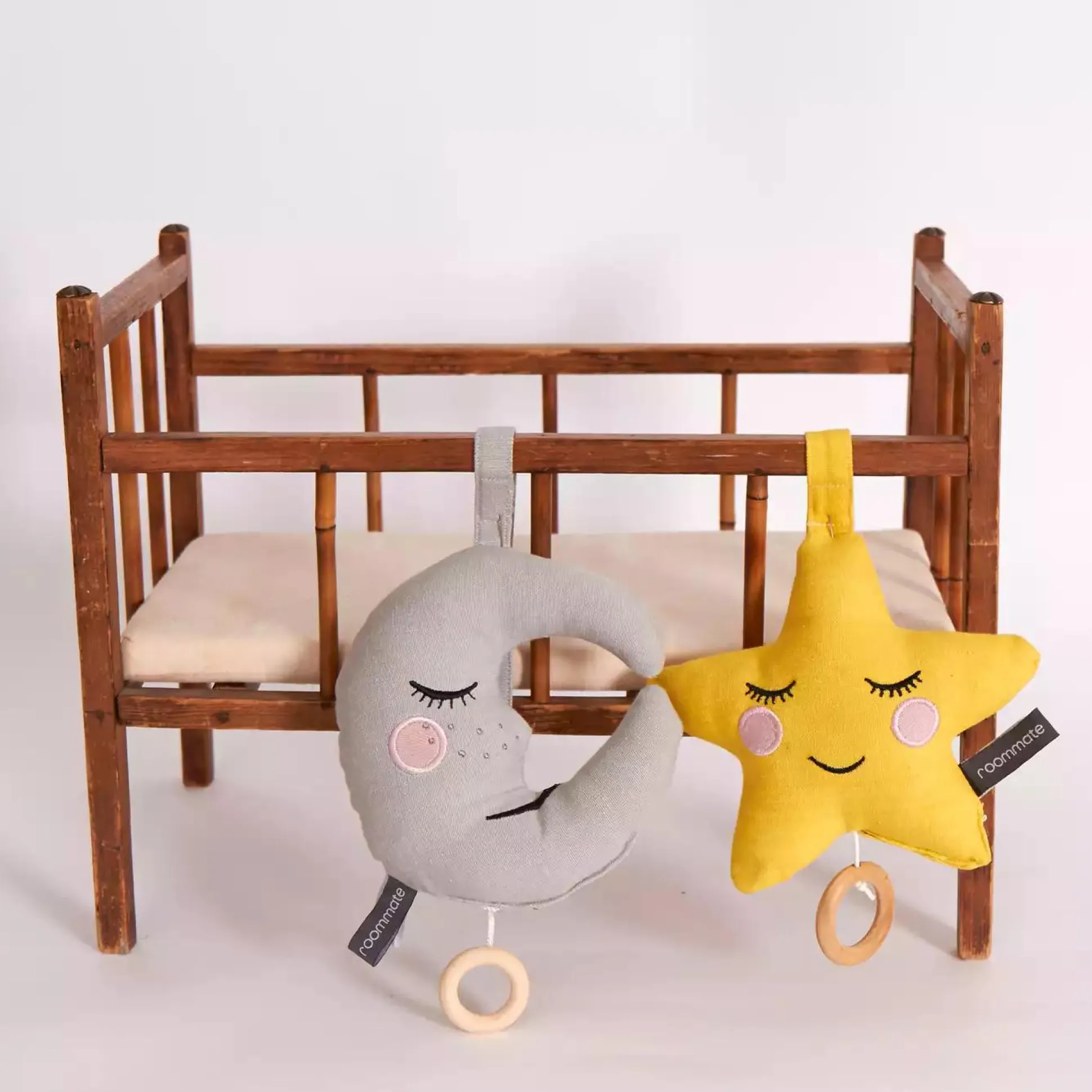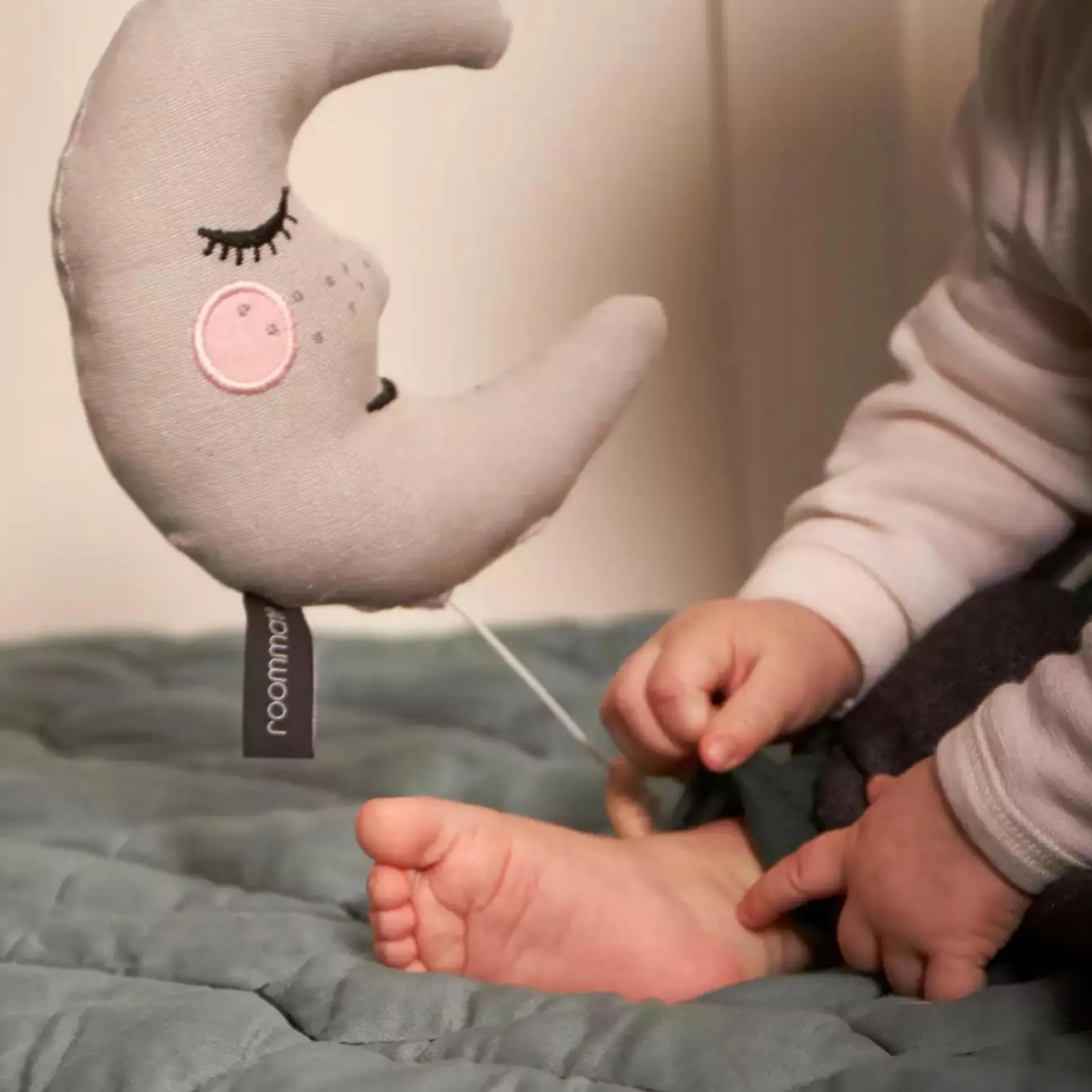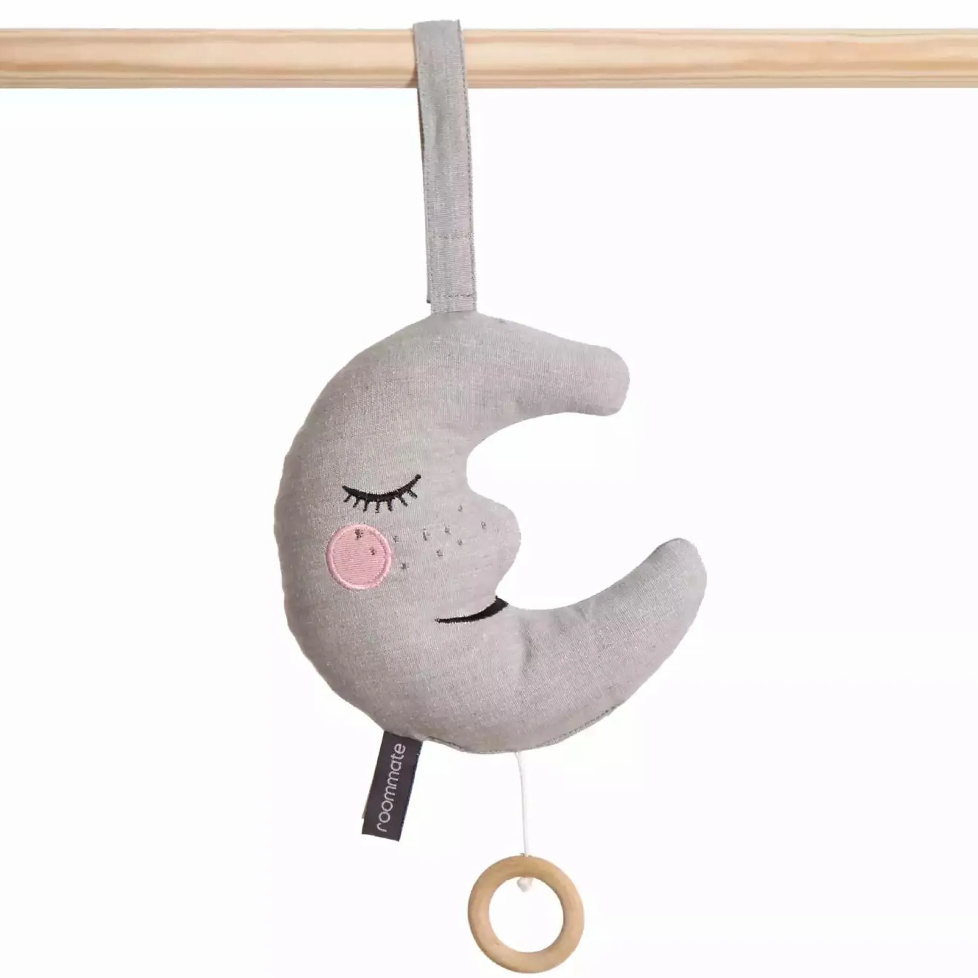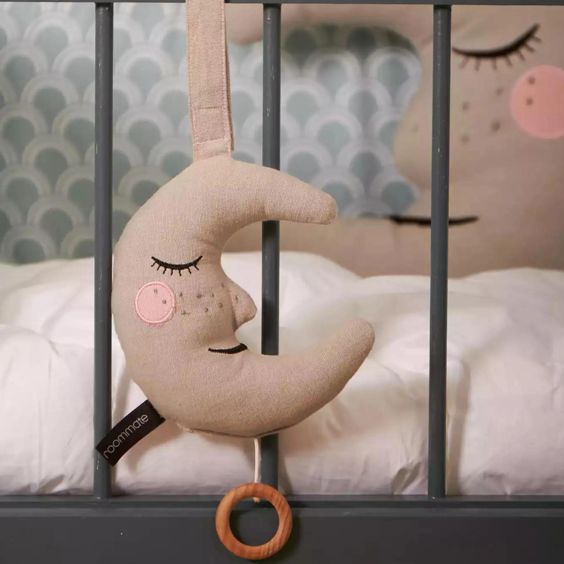 Die niedliche Spieluhr Mond von Roommate begleitet dein Baby bis es eingeschlafen ist. Die liebevoll gestickten Details und die Baumwollschnur mit Holzring unterstreichen die hohe Qualität der Spieluhr. Durch die Schlaufe mit Klett-Verschluss lässt sich die Spieluhr Mond sehr leicht an Möbelstücke, Haken oder Aufhängungen anbringen.