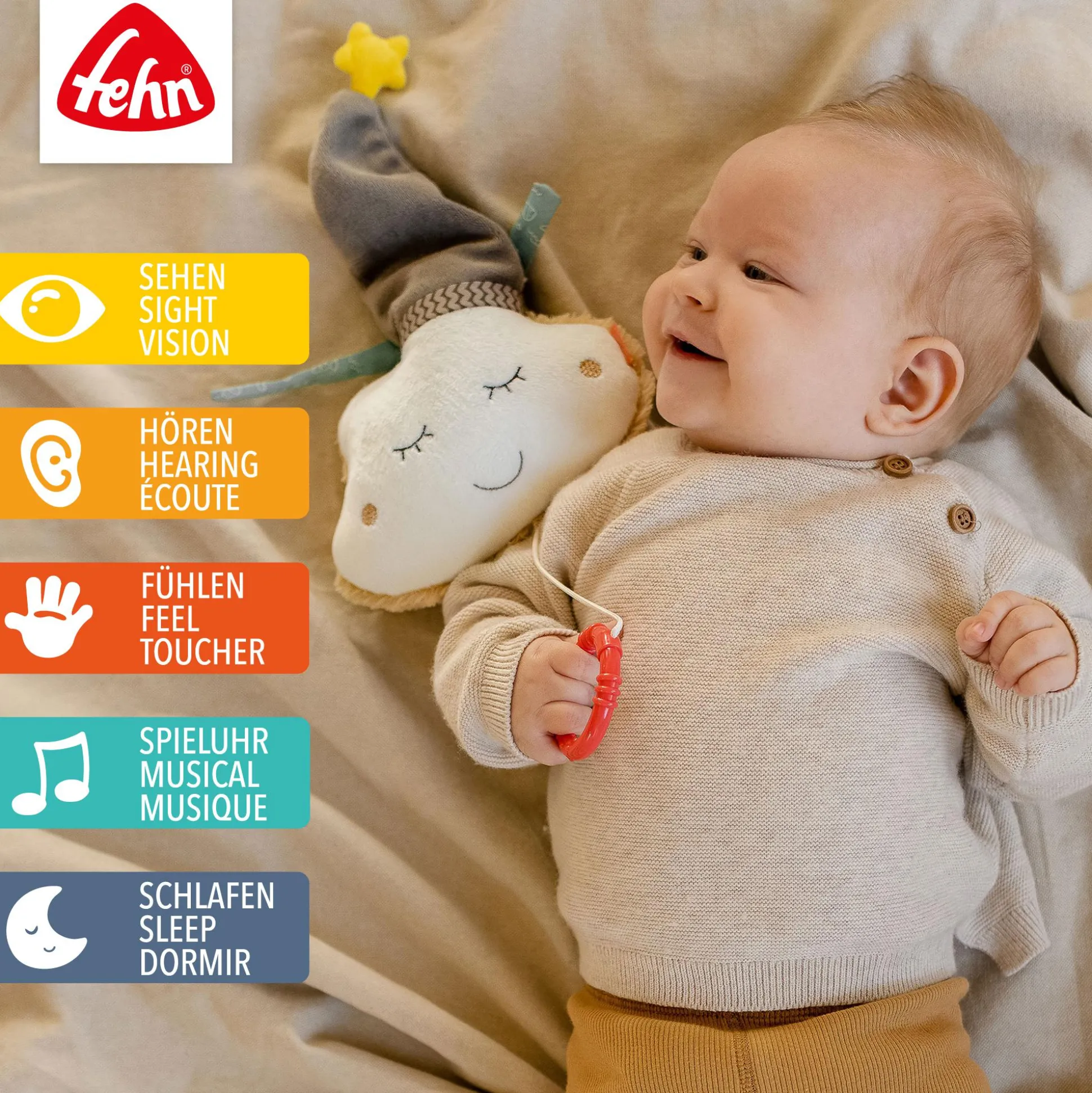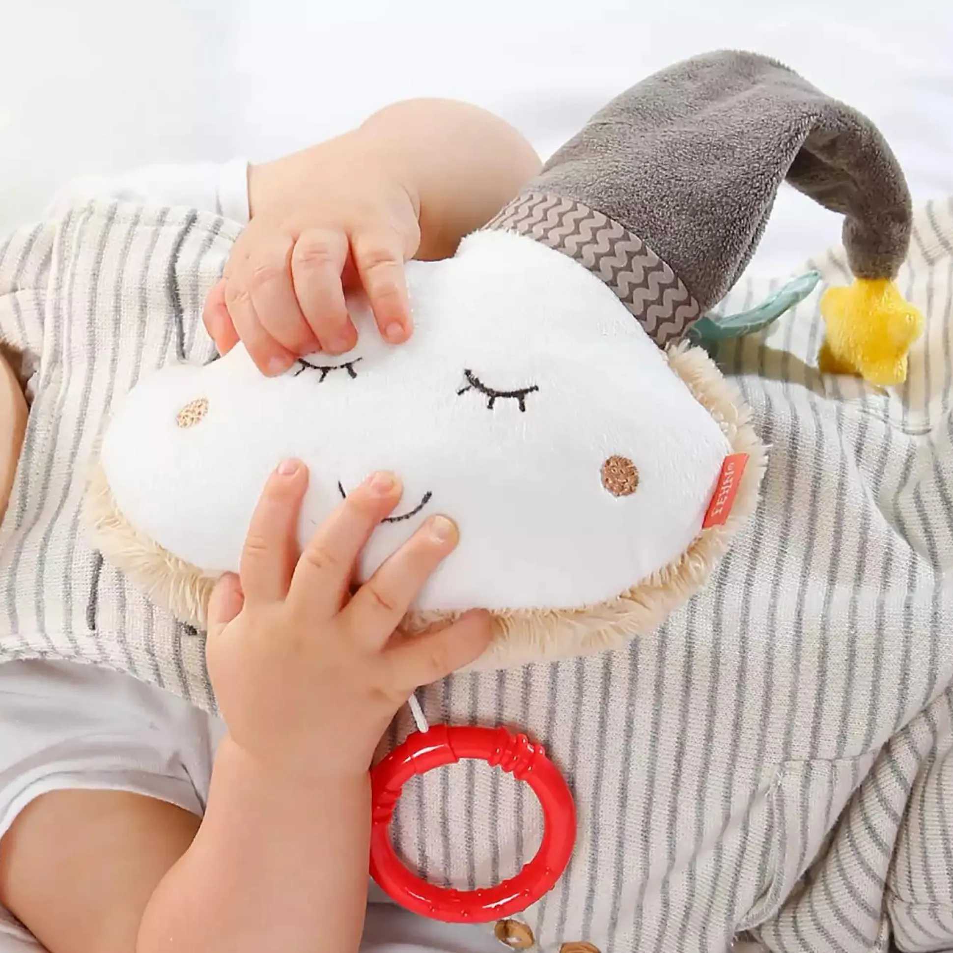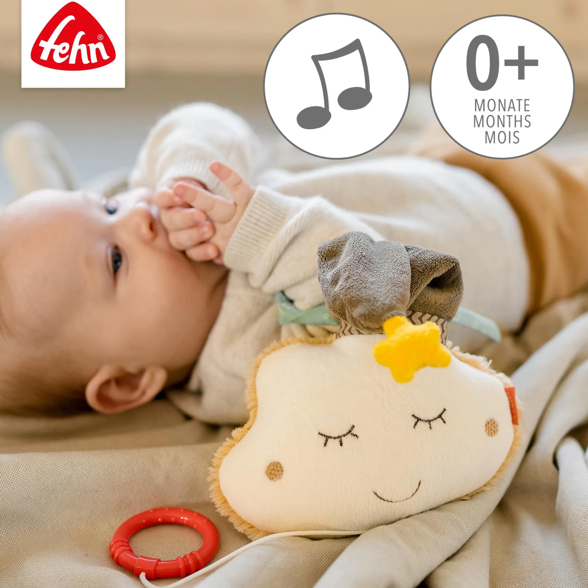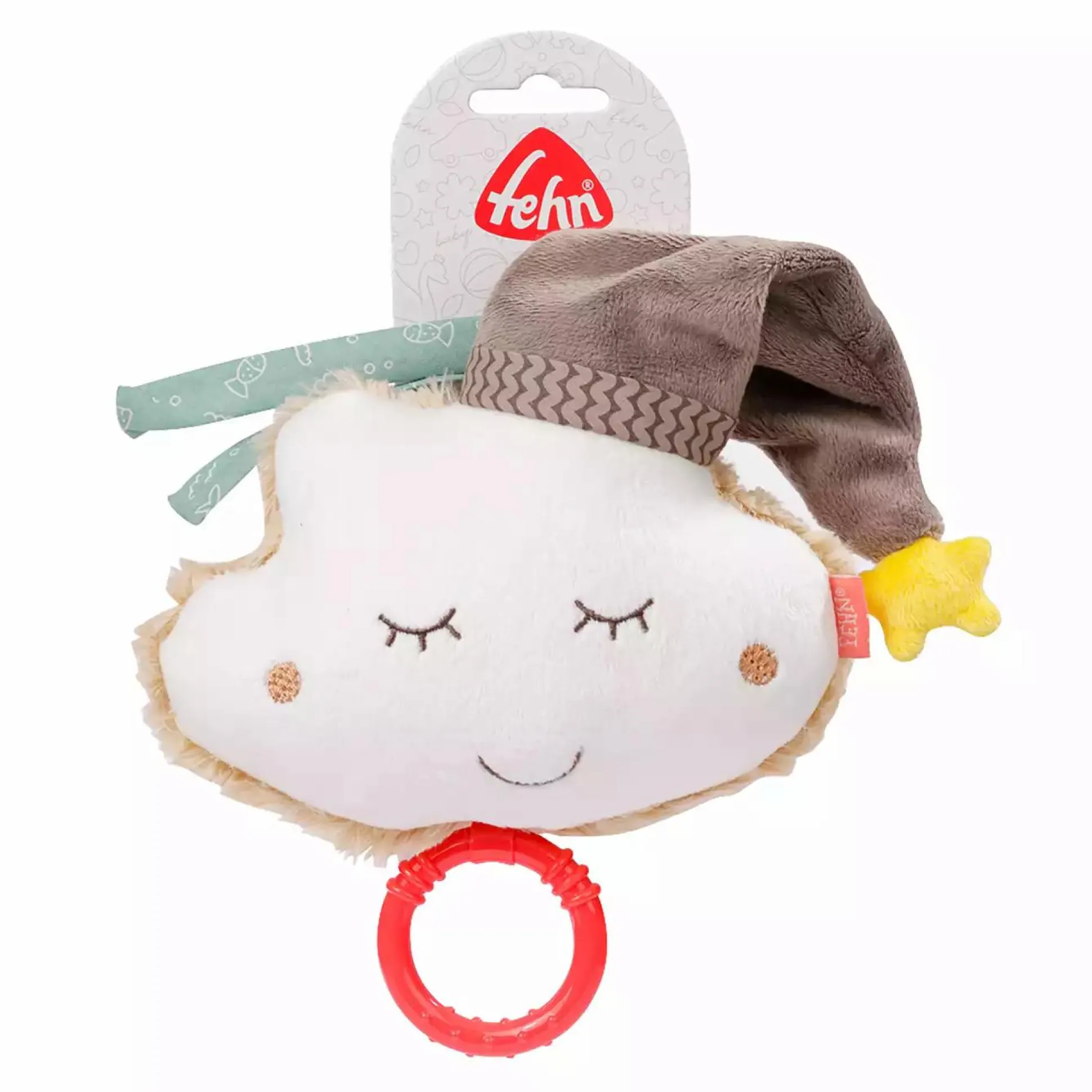 Die süße Spieluhr Wolke mit Mütze von fehn beruhigt dein Baby in jeder Situation. Die flauschige Wolke mit Ihrem freundlichen Gesicht wiegt dein Baby behutsam in den wohlverdienten Schlaf. Nach Aufziehen der Spieluhr erklingt ein beliebtes Einschlaflied. Das süße Wölkchen ist nicht nur die ideale Einschlafhilfe, sondern lässt sich dank der zwei Bändchen ganz einfach am Bettchen, Kinderwagen oder an der Babyschale befestigen – der perfekte Begleiter. Um das Plüschtier zu Reinigen, kann das Spielwerk nach Öffnen des Sicherheitsverschlusses einfach entnommen werden und bei 30°C gewaschen werden.