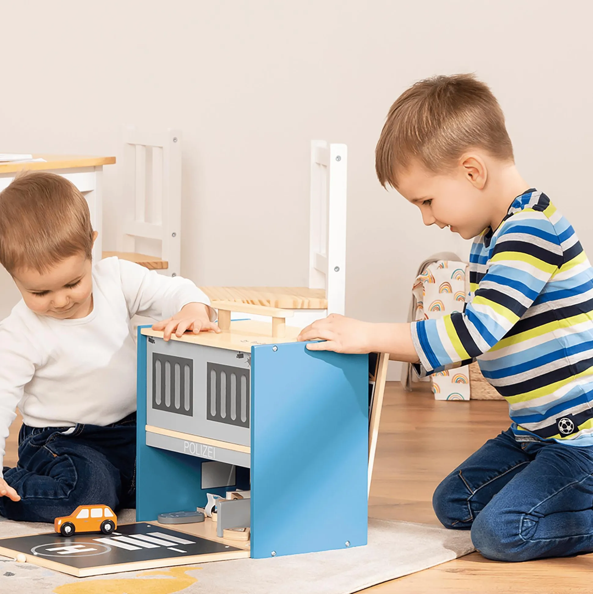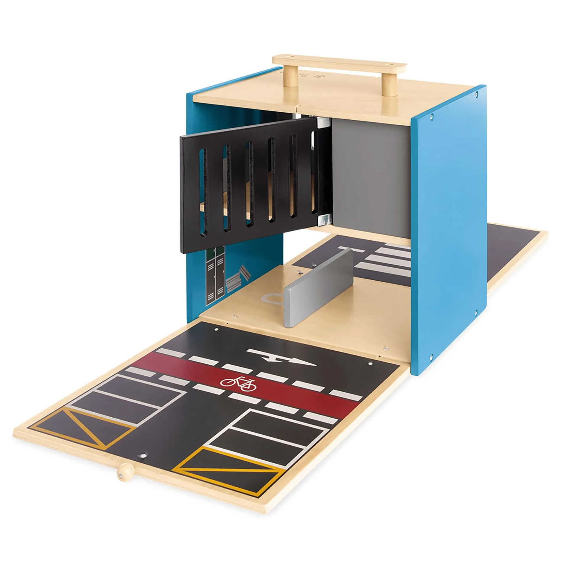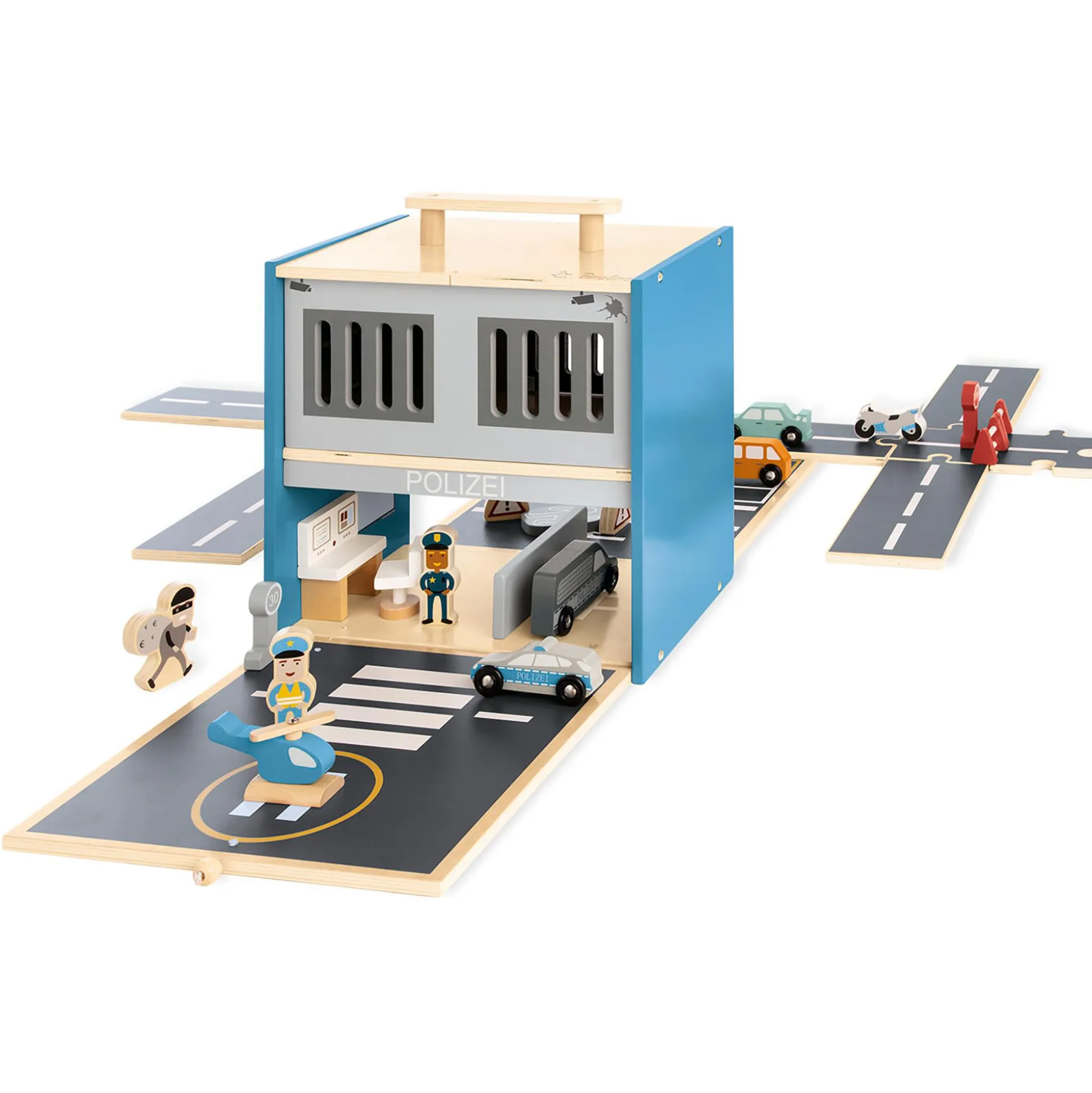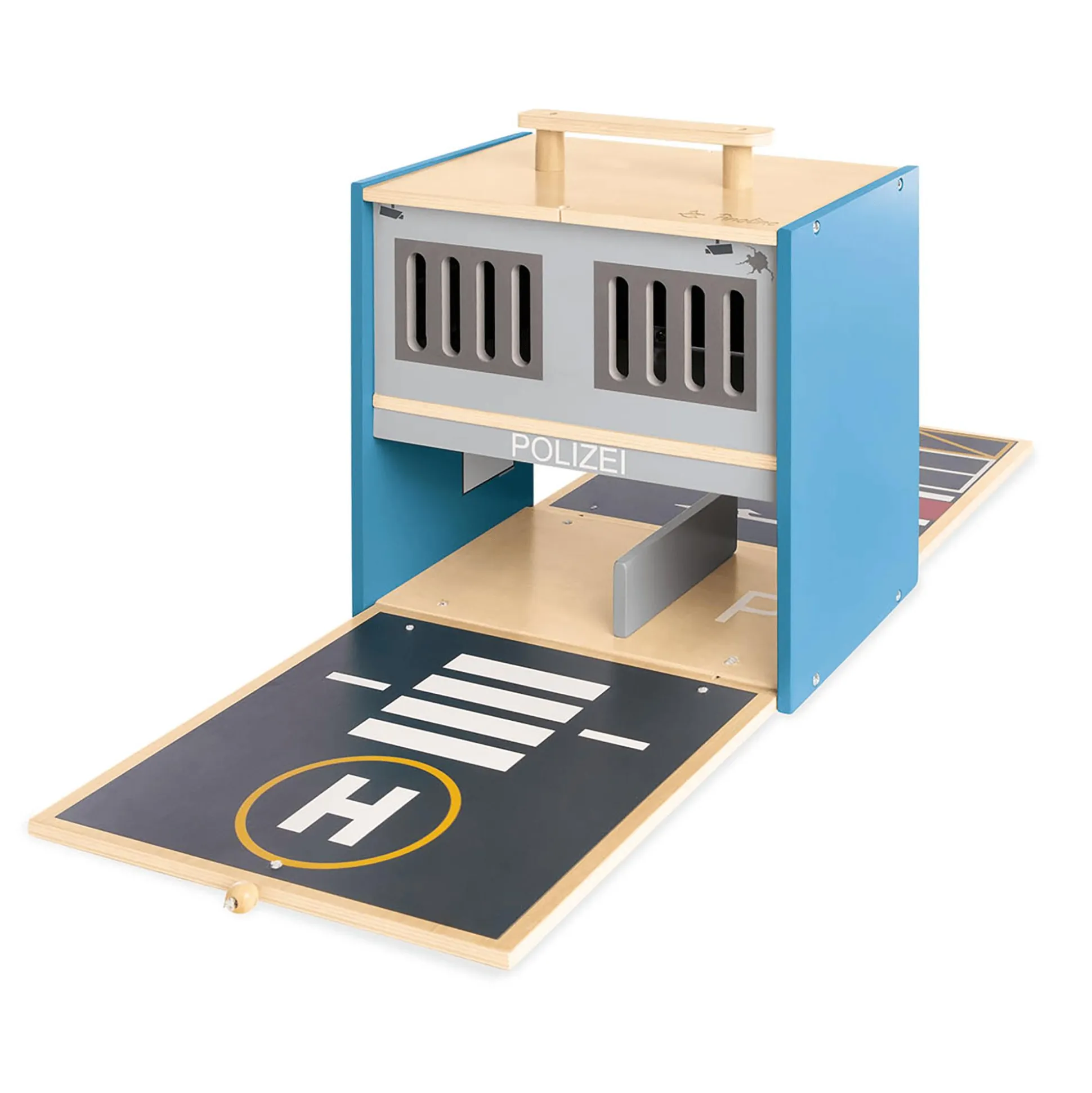 Die vielfältigen Aufbaumöglichkeiten dieser Spielwelt inspirieren zu fantasievollen Rollenspielen und garantieren deinem Kind aufregende Nachmittage, sei es bei der Streifenfahrt durch die Stadt oder bei der Aufklärung kniffliger Fälle.Die zweiseitig aufklappbare Spielkiste ist komfortabel am Griff transportierbar, sodass du die Spielwelt überall mit hinnehmen kannst. Ob im Kinderzimmer, im Garten oder bei Freunden – der Spielspaß ist immer dabei!Mit der klappbaren Gefängnistür, den fahrbaren Autos und dem Helikopterlandeplatz können spannende Verfolgungsjagden und aufregende Rettungsaktionen nachgespielt werden.