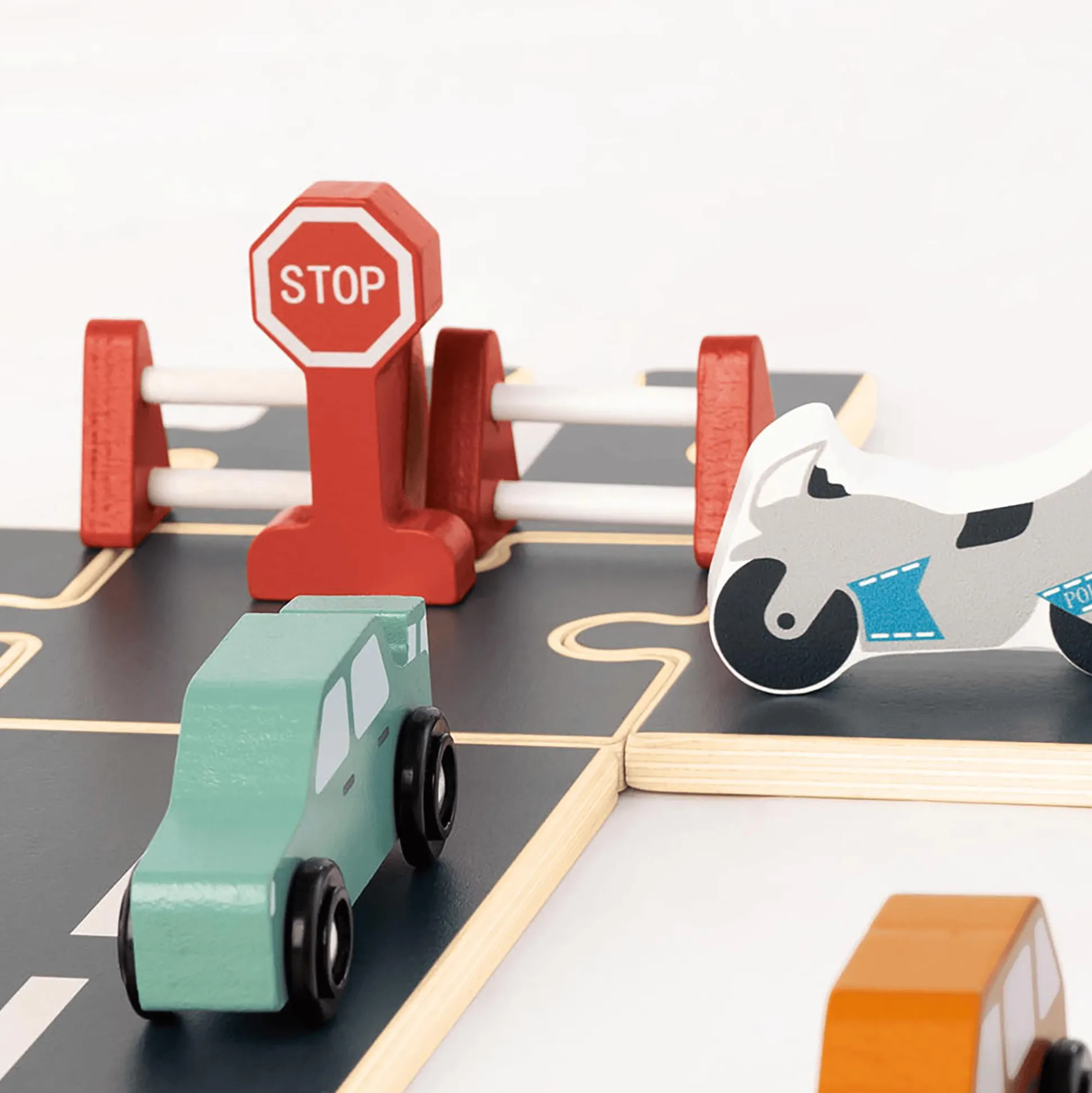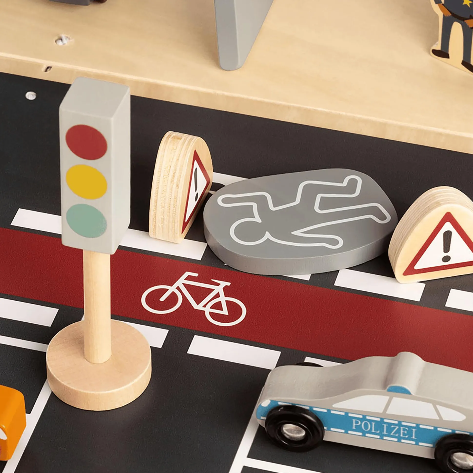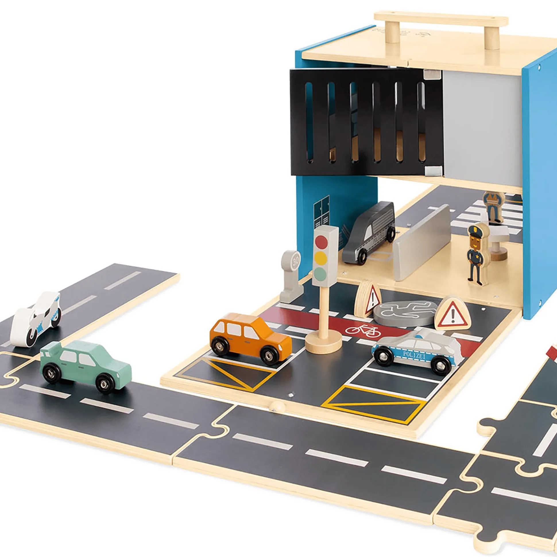 - mit 1 Spielkiste, 10 Straßenelementen, 8 Figuren und 12-teiliges Zubehör