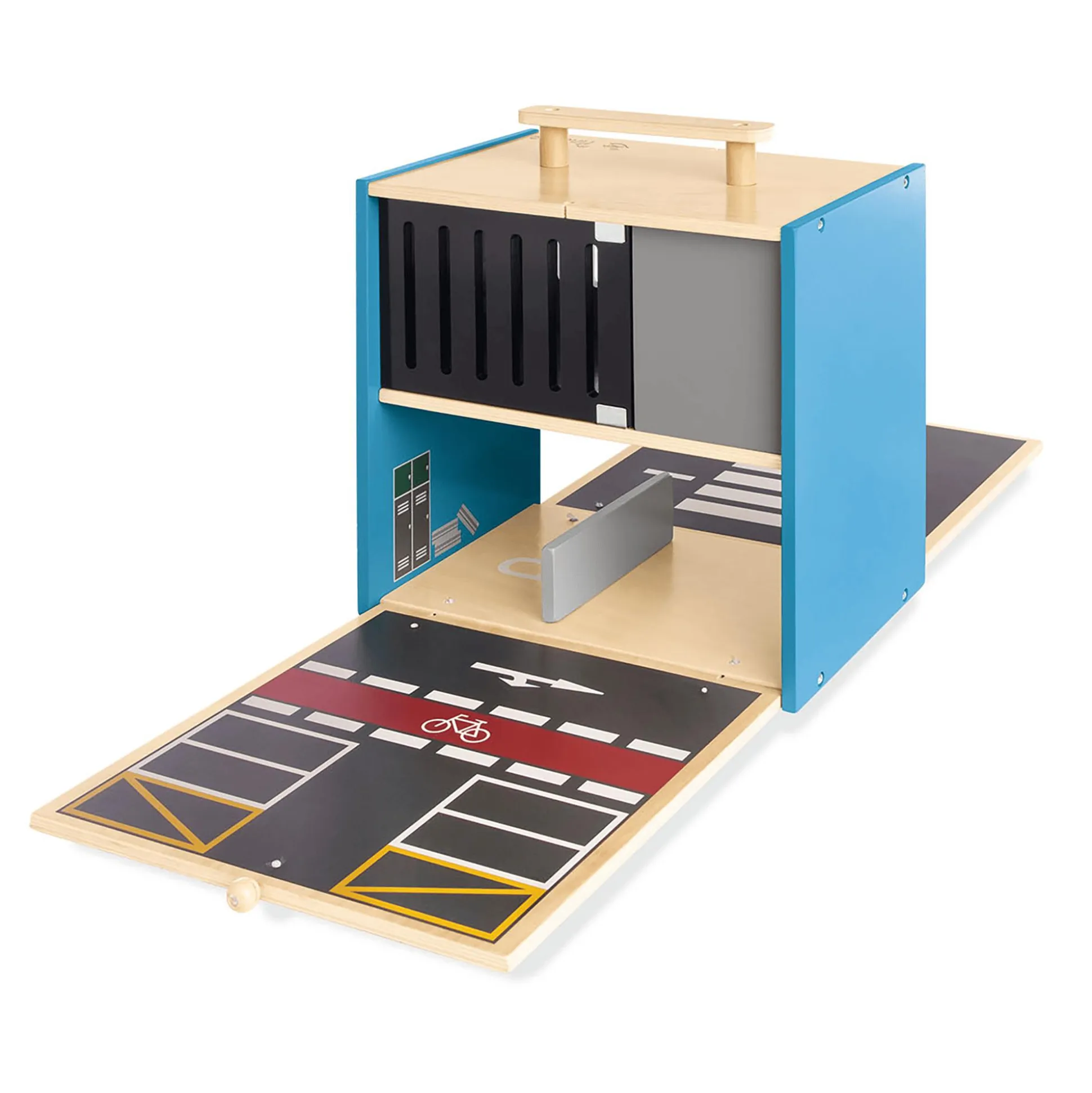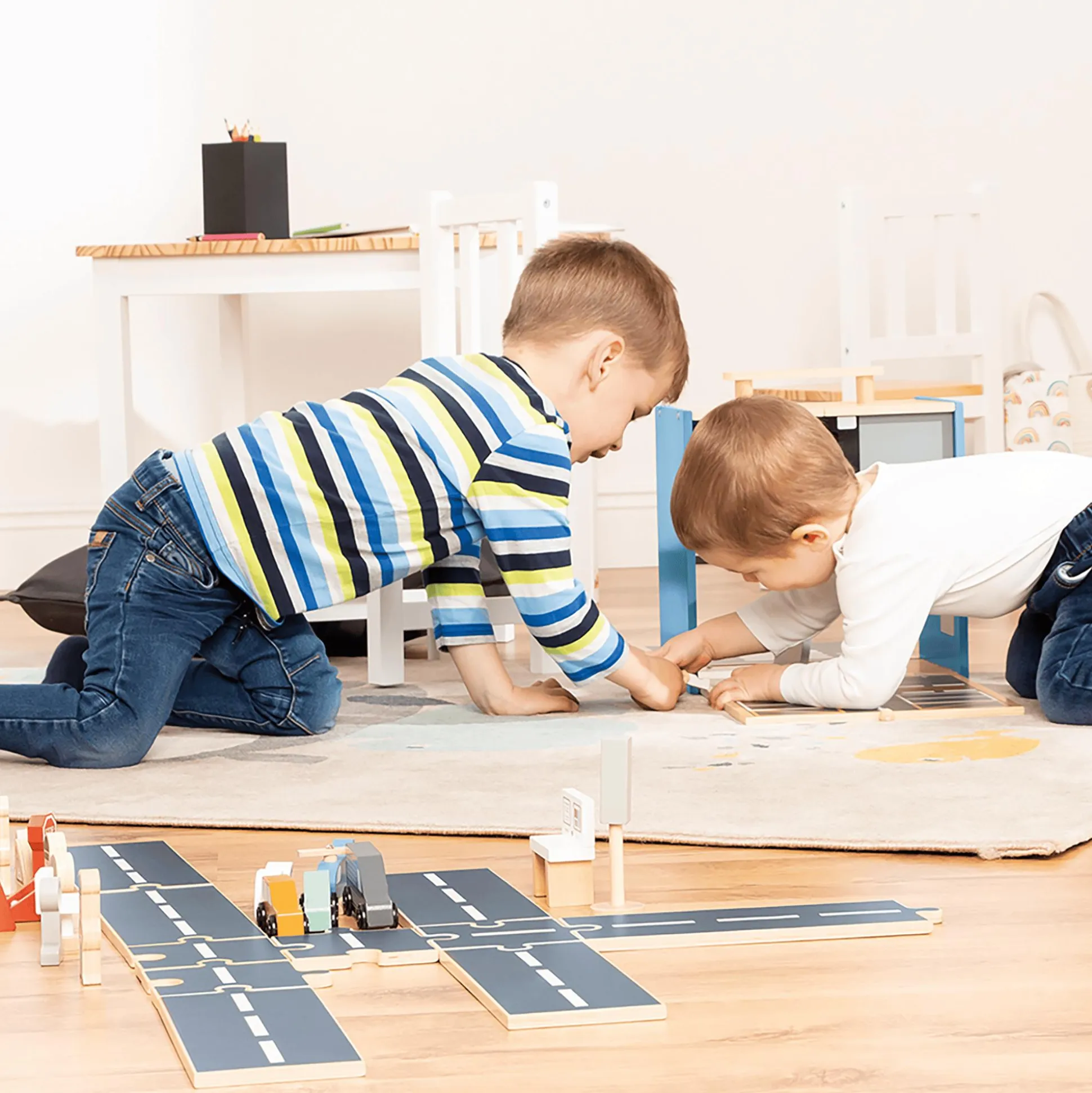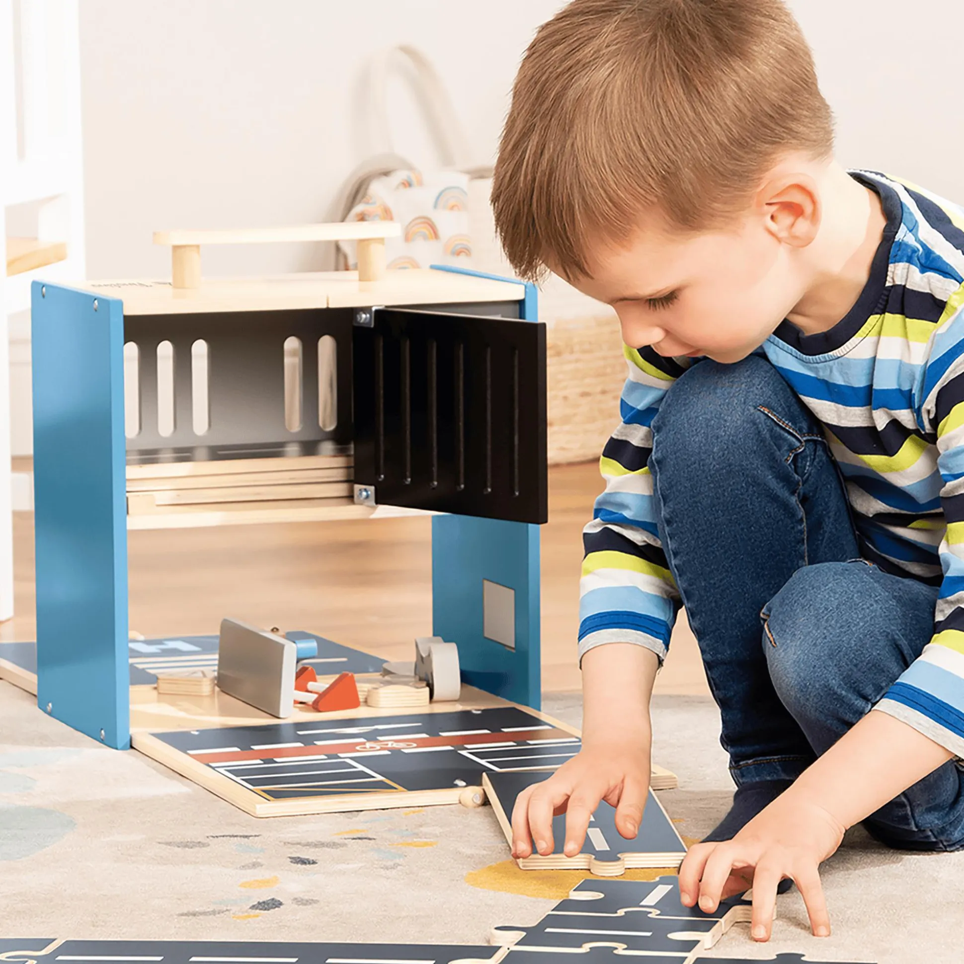- mit 1 Spielkiste, 10 Straßenelementen, 8 Figuren und 12-teiliges Zubehör