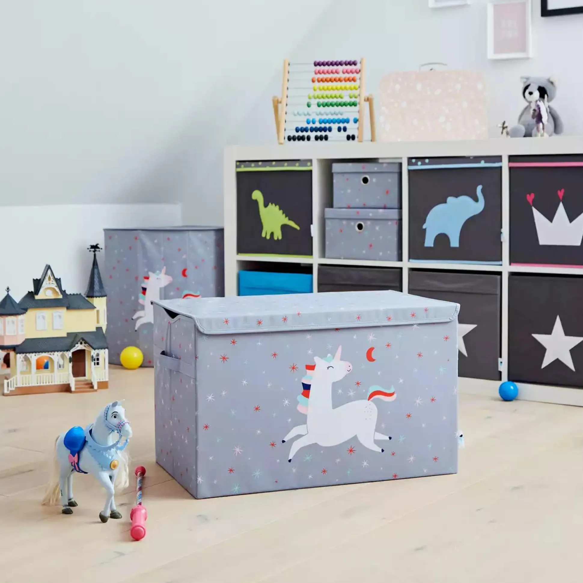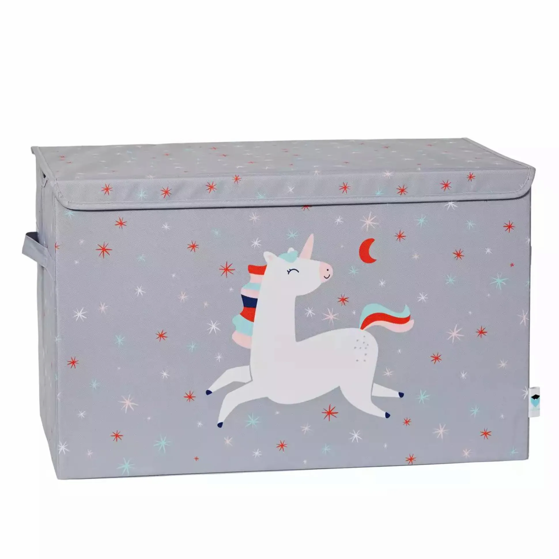 Diese extra große Spielzeugtruhe aus der Happy Kids Serie von LOVE !T STORE !T ist die perfekte Lösung um im Kinderzimmer schnell Ordnung zu schaffen. Die Truhe mit süßem Einhorn-Motiv ist mit MDF verstärkt und bietet dadurch eine erhöhte Stabilität. An der Vorderseite kann die Ordnungstruhe außerdem mit Hilfe von eingearbeiteten Magneten kinderleicht geschlossen werden.