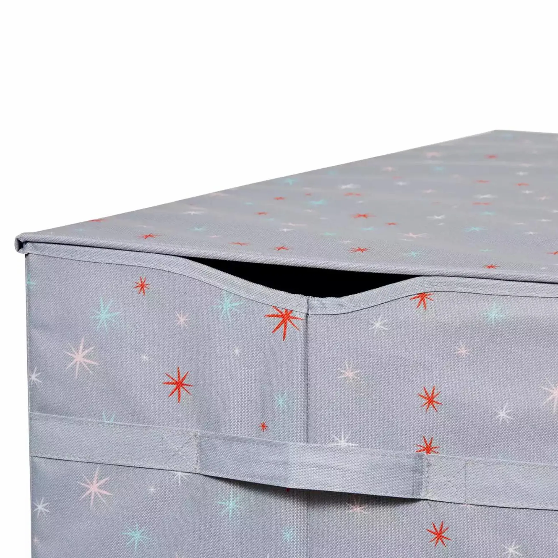Darüber hinaus sind an beiden Seiten Griffe angebracht, sodass die Truhe ganz einfach getragen werden kann. Die Griffe sind zudem doppelt mit der eingearbeiteten Holzplatte vernäht, sodass auch unter hoher Last der Stoff nicht reißt. Am oberen Rand der Truhe finden sich zusätzlich seitlich zwei Aussparungen, die dafür sorgen, dass auch bei geschlossenem Deckel keine Gefahr besteht, selbst wenn die Kinder mal in der Truhe sitzen und verstecken spielen.