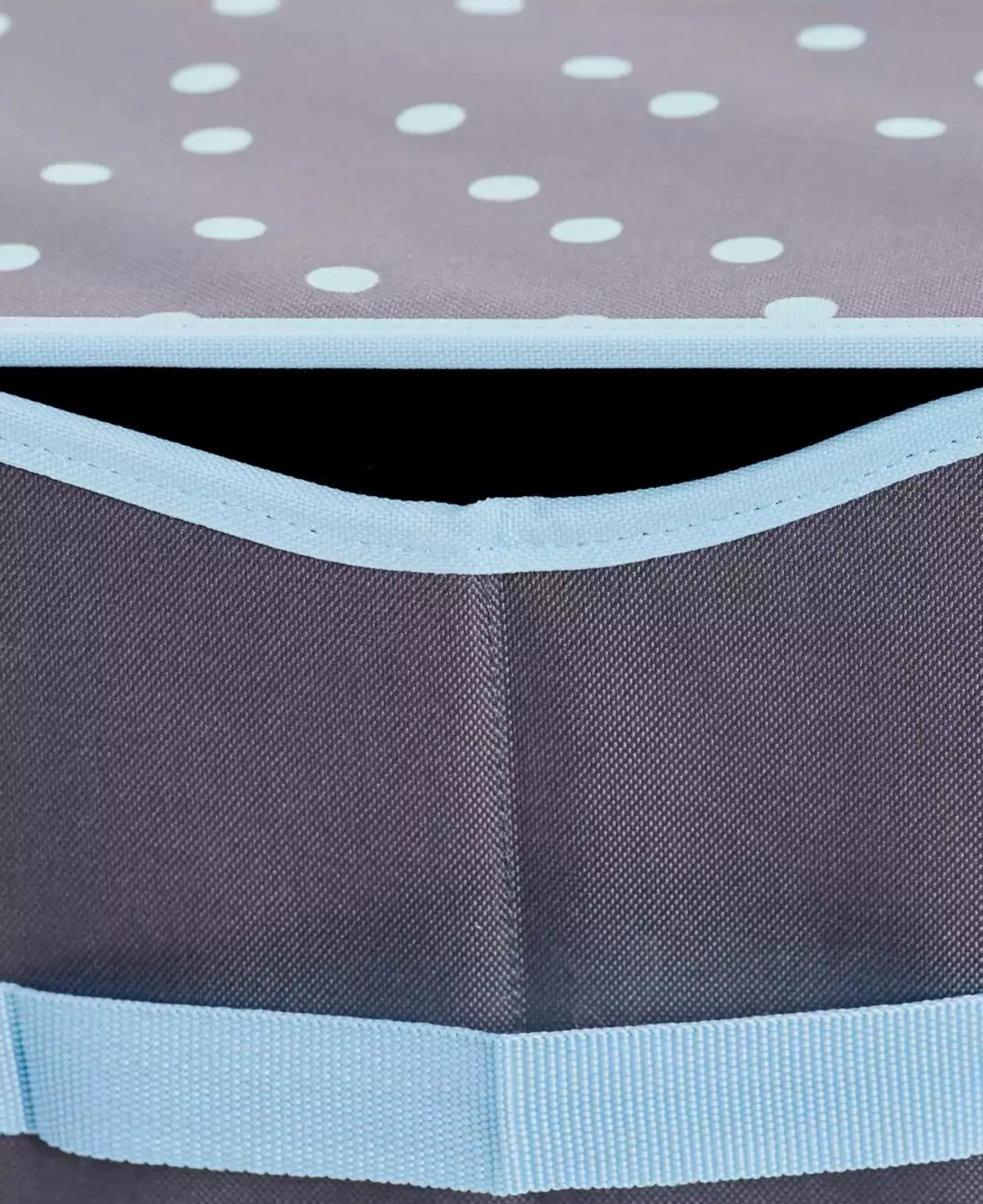 Am oberen Rand der Truhe finden sich zwei Ausparungen die dafür Sorgen, dass auch bei geschlossenen Deckel keine Gefahr besteht, selbst wenn Die Kinder mal in der Truhe sitzen. Die Außenseite der Truhe ist mit einem süßen Punkten gestaltet.