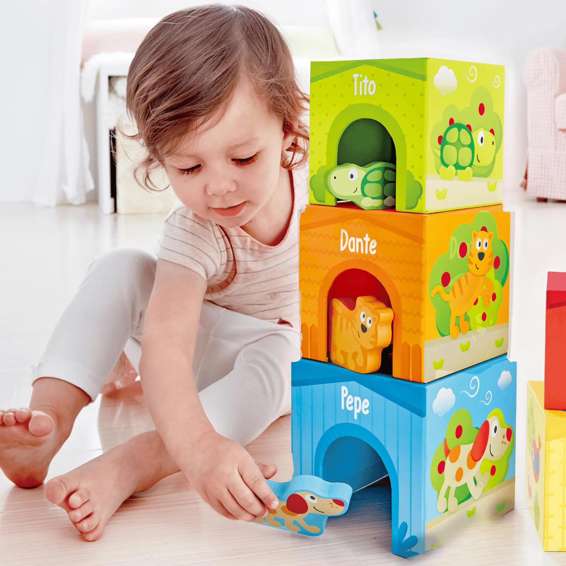 Mit dem Stapelturm Pepe & Friends von Hape entdeckt dein Schatz die bunte Welt von Pepe und den Freunden! Dieses 9-teilige Set aus stapelbaren Kartonwürfeln fördert die Kreativität deines Kindes und bietet gleichzeitig eine spielerische Möglichkeit, Zahlen von 1 bis 10 zu lernen.Die unterschiedlich großen Würfel sind liebevoll mit Landschaften und den Charakteren Dante, Lilly, Pepe und Tito gestaltet. Sie regen die Fantasie an und laden zum Erzählen eigener Geschichten ein. Das hochwertige, stabile Kartonmaterial macht das Set sicher und langlebig.Ob Stapeln, Sortieren oder fantasievolles Spielen – der Hape Freundschaftsturm bietet stundenlangen Spaß und ist gleichzeitig platzsparend zu verstauen. Perfekt für Kinder ab ca. 18 Monaten!