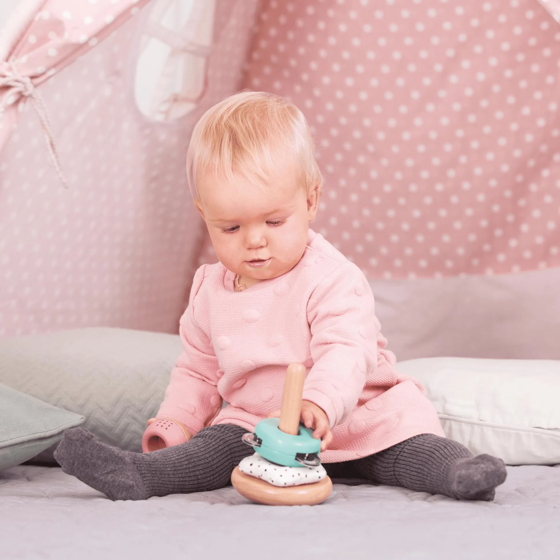 Jedes Element des Stapelturms ist mit Rasselelementen oder Schellen ausgestattet, die dazu einladen, musikalische Entdeckungen zu machen. Durch die unterschiedlichen Klangeffekte wird das Spielen mit Stina zu einer unterhaltsamen und lehrreichen Erfahrung für deinen kleinen Wirbelwind.