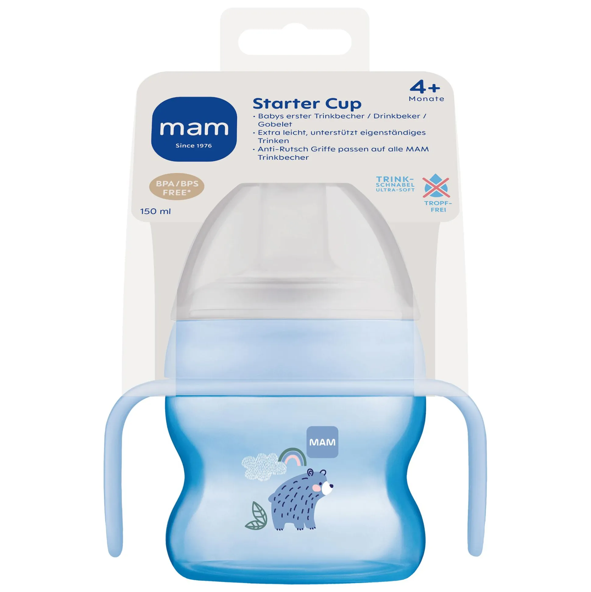 Ein extra-weicher, tropffreier Silikon-Trinkschnabel ist ideal für die ersten Trinkversuche aus einem Becher geeignet. Der am Rand des Bechers angebrachte Trinkschnabel bereitet deinem kleinen Schatz auf das Trinken aus dem Glas vor, ganz ohne Kleckern. Die taillierte Form und die ergonomischen, rutschsicheren Griffe erleichtern es den Becher gut zu halten. Durch den Verschlussdeckel kannst du den Trinkbecher verschließen und damit auch leicht unterwegs transportieren. Man kann die Trinklernflasche einfach in der Spülmaschine reinigen. Der Trinklernbecher ist für Kinder ab ca. 4 Monaten geeignet. Alle Einzelteile des Starter Cups kannst du mit anderen MAM Trinkbechern kombinieren. Der Becher ist selbstverständlich BPA/BPS-, PVC- und metallfrei.