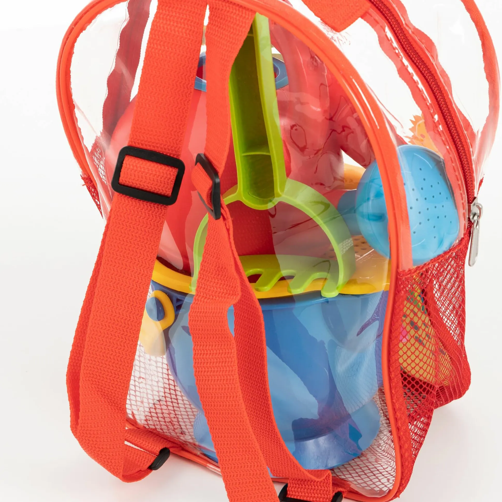 Farbenfroher Strandrucksack von Hape inklusive jeder Menge Sandspielzeug. Im Rucksack befinden sich ein Eimer, eine Schaufel, ein Rechen, ein Förmchen und eine leicht zu tragende Gießkanne. Das regt zum Nachahmungs- und Fantasiespiel an, fördert aber auch das Geschichtenausdenken, das Rollenspiel und die Kreativität. Alles findet seinen Platz im Rucksack – also ab ans Meer.