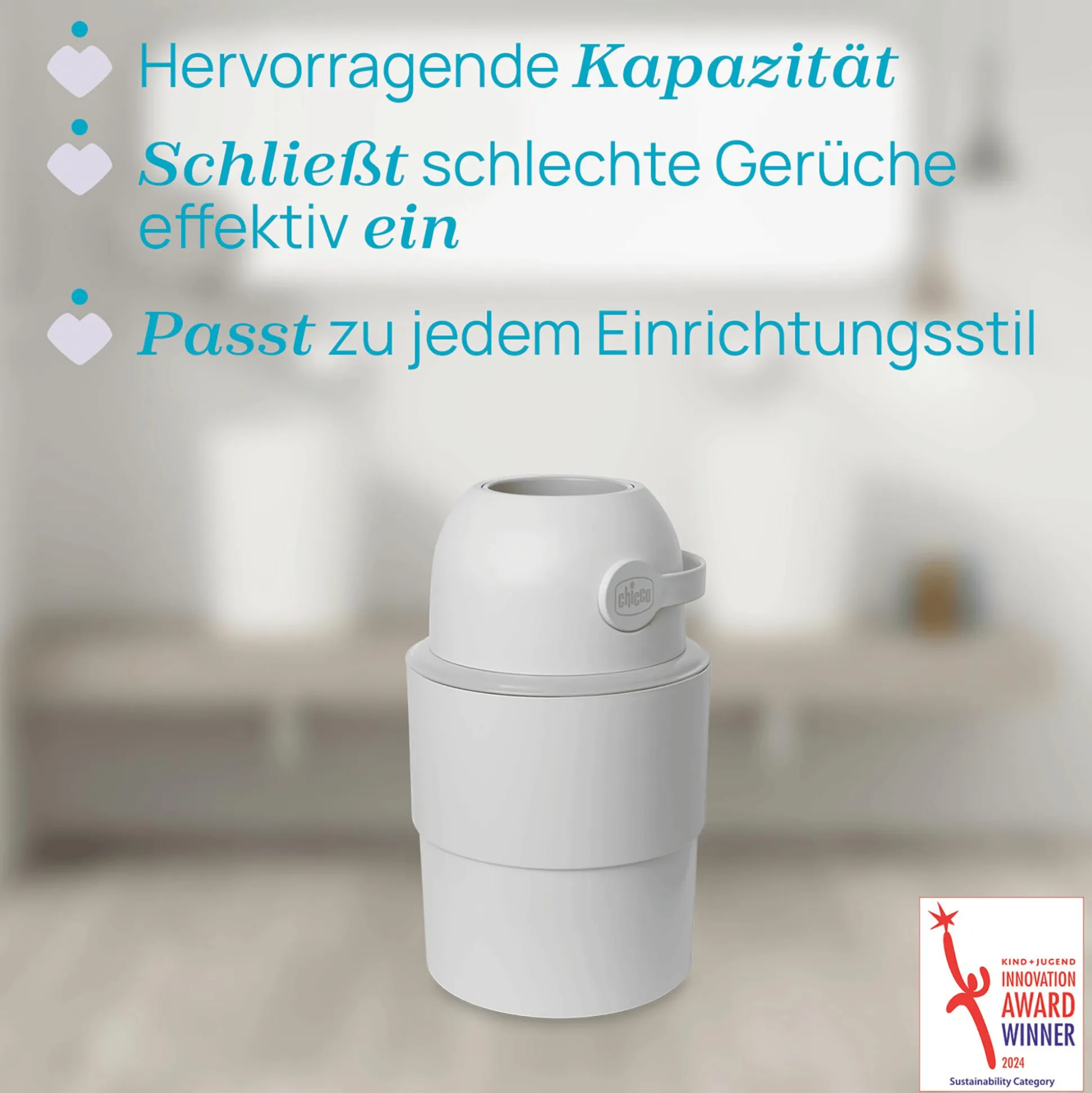 Mit dem separat erhältlichen Second Life Deckel von Chicco kann der Eimer bequem in einen herkömmlichen Mülleimer umgewandelt werden. Er passt optimal zu jedem Einrichtungsstil und ist durch seine unkomplizierte Handhabung und die einfache Reinigung eine praktische Ergänzung für jeden Haushalt.