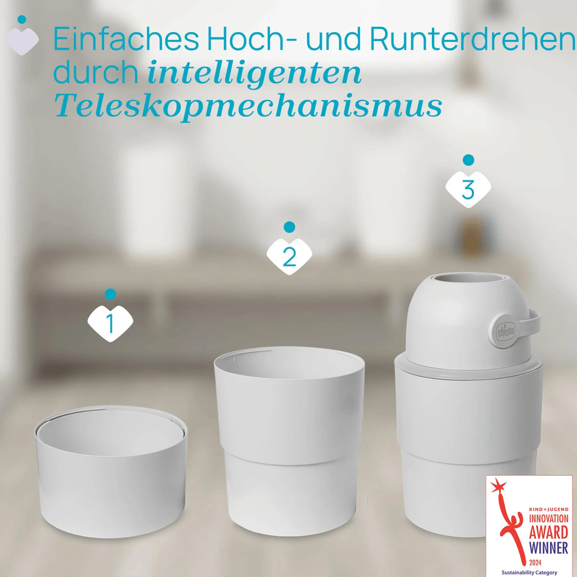 Der intelligente Teleskopmechanismus ermöglicht ein einfaches Hoch- und Runterdrehen, wodurch der Eimer bei Bedarf verkleinert und platzsparend transportiert oder gelagert werden kann. Dabei wird der äußere Zylinder ganz einfach hochgedreht, der Deckel reingedreht – schon ist der Teleskop Windeleimer einsatzbereit.