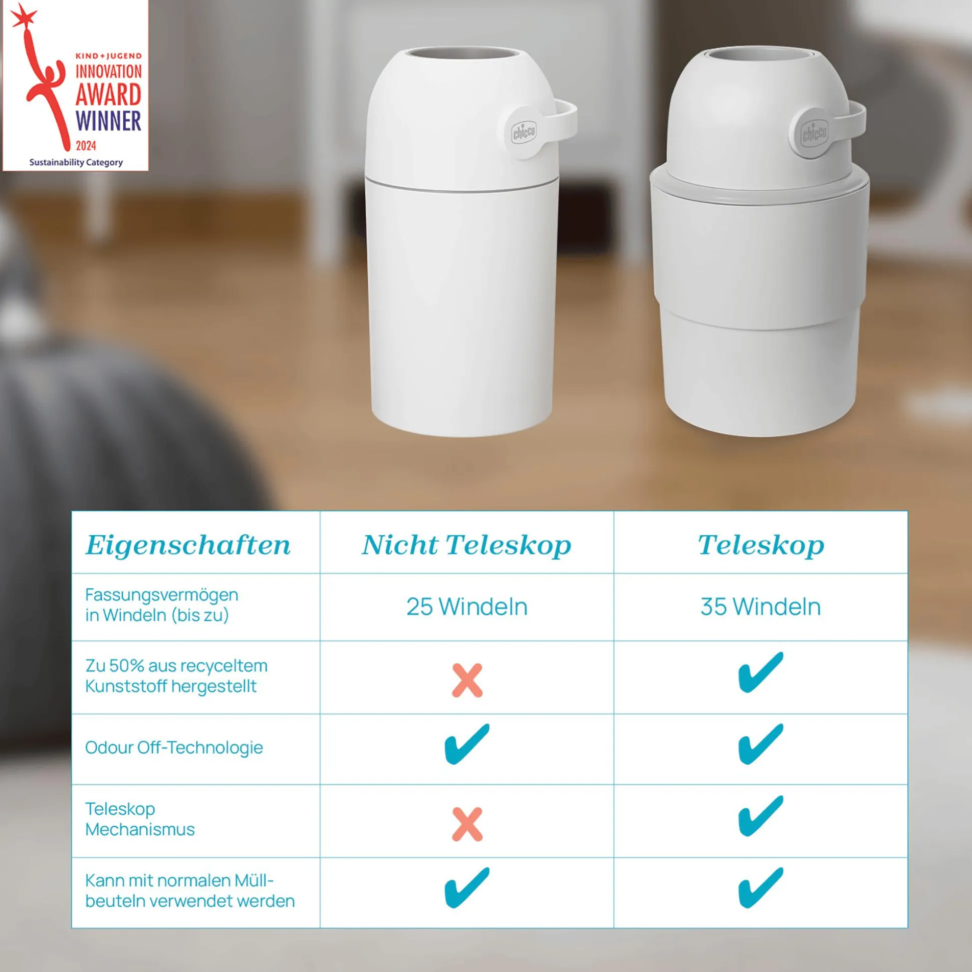 - Lieferumfang: 1 Teleskop Windeleimer Odour, 1 Packung Müllbeutel Odour Off
