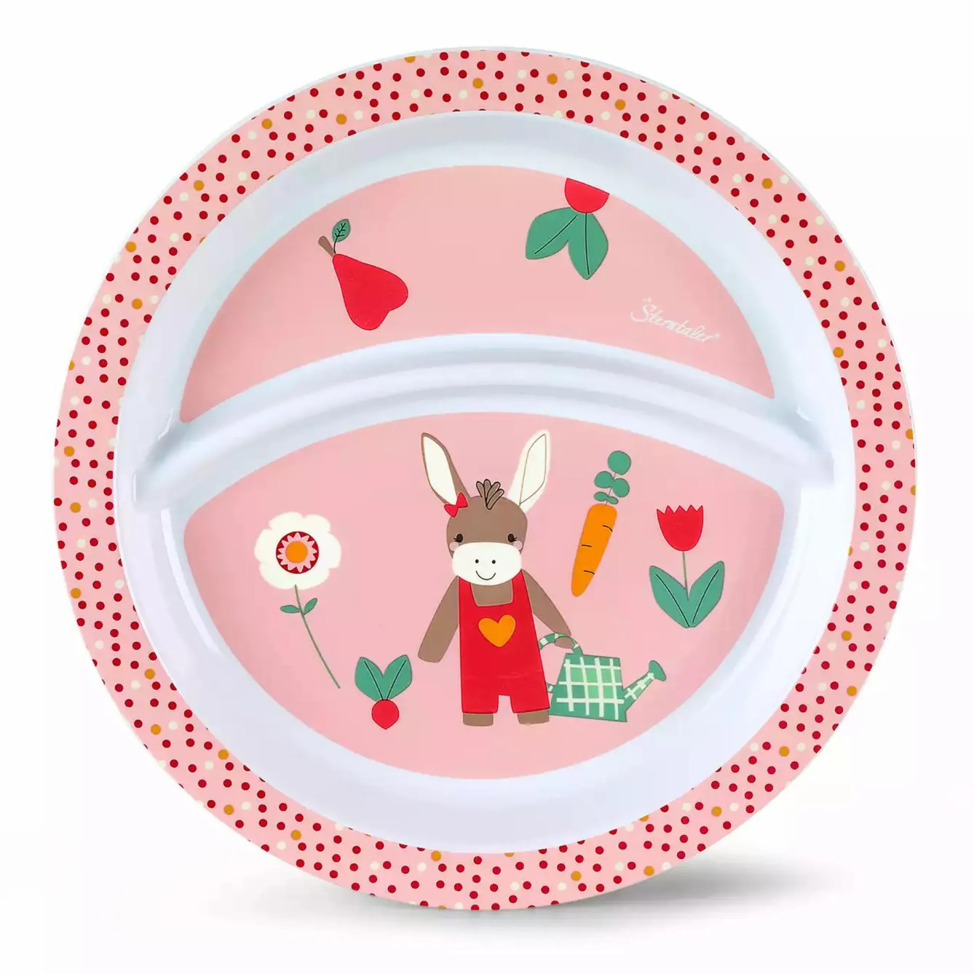 Mit dem fröhlich bedruckten Sterntaler Teller aus der Serie „Esel Emmily“ kommt Farbe auf den Tisch. Eine praktische Unterteilung hilft Speisen zu trennen. Der Teller ist aus strapazierfähigem Polypropylen gefertigt, lebensmittelecht und hat eine rutschfeste Unterseite. In der Spülmaschine kann der Teller für das nächste Lieblings-Menü deines Schatzes gereinigt werden.