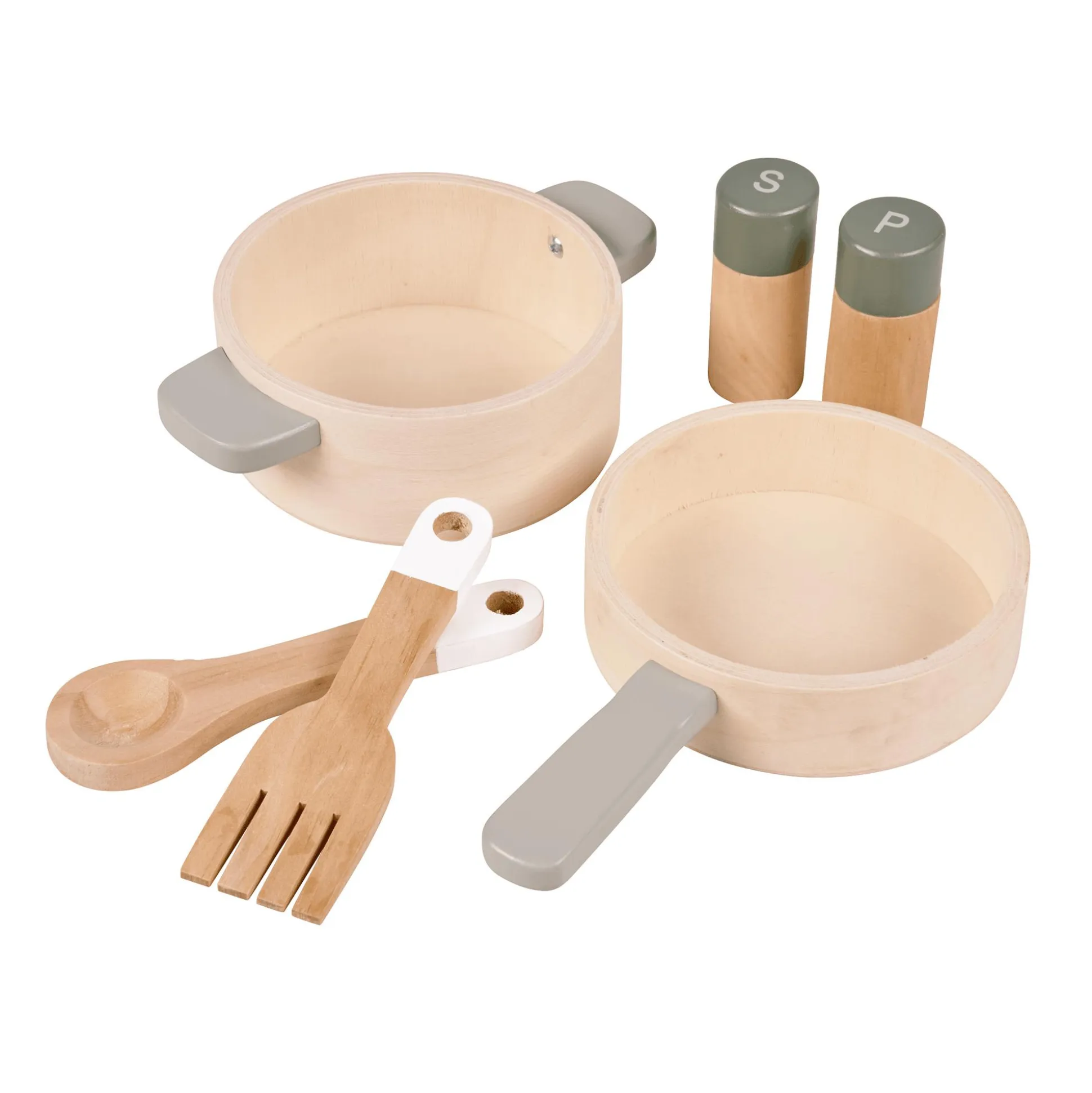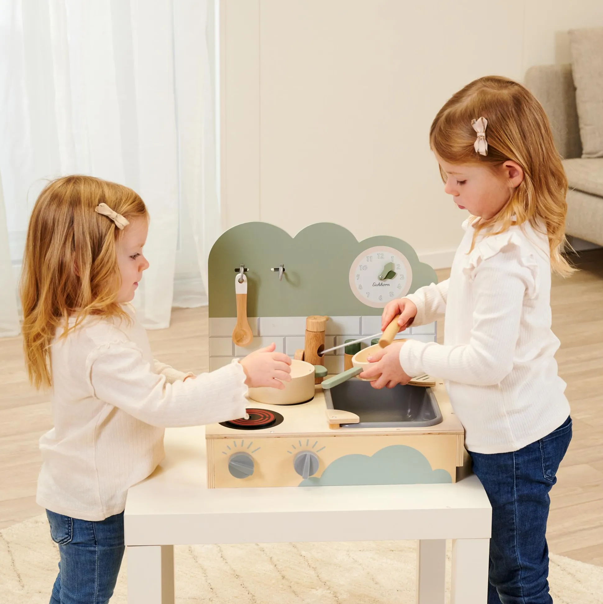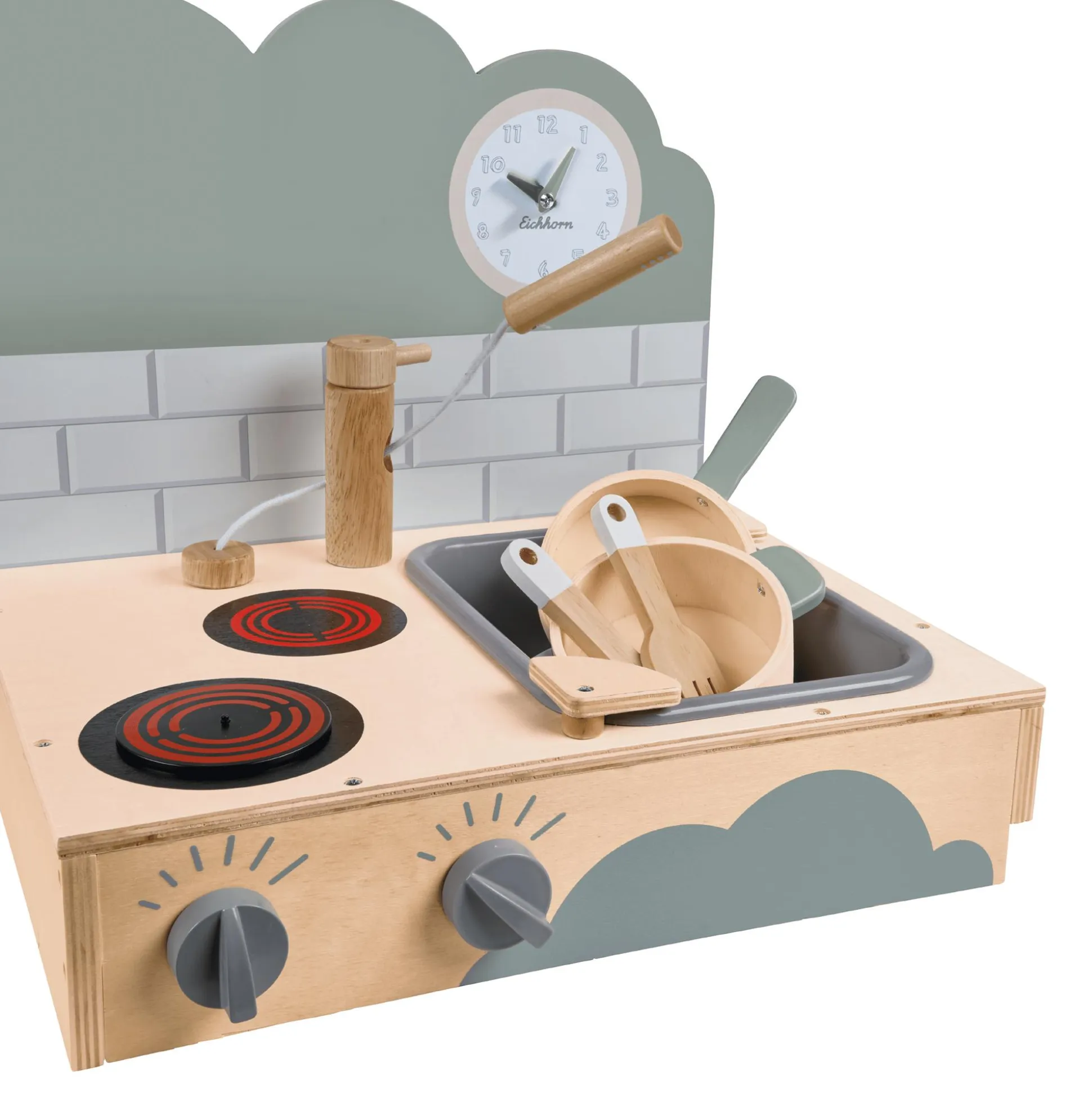 - Kochfeld mit Sound, Dreh-Knöpfe mit Klack-Funktion, Pfanne, Topf, Spülbecken mit Wasserhahn, Pfannenwender, Salz- und Pfefferstreuer, verstellbare Uhr