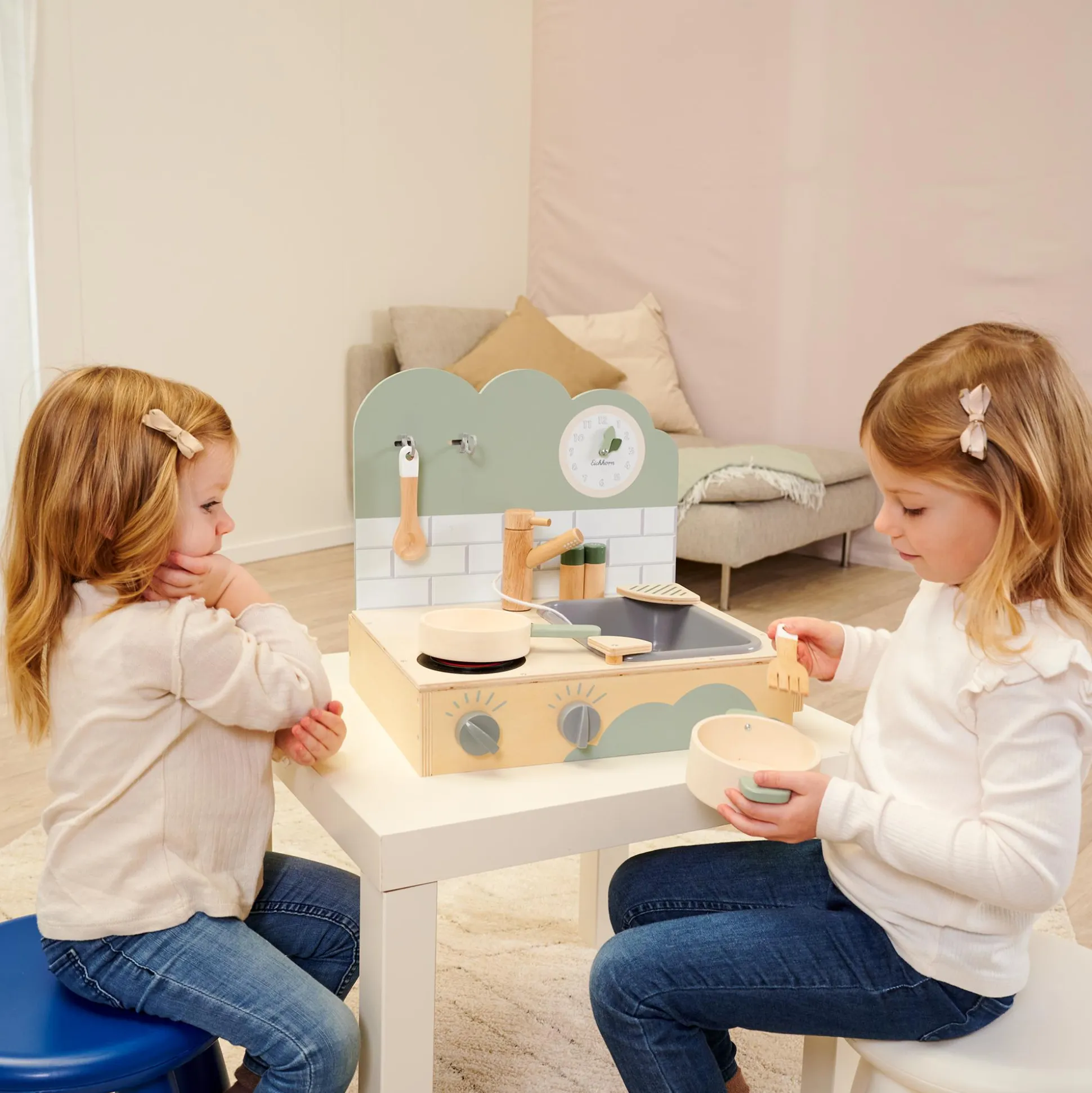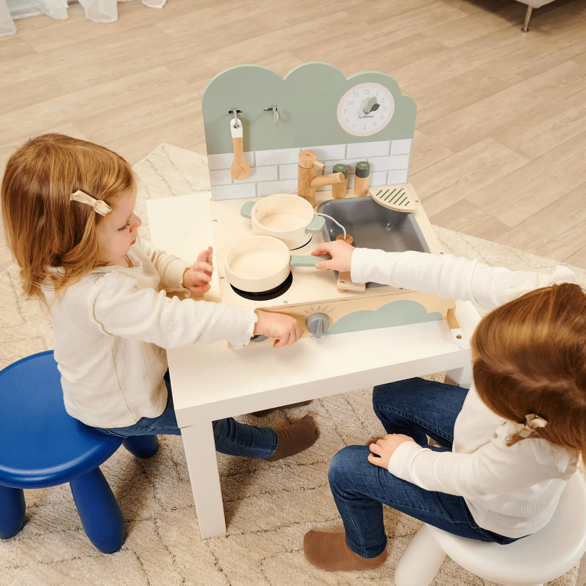 Die Eichhorn Tischküche ist der ideale Begleiter für dein Kind, um die kulinarische Welt zu entdecken! Diese kompakte Tischküche bietet ein Kochfeld mit realistischem Sound und drehbaren Knöpfen, die lustige Geräusche verursachen. Dein kleiner Nachwuchskoch oder Nachwuchsköchin kann sich an einer Pfanne und einem Topf ausprobieren, das Spülbecken mit Wasserhahn erkunden und mit dem Kochlöffel sowie dem Pfannenwender meisterhafte Gerichte zaubern. Salz- und Pfefferstreuer sorgen für den letzten Schliff, während die verstellbare Uhr die Zeit im Auge behält. Mit einer Größe von ca. 40 x 35 x 31 cm ist diese Spielküche perfekt auf die Bedürfnisse von Kindern ab ca. drei Jahren abgestimmt.