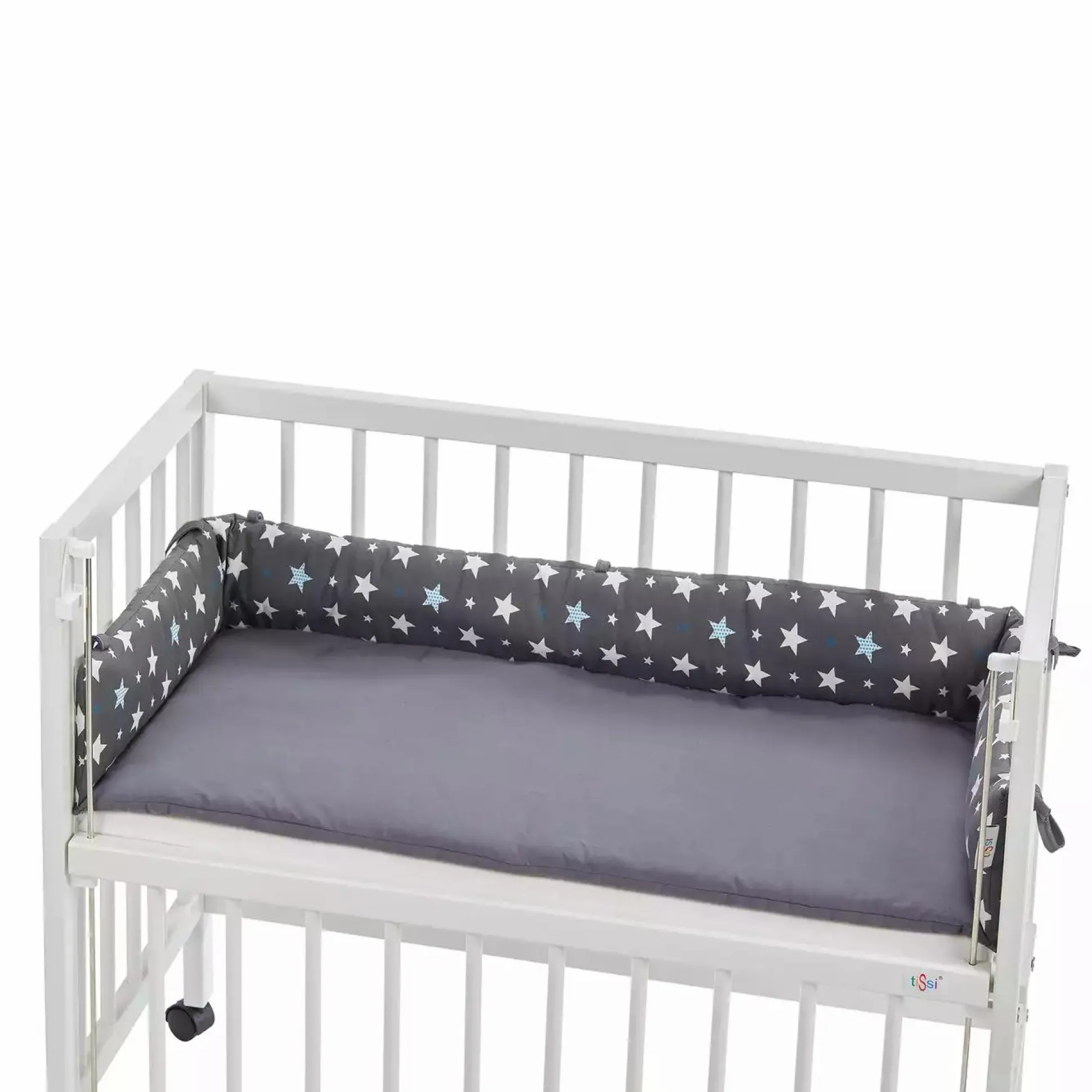 Das kuschelige Nestchen Sterne grau von tiSsi® sorgt im Beistellbettchen für Geborgenheit und Sicherheit. Die Liegefläche ist mit Polyester gefüllt sowie weich und bequem. Der Bezug ist aus natürlicher Baumwolle. Damit das Nestchen immer richtig liegt, wird es mit kleinen Bindebändchen an den Gitterstäben befestigt. Somit sind auch unruhige Schläfer immer geschützt. Sollte dabei mal ein kleines „Unglück“ passieren – kein Problem: Eventuelle Flecke verschwinden schnell wieder nach einem 30° C Waschgang in der Maschine.