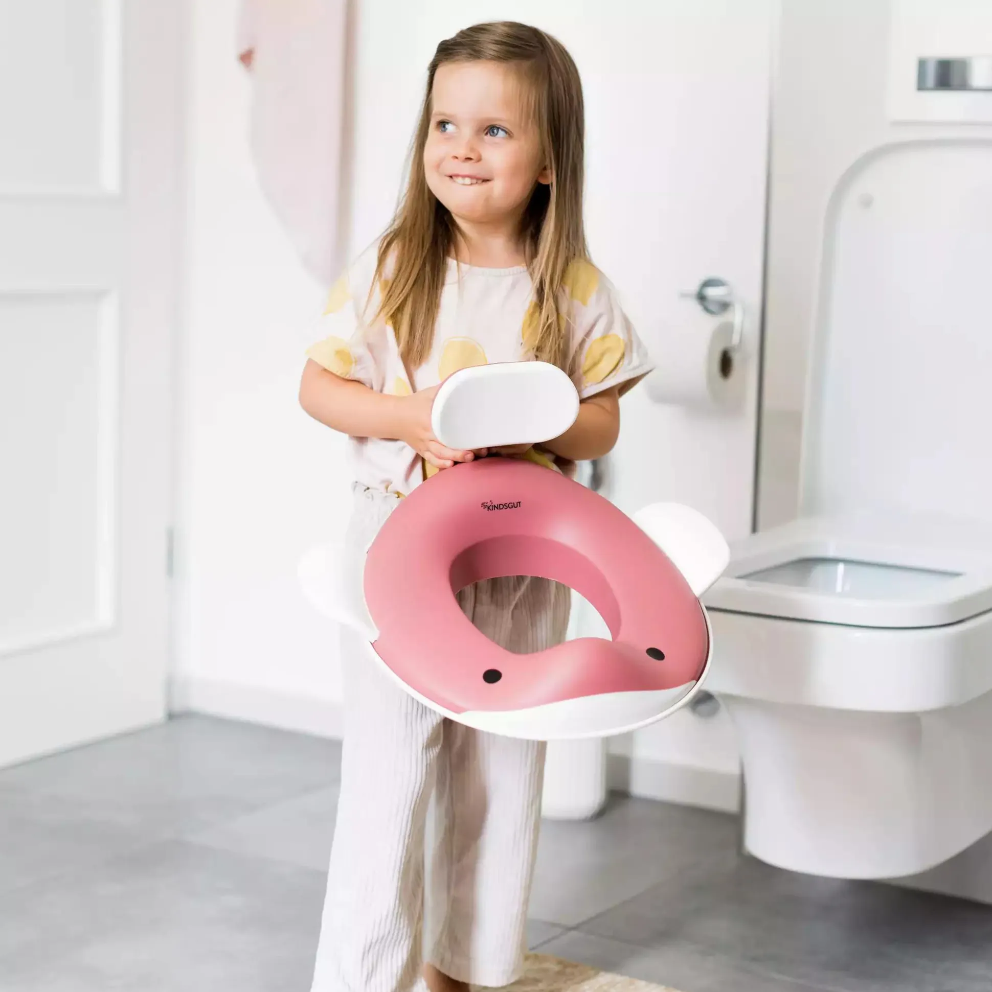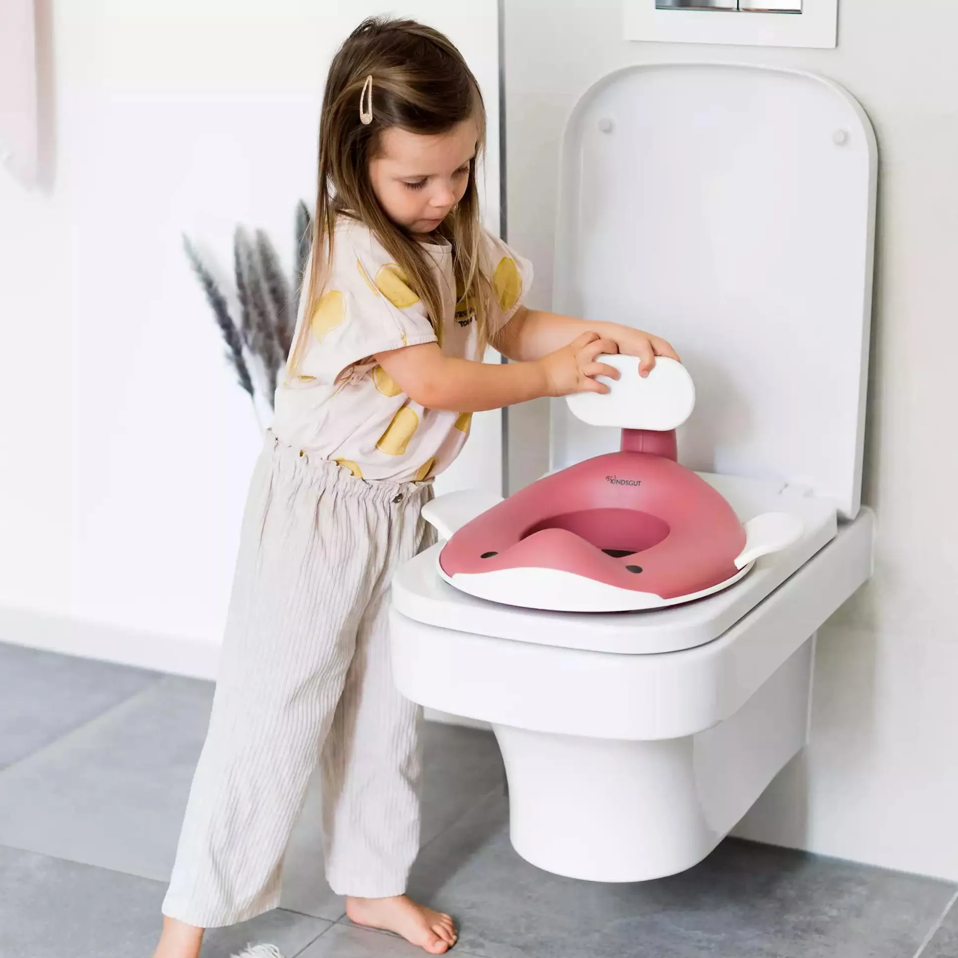 Endlich gibt es ein neues Familienmitglied in der Wal-Familie von Kindsgut! Nach dem der „Potty“, das Wal Töpfchen, zum beliebten Bestseller geworden ist, gibt es nun in ganz ähnlichem Look auch diesen Aufsatz für das WC. Dieser kann als Folgeprodukt, als Alternative oder parallel zu dem separat erhältlichen Potty verwendet werden – und sorgt garantiert für tierisch viel Spaß beim Toiletten-Training.
