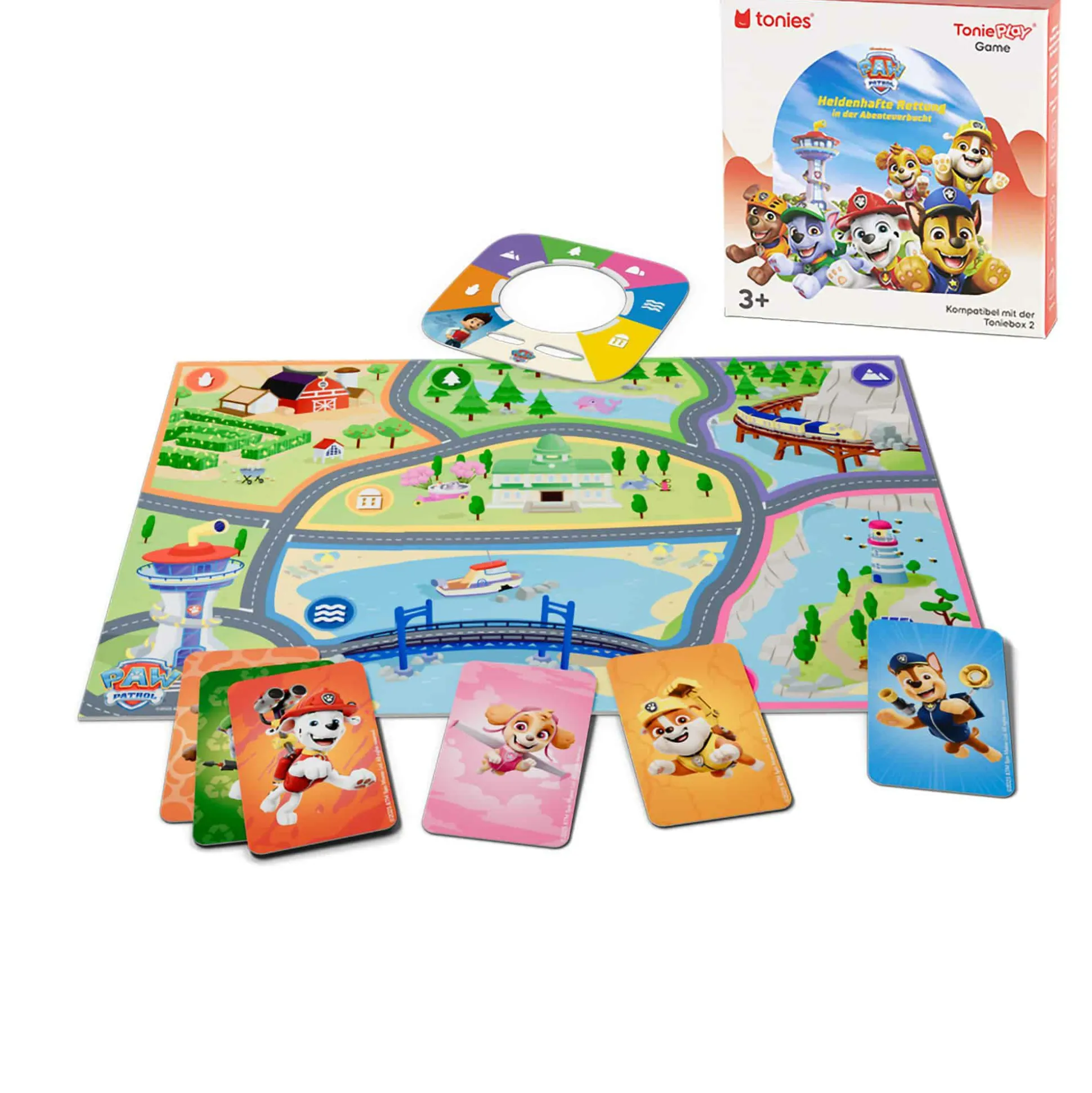 - 1 Tonieplay Game PAW Patrol – Heldenhafte Rettung in der Abenteuerbucht mit Tonieplay Disc, 6 Tonieplay Cards, 1 Karte von der Abenteuerbucht und 1 Spielanleitung