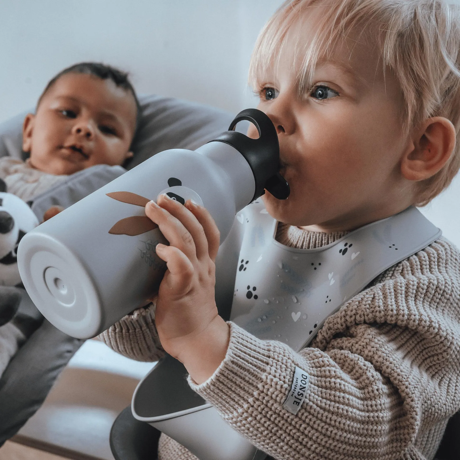Die Flasche ist frei von Schadstoffen und aus doppelwandigem Edelstahl gefertigt, der die Lieblingsgetränke von deinem kleinen Schatz bis zu 12 Stunden warm oder kalt hält. Sie wird mit zwei verschiedenen Deckeln geliefert, welche die Flasche hermetisch verschließen und somit einen Auslaufschutz garantieren. Beide Deckel sind mit einem praktischen Griff ausgestattet, der das Anbringen am Kinderwagen o. Ä. ermöglicht und das Tragen erleichtert.