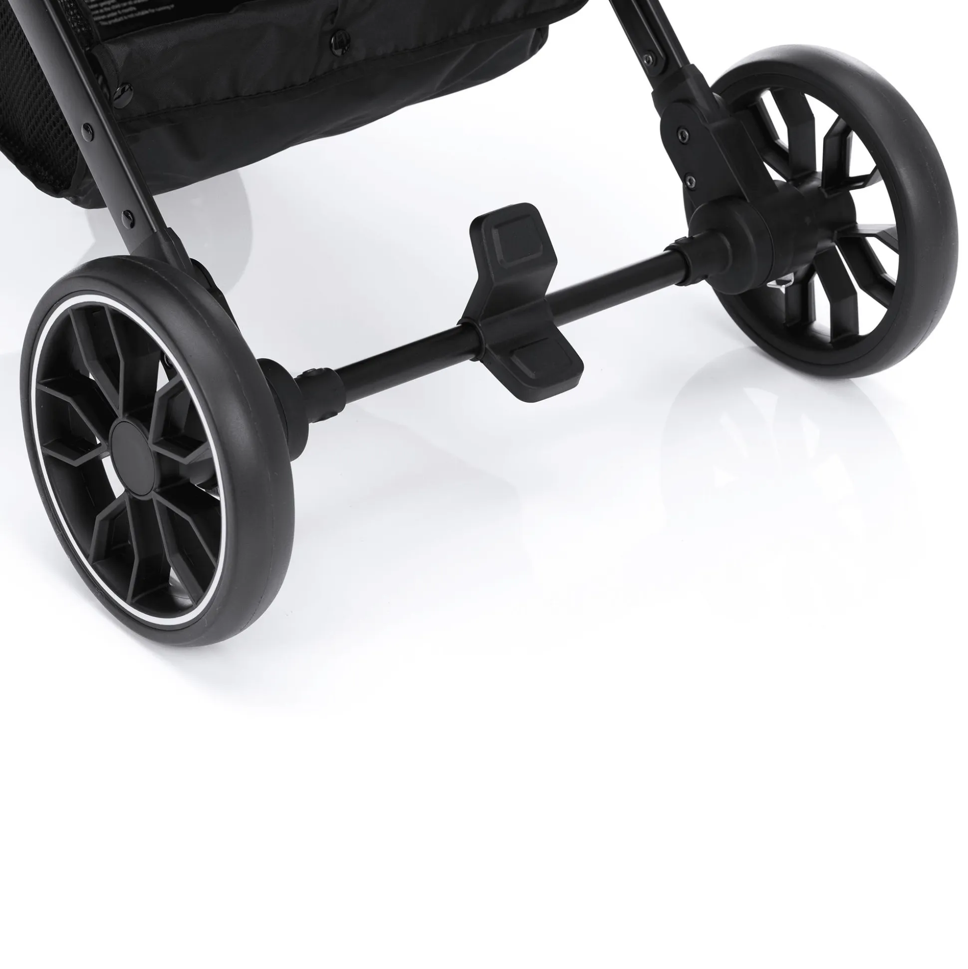Mit seinen gefederten und 360° schwenkbaren Vorderrädern sowie den großen Hinterrädern meistert er problemlos alle Untergründe. Die 2-fach verstellbare Fußstütze und die individuell einstellbare Rückenlehne passt sich den Bedürfnissen deines Nachwuchses ideal an. Sollte dein Kind während einer Spazierfahrt ein Nickerchen machen wollen, kannst du die Rückenlehne in die Liegeposition bringen und die Fußstütze in die oberste Position stellen – damit hat der kleine Passagier eine bequeme Liegefläche.