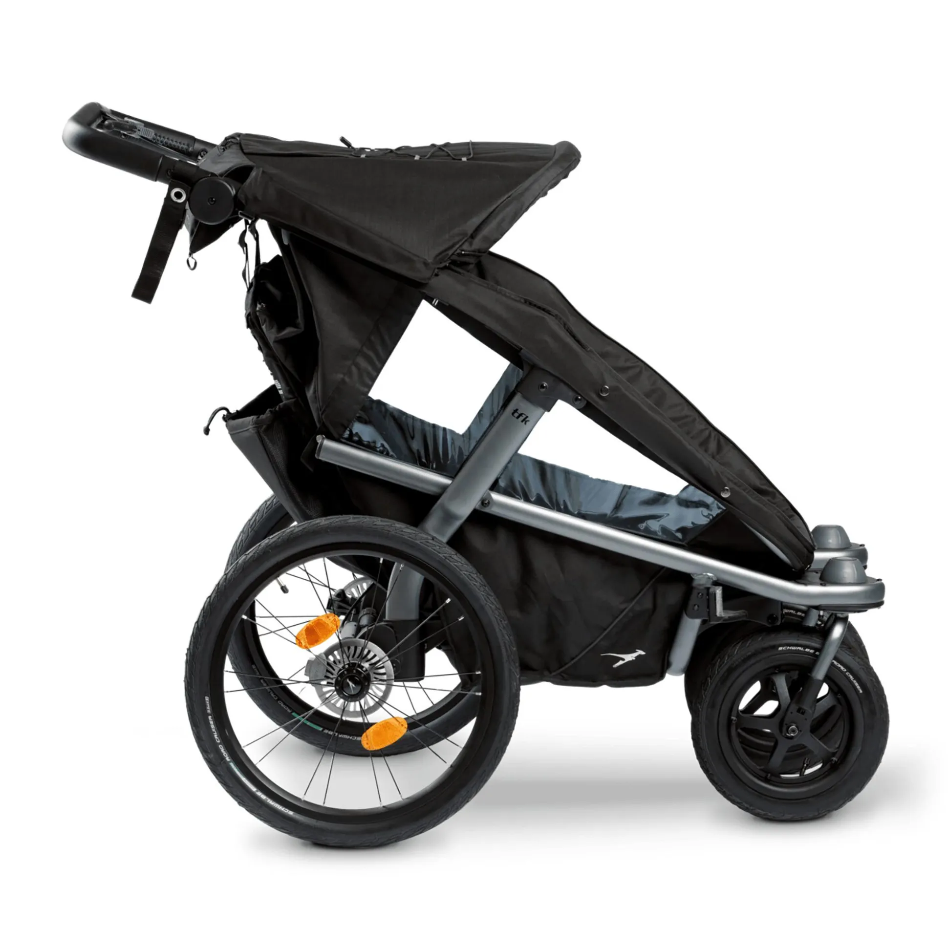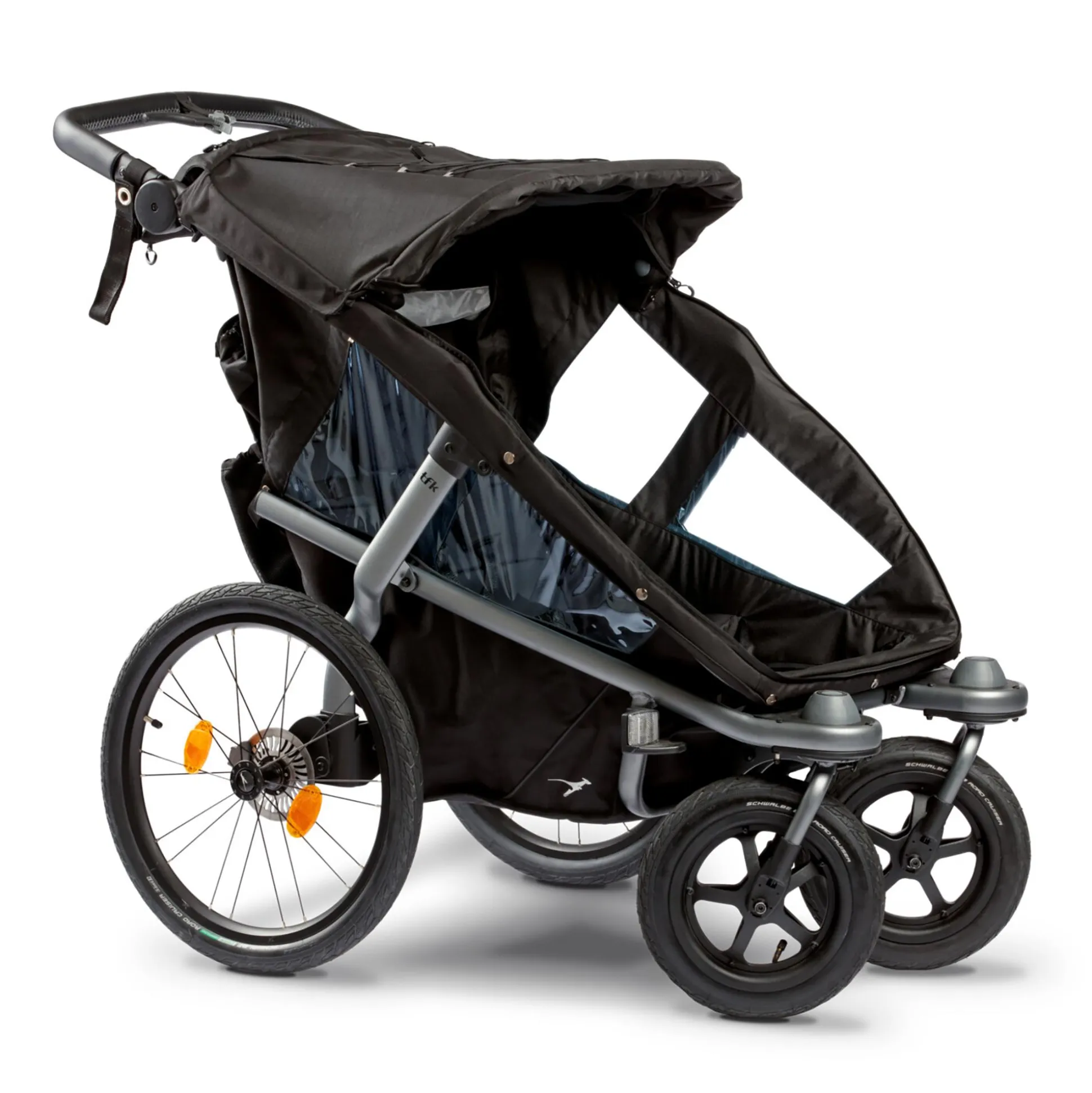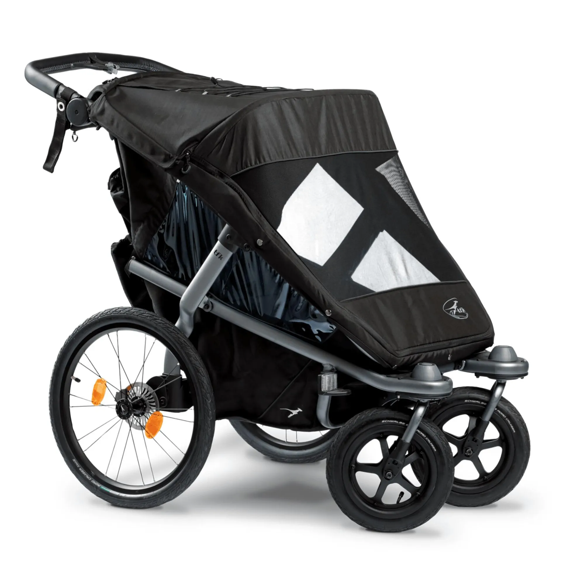 Der schwarze Velo 2 von tfk ist ein Kinderwagen und Fahrradanhänger in einem. Es ist genug Platz für zwei Kinder vorhanden und ein Sicherheitslicht, ein Insektenschutz, ein Wetterschutz sowie eine Fahne im tfk Design sind inklusive. Sicherheit, Ergonomie und Komfort stehen bei diesem Fahrradanhänger besonders im Fokus.