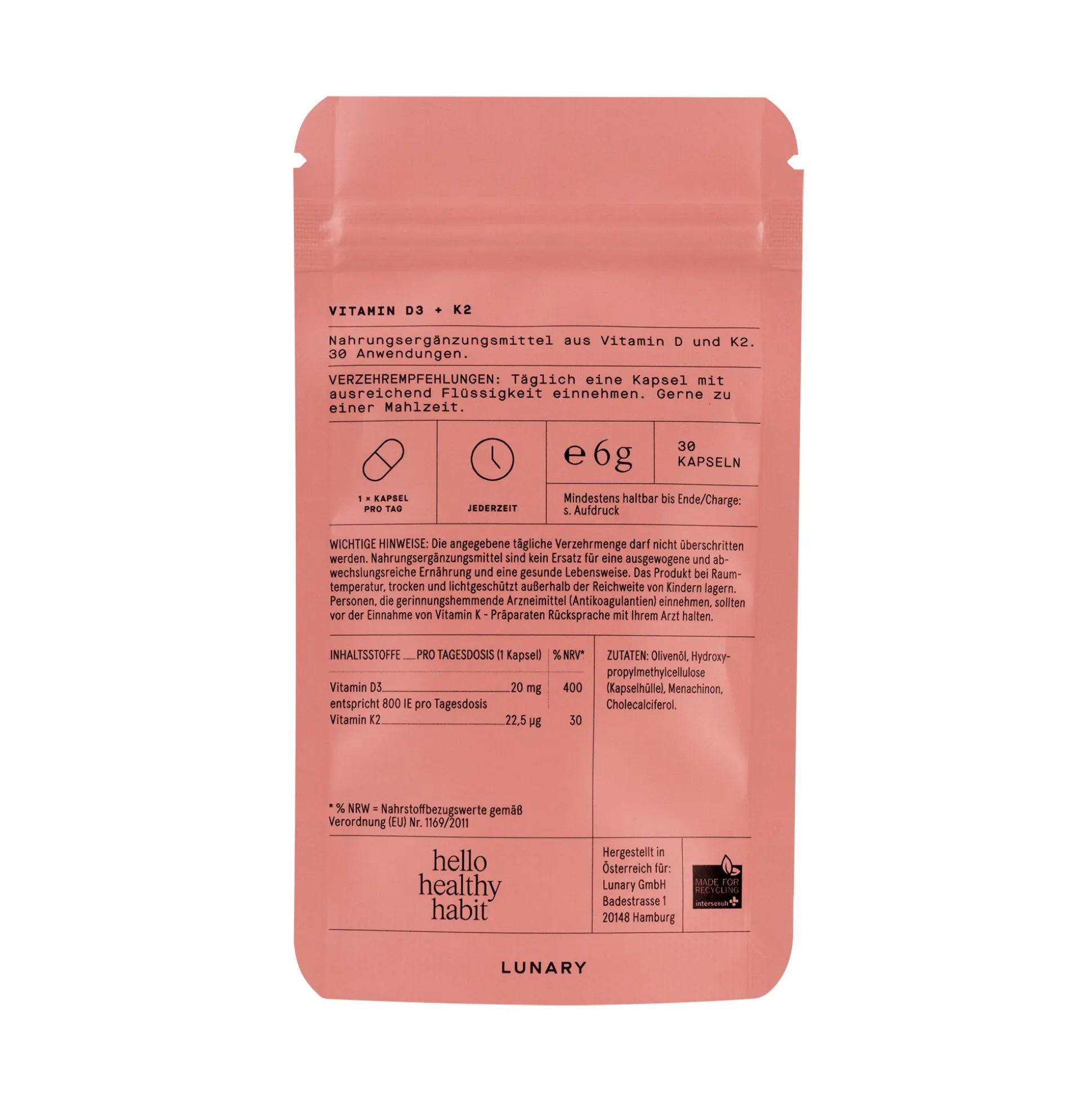 Jede Kapsel liefert dir ca. 800 IE (20 µg) Vitamin D3 und 22,5 µg Vitamin K2 . Und in Kombination mit K2 ist es noch effektiver: Während Vitamin D die Calciumaufnahme im Körper fördert, sorgt Vitamin K2 dafür, dass es optimal vom Körper aufgenommen und verarbeitet wird – ein starkes Duo für deine Gesundheit.
