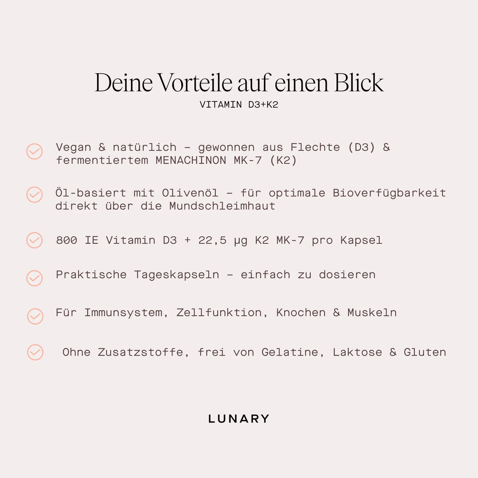 Mit dem Vitamin D3 + K2 MK7 von Lunary erhältst du eine kraftvolle Kombination, die dich Tag für Tag mit zwei essenziellen Nährstoffen versorgt – in einer einzigen, kleinen Kapsel. Perfekt dosiert und rein pflanzlich formuliert, unterstützt dich diese Komposition genau dort, wo dein Körper es braucht: für starke Knochen, gesunde Muskeln, ein aktives Immunsystem und eine optimale Calciumverwertung.
