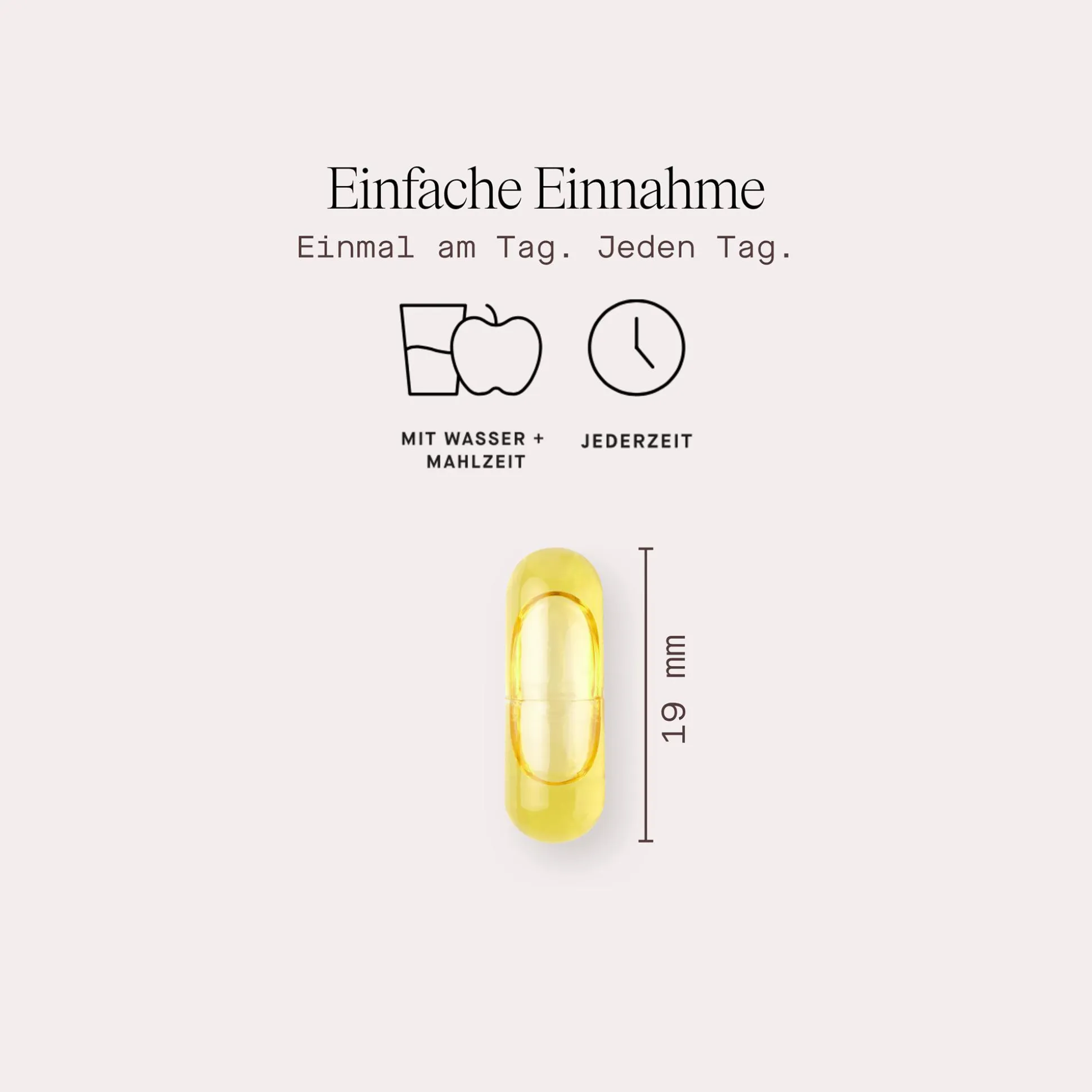 Die Einnahme ist ganz einfach: täglich 1 Kapsel, am besten morgens oder mittags mit einer fetthaltigen Mahlzeit wie Avocado, Nüssen oder etwas Öl. Vegan, ohne Zusatzstoffe und in praktischer Tagesdosis – für dein tägliches Wohlgefühl, von innen heraus gestärkt.
