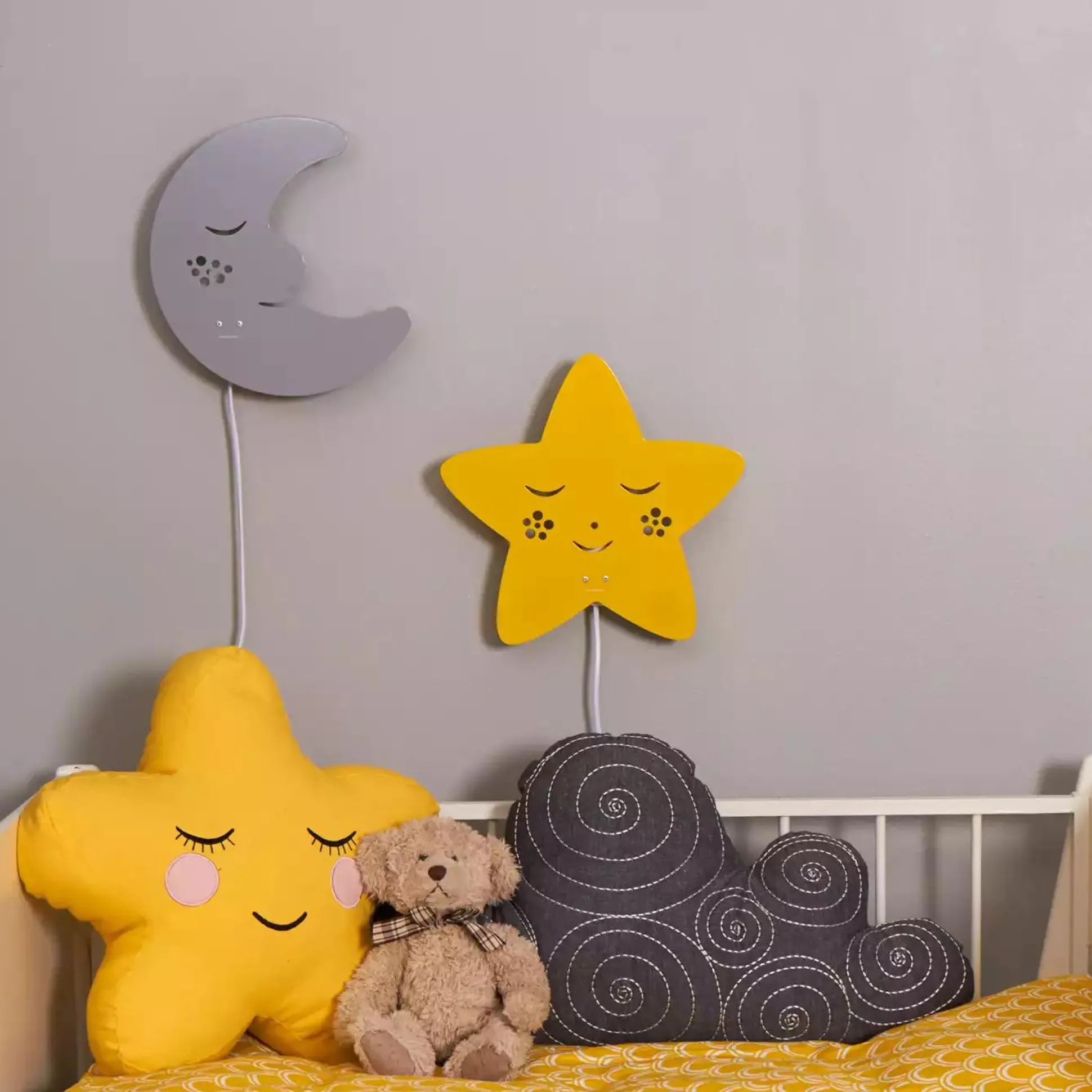 Diese Metall-Wandlampe von Roommate macht das Kinderzimmer noch gemütlicher. Der Mond ist mit kleinen Ausfräsungen versehen, dies sorgt für ein besonders schönes Licht und eine zauberhafte Silhouette. Du kannst die Lampe ganz einfach an der Wand montieren. Die Mond-Lampe ist mit einem ca. 1,5m langem Steckerkabel mit Wippschalter ausgestattet.