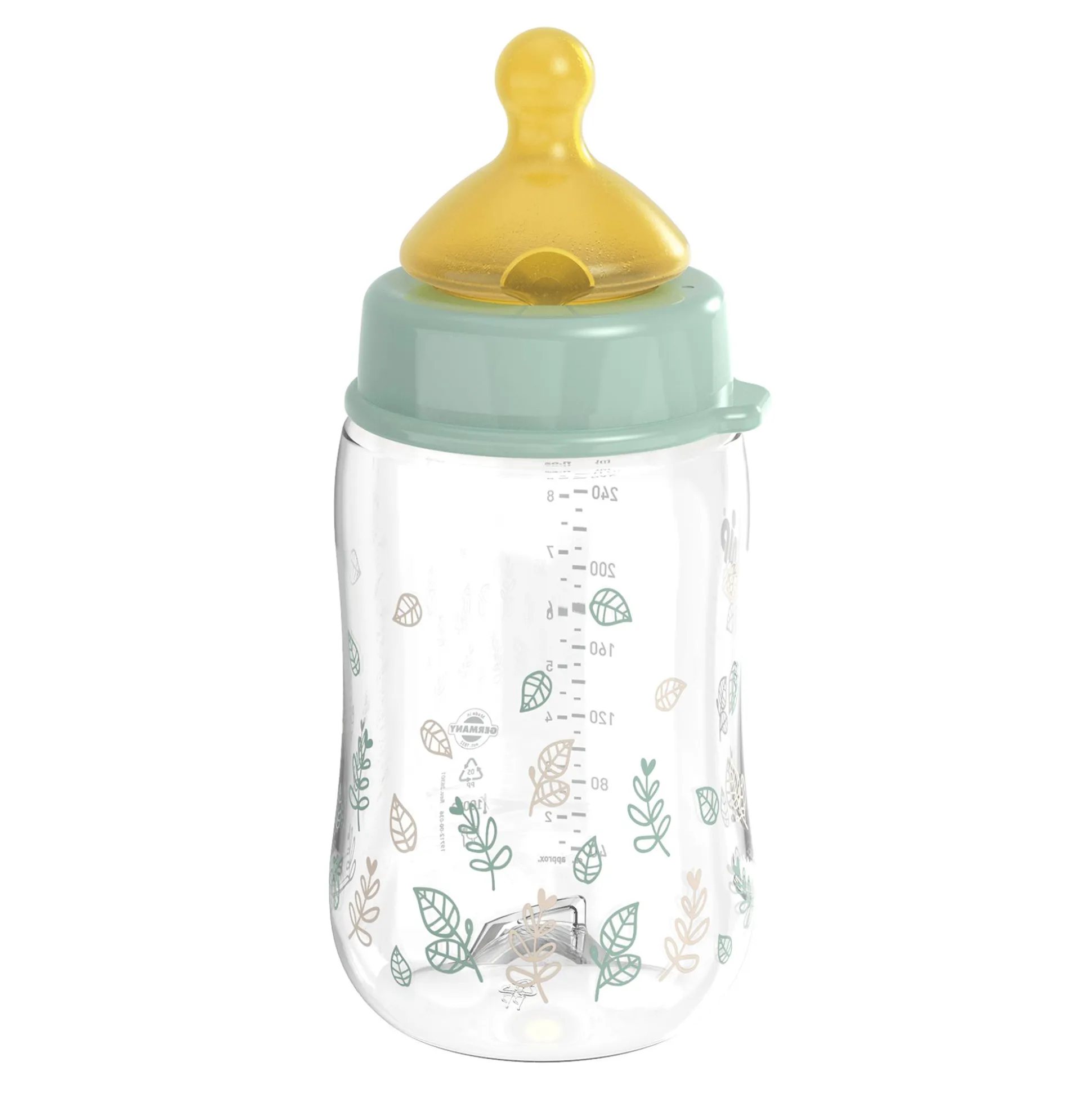 Die Kunststoffteile der Weithalsflasche wurden aus nachhaltigem Kunststoff, zertifiziert natürlicher Herkunft hergestellt. Die Flasche hat ein Fassungsvermögen von 260 ml und ist mit einem Trinksauger in Größe M ausgestattet. Dieser sorgt für einen mittleren Trinkfluss und ist bereits ab der Geburt geeignet. Eine zusätzliche Dichtscheibe verschließt sicher, für ein spritzfreies Schütteln und einen tropffreien Transport.