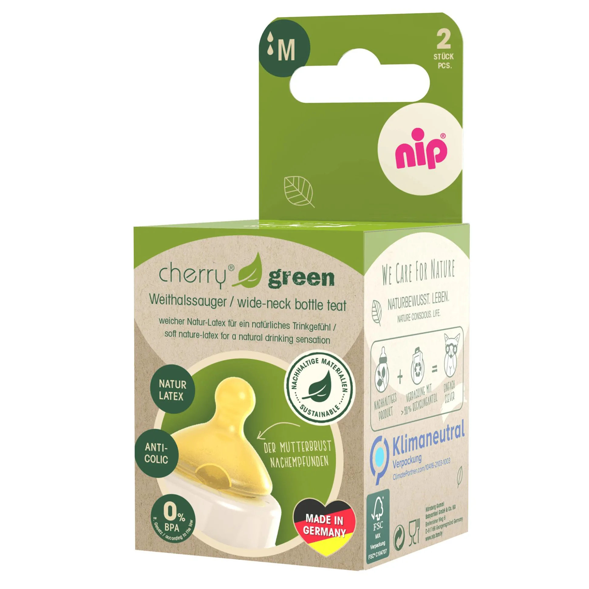 Der Weithalstrinksauger Cherry Green Gr.M von nip ist der Mutterbrust nachempfunden. Er hat eine natürliche runde Form, eine breite Lippenauflage, ein Anti-Kolik-Ventil und besteht aus weichem Natur Latex.