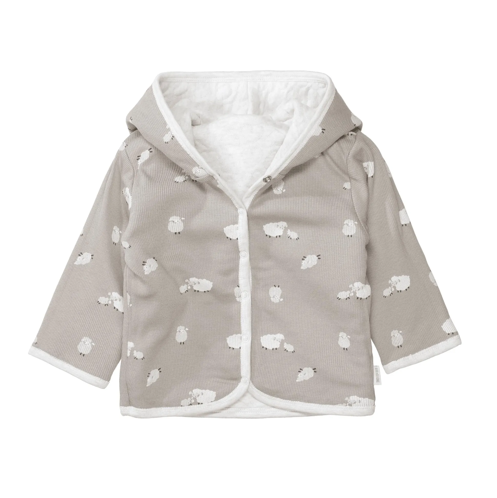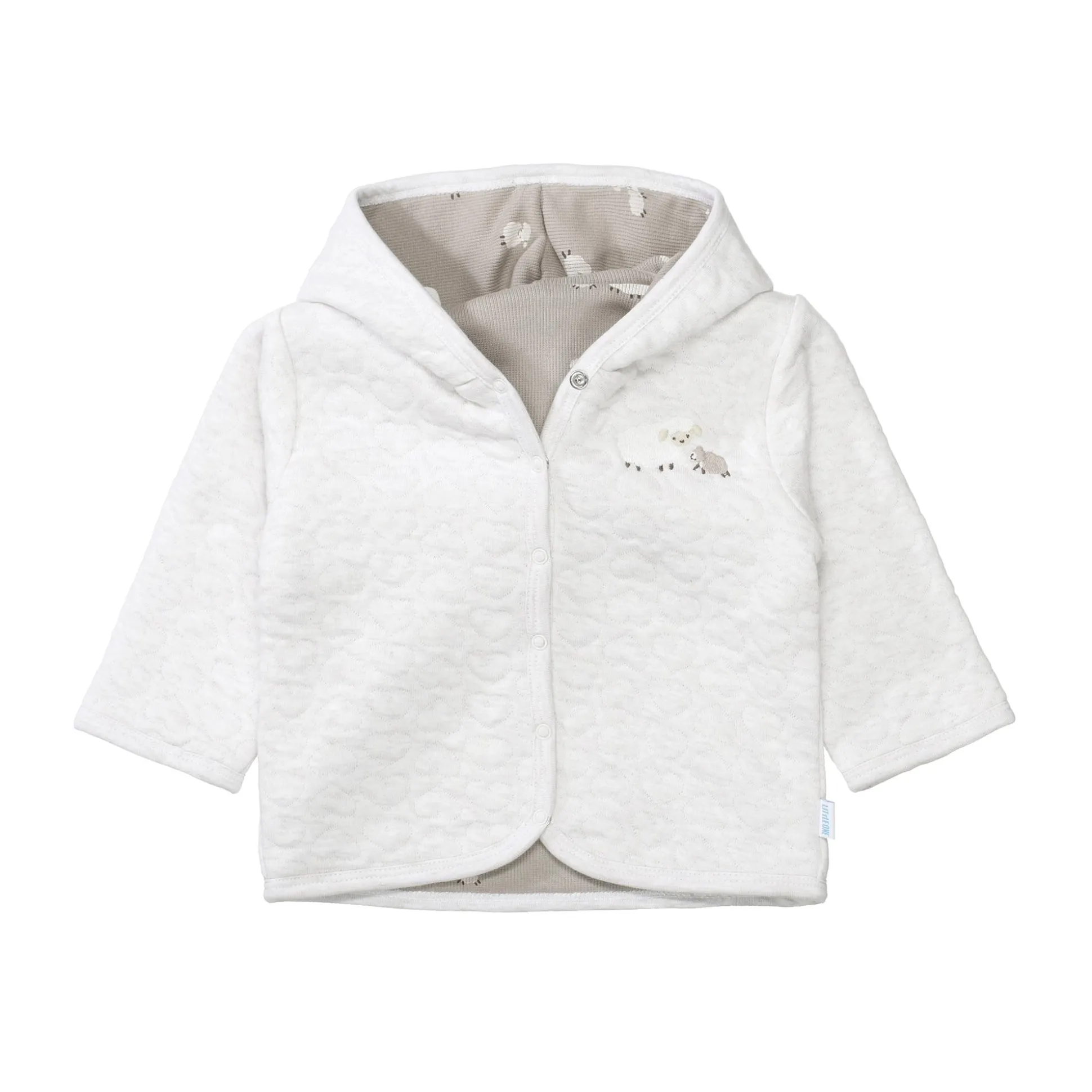 Die Wendejacke Schafe von LITTLE ONE vereint Funktionalität und liebevolles Design in einem kuscheligen Kleidungsstück für kühlere Tage. Außen zeigt sich die Jacke in schlichtem Cremeweiß mit einem Schafmotiv, innen begeistert ein fröhlicher Alloverprint mit kleinen Schafen. Aus 96% Bio-Baumwolle gefertigt und mit praktischen Druckknöpfen versehen, bietet sie deinem Schatz zwei Looks und höchsten Tragekomfort.
