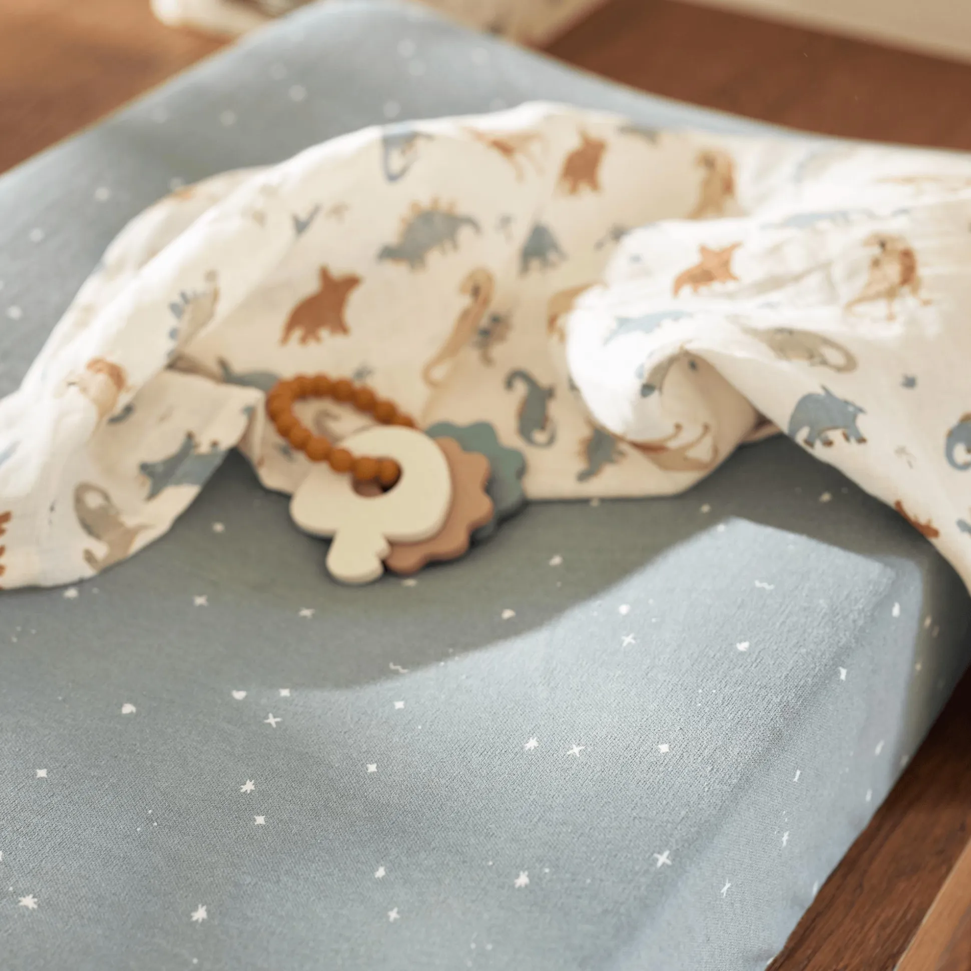 Der Wickelauflagenbezug von Jollein im Design Twinkling sea ist ein echter Hingucker auf der Wickelkommode. Er besteht zu 100% aus Baumwolle und der Gummizug an der Rückseite sorgt dafür, dass der Bezug auf dem Kissen an Ort und Stelle bleibt.