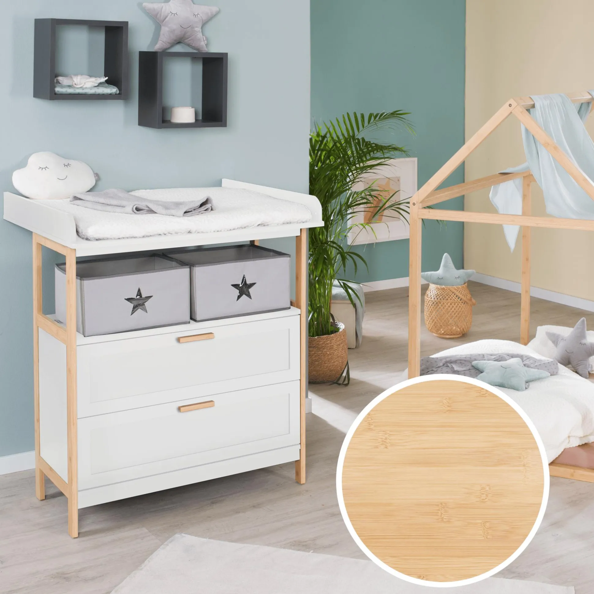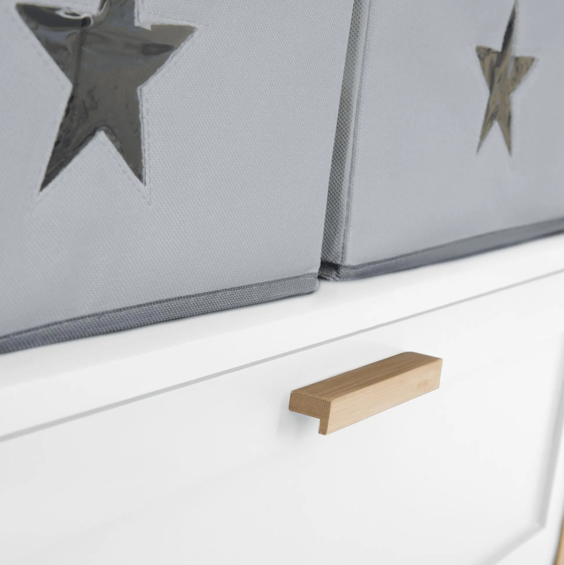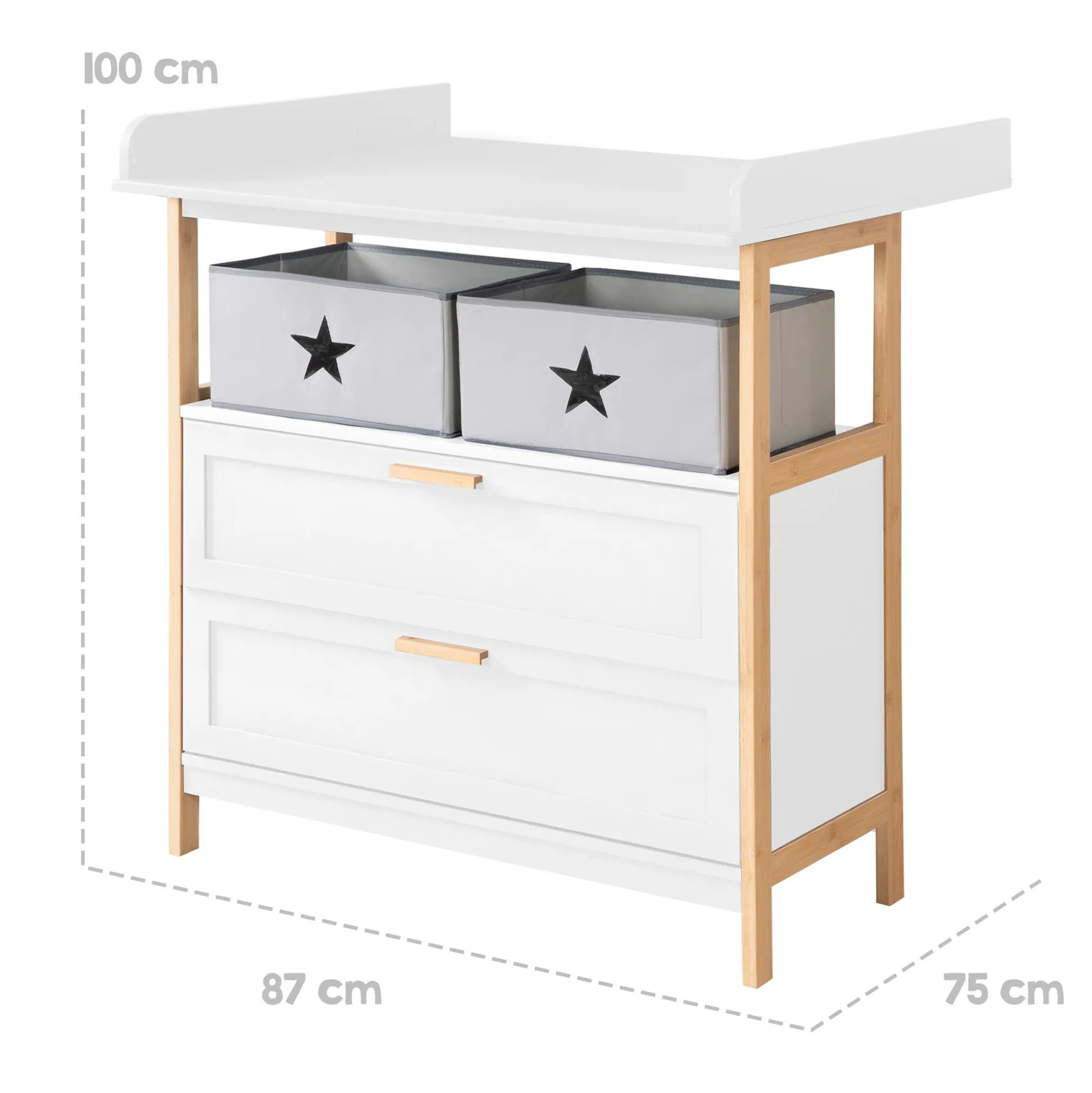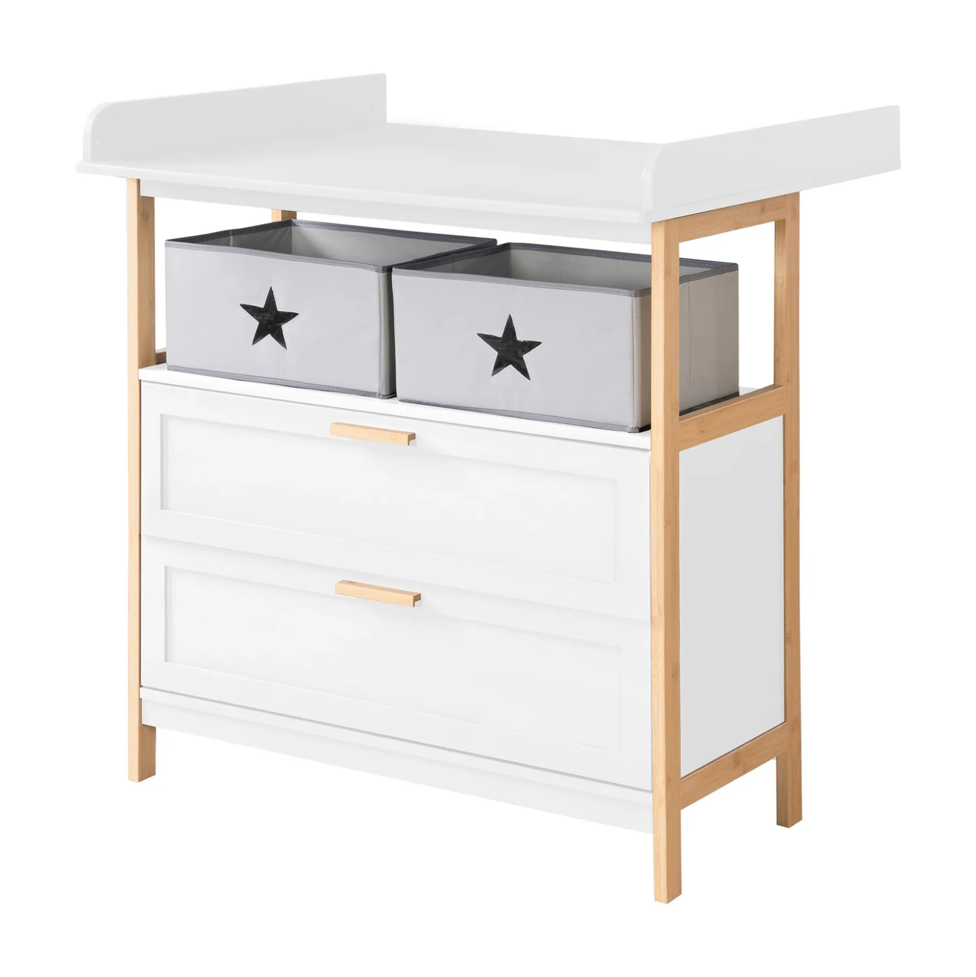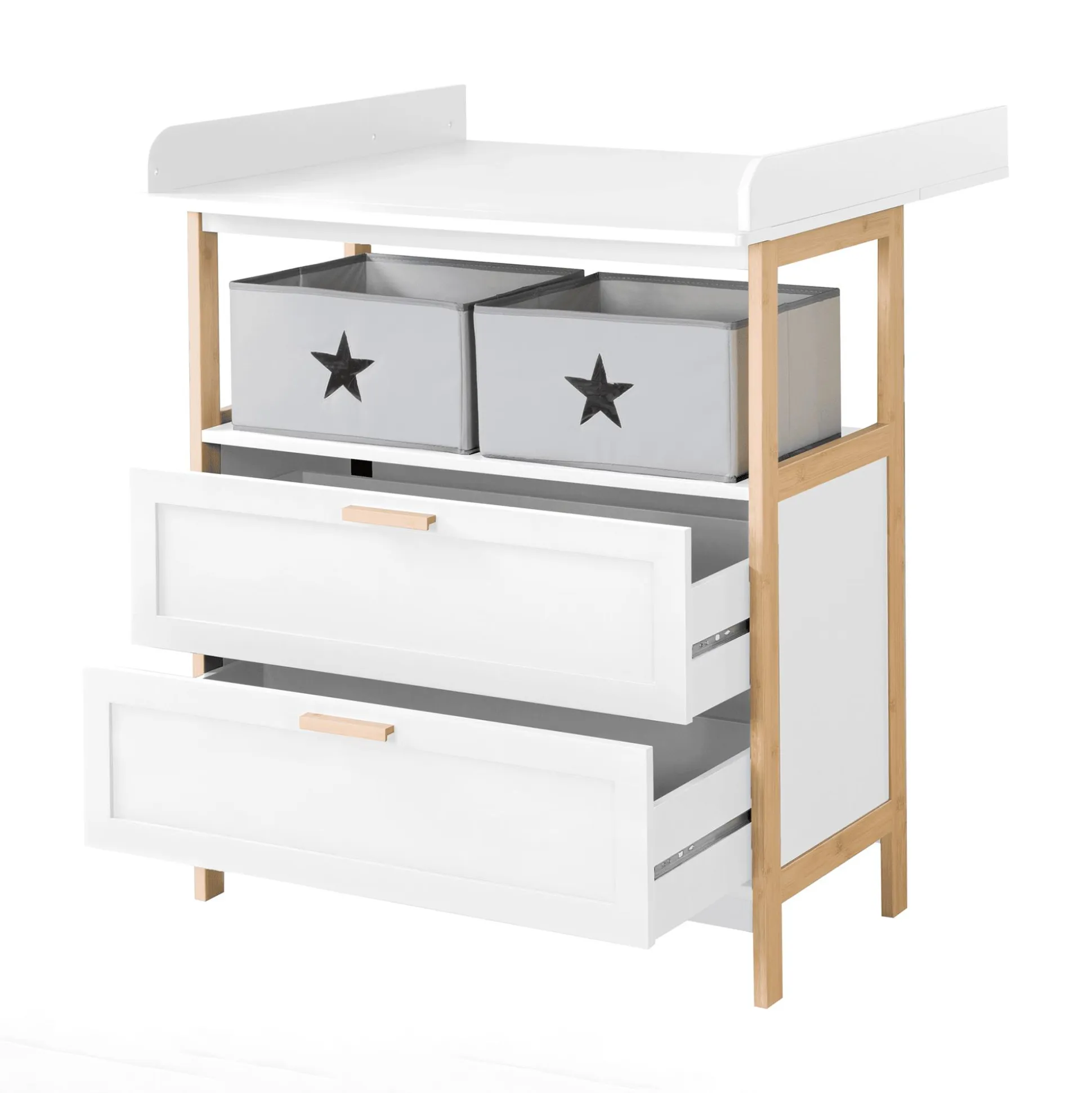 Das zeitgemäße Design in weißer Optik mit kontrastreichen Holzgriffen und Bambusfüßen verleiht der Kommode eine moderne Note. Sie bietet nicht nur eine stilvolle Ästhetik, sondern auch eine durchdachte Aufteilung mit zwei Schubladen, zwei hübschen Stoffboxen und einem offenen Fach.