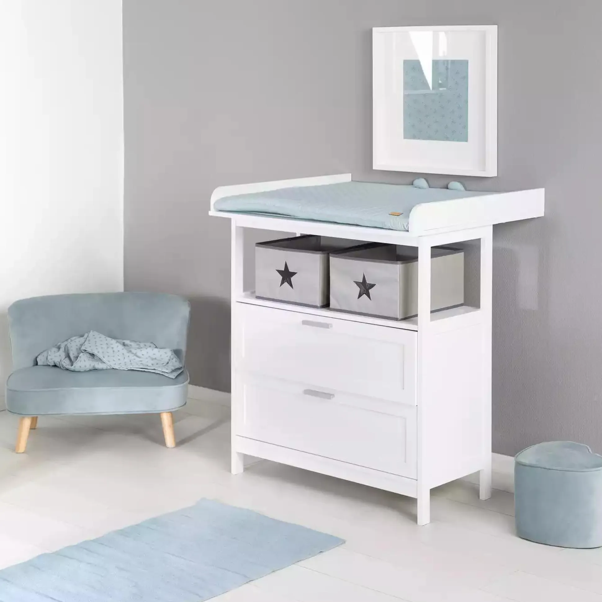 In den beiden Canvas Boxen ist im offenen Fach zwischen der Wickelfläche und den zwei Türen bei der Babypflege immer alles griffbereit. Hinter den beiden Türen mit modernen, silbernen Griffen bietet sich viel Stauraum für Wickelutensilien und Kleidungsstücke. Die Roba Wickelkommode ist ein wahres Multitalent und und leistet dir viele Jahre gute Dienste.