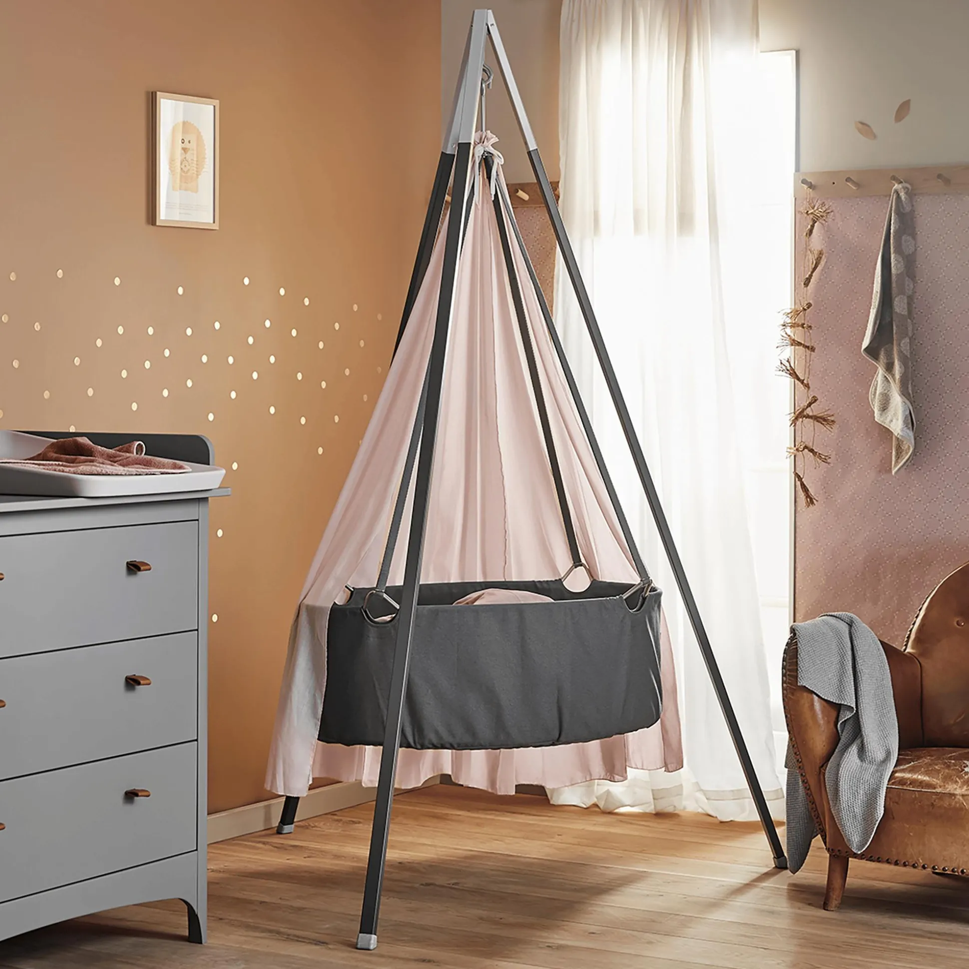 - separat erhältliches Zubehör: Dreibein-Gestell, lange Gurte (4er-Pack), Komfortmatratze, Matratzenauflage, Himmel, Baby Bettwäsche (70 x 100 cm), Laken (2er-Pack)