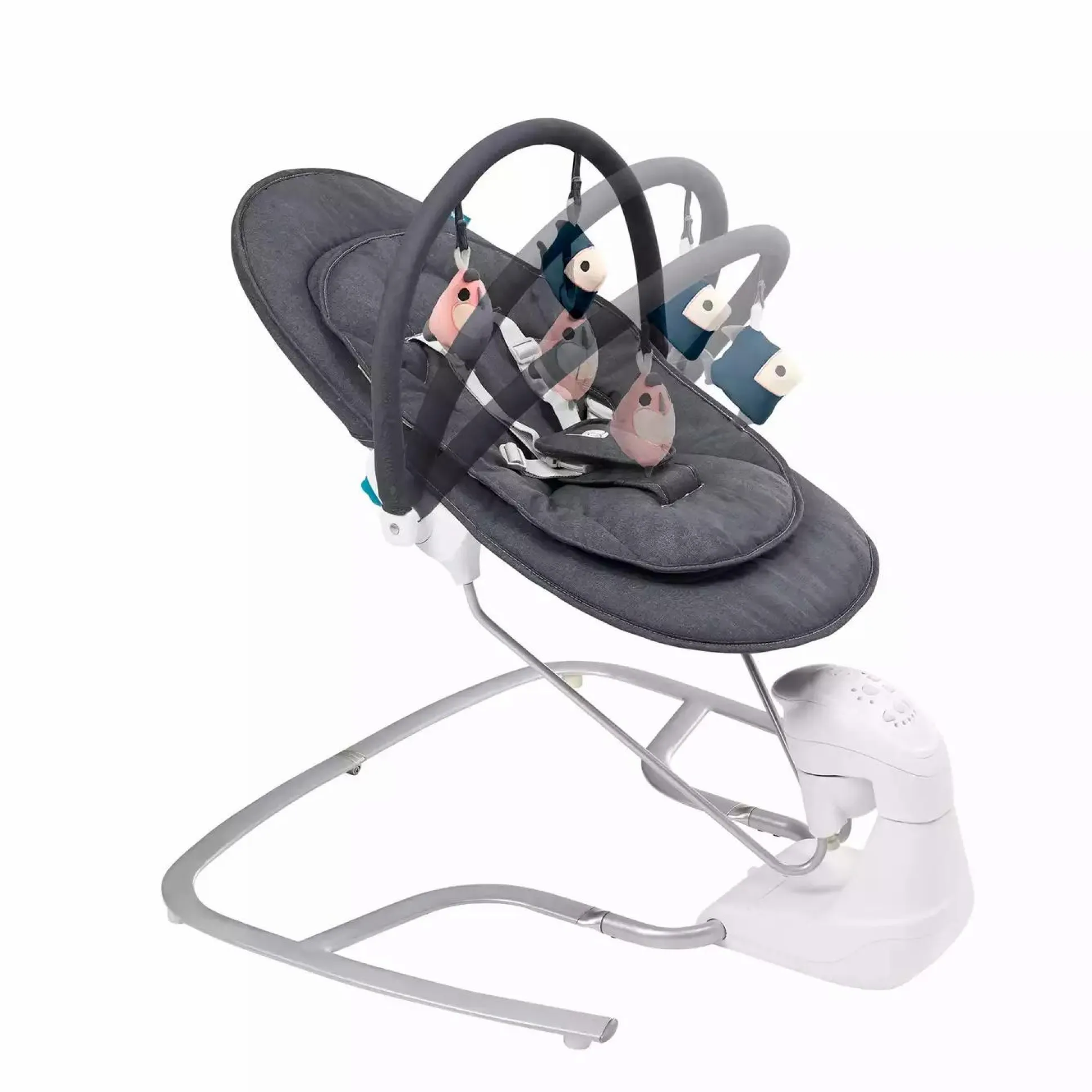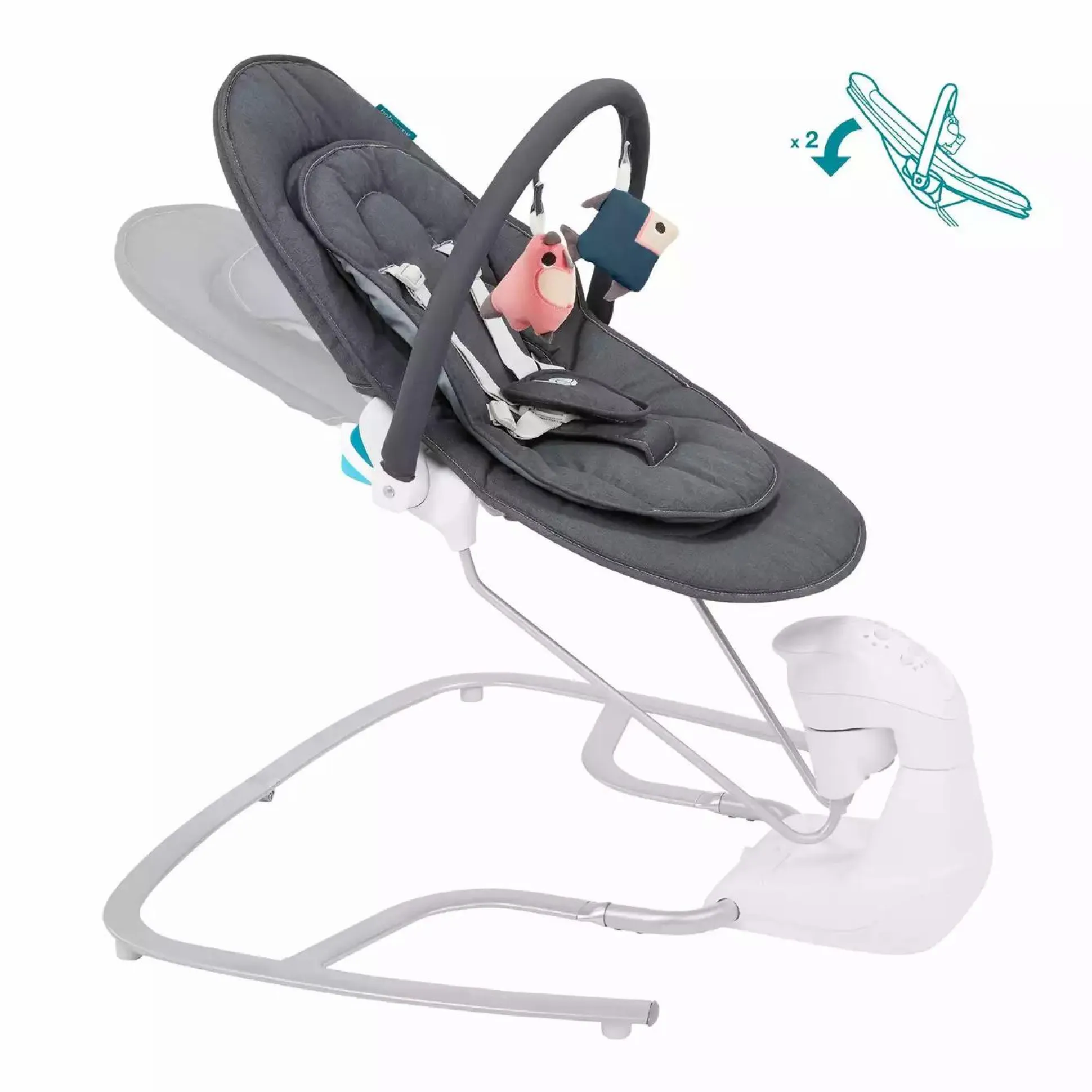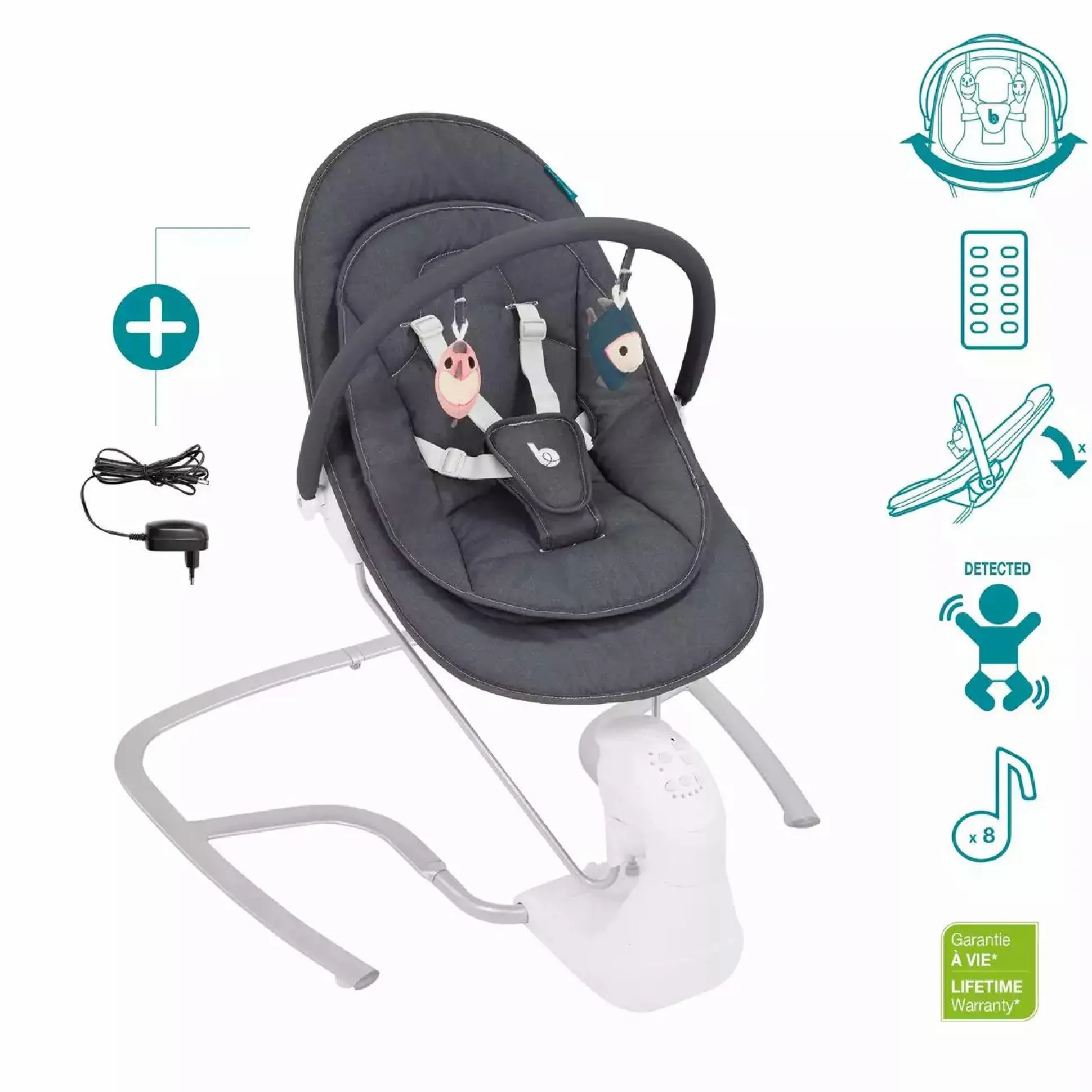 - Schaukelgeschwindigkeit, Timer, Bewegungsmelder & Schlaflieder können ferngesteuert werden